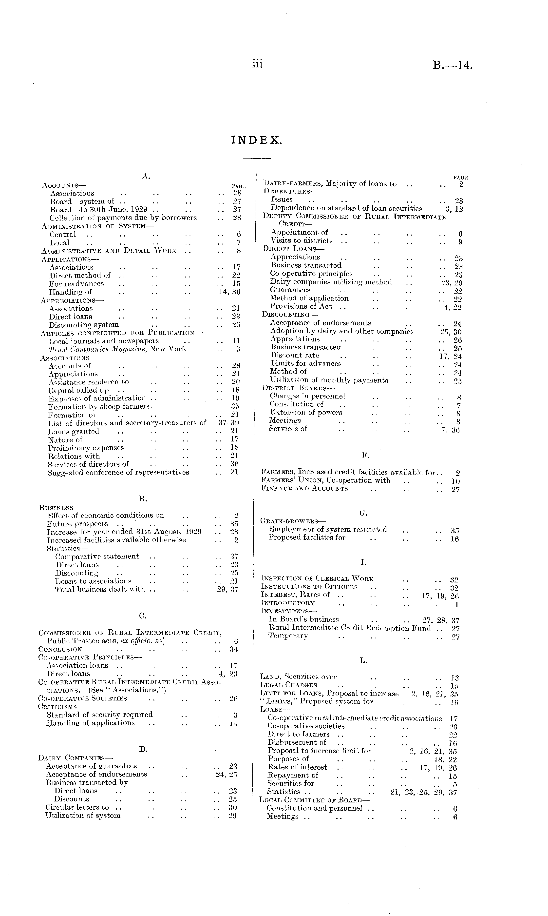 INDEX. A. ( PAGE Accounts i>aoe Dairy-farmers, Majority of loans to .. 2 Associations .. .. .. ..28 ! Debentures— Board —system of .. .. .. 27 Issues .. .. .. .. .. 28 B oar( j—to 30th June, 1929 .. .. .. 27 Dependence on standard of loan securities 3, 12 Collection of payments due by borrowers 28 Deputy Commissioner, of Rural Intermediate Administration of System— Credit— Central .. .. .. .. .. 6 Appointment of .. . . .. . . 6 Local .. .. .. .. 7 Visits to districts .. .. .. .. 9 Administrative and Detail Work .. .. 8 | Direct Loa.ns— Applications— j Appreciations .. .. .. 23 Associations .. .. .. ..17 j Business transacted .. .. ..23 Direct method of .. .. .. .. 22 j Co-operative principles .. .. .. 23 For readvances .. .. .. .. 15 Dairy companies utilizing method .. 23, 29 Handling of .. .. .. 14. 36 Guarantees .. ... .. .. 22 Appreciations— i Method of application . . .. .. 22 Associations .. .. .. ..21 j Provisions of Act .. .. .. 4,22 Direct loans 23 I Discounting— Discounting system .. .. .. 26 Acceptance of endorsements .. . . 24 Articles contributed for Publication— \ Adoption by dairy and other companies 25, 30 Local journals and newspapers .. ..11 i Appreciations .. .. .. ..26 Trust Companies Magazine, New York ~ 3 Business transacted .. .. 25 Associations— Discount rate .. .. .. 17,24 Accounts of .. .. .. .. 28 Limits for advances .. .. .. 24 Appreciations .. . . .. 21 Method of .. .. .. .. 24 Assistance rendered to .. .. .. 20 Utilization of monthly payments .. .. 25 Capital called up 18 District Boards— Expenses of administration .. .. ..19 Changes in personnel .. .. .. 8 Formation by sheep-farmers.. .. 35 Constitution of .. .. .. 7 Formation of 21 Extension of powers 8 List of directors and secretary-treasurers of 37-39 Meetings .. .. .. .. 8 Loans granted .. .. .. .. 21 j Services of .. .. .. 7, 36 Nature of .. • . .. 17 Preliminary expenses . . .. ..18 Relations with .. . . . . .. 21 F. Services of directors of .. .. 36 Suggested conference of representatives .. 21 Farmers, Increased credit facilities available for.. 2 Farmers' Union, Co-operation with .. .. 10 Finance and Accounts .. .. .. 27 B. Business — Effect of economic conditions on 2 "• Future prospects .. .. .. .. 35 Grain-growers— Increase for year ended 31st August, 1929 .. 28 Employment of system restricted .. ..35 Increased facilities available otherwise .. 2 Proposed facilities for .. .. ...16 Statistics — Comparative statement ...... 37 Direct loans .. .. .. 23 '' Discounting .. .. .. .. 25 r _ Loans to associations .. .. .. 21 j nspe ction of Clerical Work .. .. 32 Total business dealt with .. .. 29, 37 Instructions to Officers .. .. .. 32 Interest, Rates of .. .. .. 17, 19 ; 26 Introductory .. .. .. ~ j Investments — In Board's business .. .. 27, 28 37 _ ~ „ Rural Intermediate Credit Redemption Fund .. 27 Commissioner of Rural Intermediate Credit, J Temporary 97 Public Trustee acts, ex officio, as] .. .. 6 '' *' '' • • -7 Conclusion .. .. .. .. 34 Co-operative Principles— j j Association loans .. .. .. ..17 Direct loans .. .. .. 4, 23 i Land, Securities over .. .. 13 Co-operative Rural Intermediate Credit Asso- i Legal Charges '' jr ciations. (See Associations. ) Limit for Loans, Proposal to increase 2, 16, 21, 35 Co-operative Societies .. .. ..26 " Limits, " Proposed system for .. 16 Criticisms- _ Loans— Standard of security required .. 3 Co-operative rural intermediate credit associations 17 Handling of applications i 4 Co-operative societies 26 Direct to farmers .. .. .. 22 Disbursement of .. .. .. 16 D. Proposal to increase limit for 2, 16. 21, 35 Dairy Companies— Purposes of .. .. .. 18j 22 Acceptance of guarantees .. .. .23 Rates of interest .. .. .. 17, 19' 26 Acceptance of endorsements .. 24, 25 Repayment of .. .. .. ..15 Business transacted by— Securities for .. .. .. 5 Direct loans .. .. .. ..23 Statistics .. .. .. 21, 23, 25, 29, 37 Discounts .. .. . . .. 25 Local Committee of Board — Circular letters to .. .. .. 30 Constitution and personnel .. .. . , 6 Utilization of system .. . . .. 29 Meetings .. .. .. .. 0