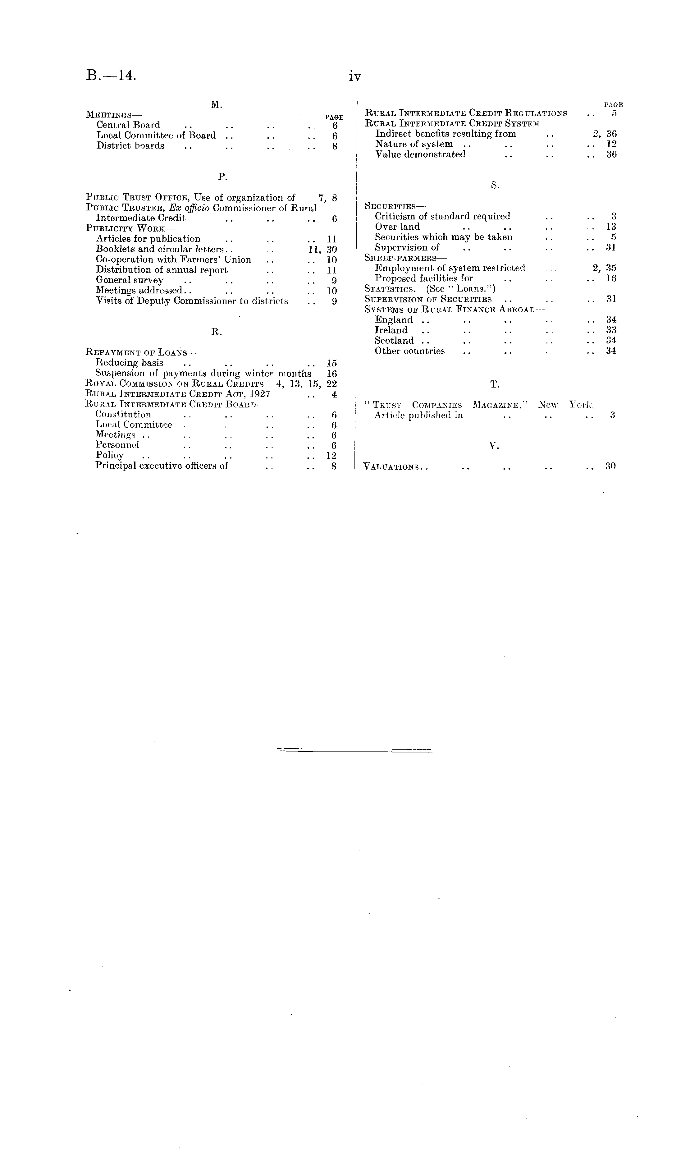 M. PAGE Meetings— page Rural Intermediate Credit Regulations .. 5 Central Board .. .. .. .. 6 Rural Intermediate Credit System-— Local Committee of Board .. .. 6 Indirect benefits resulting from .. 2, 36 District boards .. .. .. .. 8 Nature of system .. .. .. .. 12 Value demonstrated .. .. .. 36 P. 8. Public Trust Office, Use of organization of 7, 8 Public Trustee, Ex officio Commissioner of Rural Securities— Intermediate Credit .. .. 6 Criticism of standard required .. 3 Publicity Work— Over land .. .. . . .13 Articles for publication .. .. ..11 Securities which may be taken .. ..5 Booklets and circular letters.. .. 11, 30 Supervision of .. .. .. ..31 Co-operation with Farmers' Union .. 10 Sheep-farmers— Distribution of annual report .. ..11 Employment of system restricted 2,35 General survey .. .. .. 9 Proposed facilities for .. . .. 16 Meetings addressed.. .. .. ..10 Statistics. (See " Loans.") Visits of Deputy Commissioner to districts . . 9 Supervision of Securities .. .. .. 31 Systems of Rural Finance Abroae— England .. .. .. 34 R. Ireland .. .. .. .. .. 33 Scotland .. .. .. .. .. 34 Repayment of Loans— Other countries .. .. . . .. 34 Reducing basis .. .. .. 15 Suspension of payments during winter months 16 Royal Commission on Rural Credits 4, 13, 15, 22 T. Rural Intermediate Credit Act, 1927 .. 4 Rural Intermediate Credit Board— "Trust Companies Magazine," New York, Constitution .. .. .. 6 Article published in .. .. 3 Local Committee .. . . .. 6 Meetings .. .. .. .. 6 Personnel . . .. .. 6 V. Policy .. .. .. .. 12 Principal executive officers of . . 8 ! Valuations .. .. .. .. .. 30