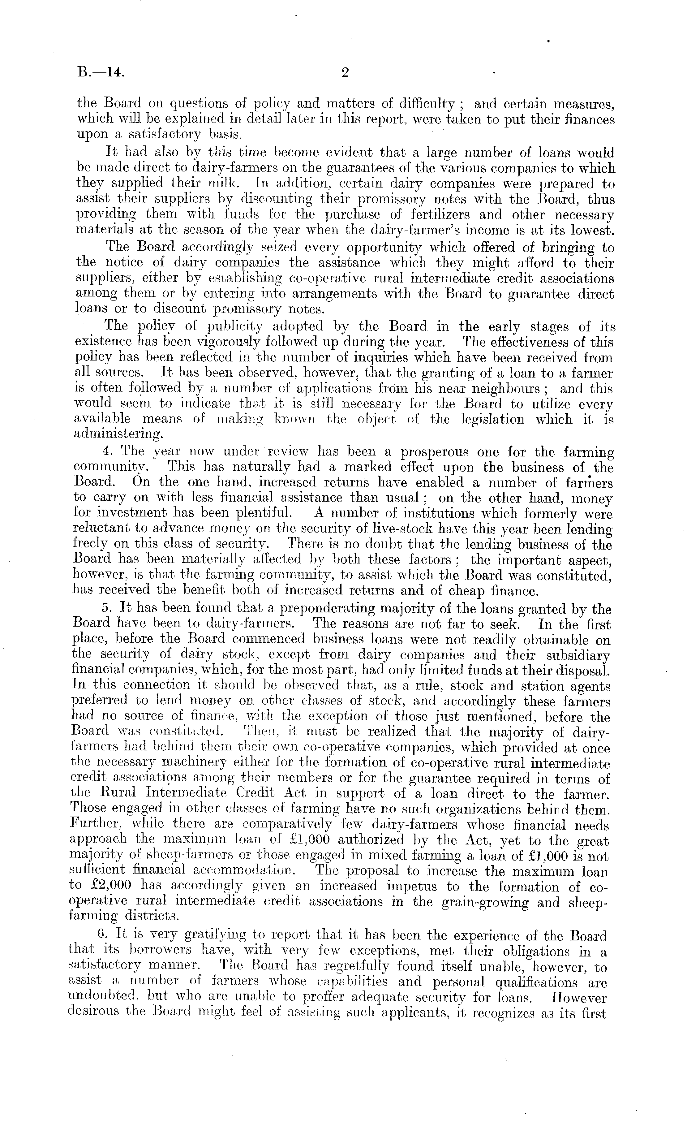 the Board 011 questions of policy and matters of difficulty ; and certain measures, wliich will be explained in detail later in this report, were taken to put their finances upon a satisfactory basis. It had also by this time become evident that a large number of loans would be made direct to dairy-farmers on the guarantees of the various companies to which they supplied their milk. In addition, certain dairy companies were prepared to assist their suppliers by discounting their promissory notes with the Board, thus providing them with funds for the purchase of fertilizers and other necessary materials at the season of the year when the dairy-farmer's income is at its lowest. The Board accordingly seized every opportunity which offered of bringing to the notice of dairy companies the assistance which they might afford to their suppliers, either by establishing co-operative rural intermediate credit associations among them or by entering into arrangements with the Board to guarantee direct loans or to discount promissory notes. The policy of publicity adopted by the Board in the early stages of its existence has been vigorously followed up during the year. The effectiveness of this policy has been reflected in the number of inquiries which have been received from all sources. It lias been observed, however, that the granting of a loan to a farmer is often followed by a number of applications from his near neighbours ; and this would seem to indicate that it is still necessary for the Board to utilize every available means of making known the object of the legislation which it is administering. 4. The year now under review has been a prosperous one for the farming community. This has naturally had a marked effect upon the business of the Board. On the one hand, increased returns have enabled a number of farmers to carry on with less financial assistance than usual; on the other hand, money for investment has been plentiful. A number of institutions which formerly were reluctant to advance money on the security of live-stock have this year been lending freely on this class of security. There is no doubt that the lending business of the Board has been materially affected by both these factors ; the important aspect, however, is that the farming community, to assist which the Board was constituted, has received the benefit both of increased returns and of cheap finance. 5. It has been found that a preponderating majority of the loans granted by the Board have been to dairy-farmers. The reasons are not far to seek. In the first place, before the Board commenced business loans were not readily obtainable on the security of dairy stock, except from dairy companies and their subsidiary financial companies, which, for the most part, had. only limited funds at their disposal. In this connection it should be observed that, as a rule, stock and station agents preferred to lend money on other classes of stock, and accordingly these farmers had no source of finance, with the exception of those just mentioned, before the Board was constituted. Then, it must be realized that the majority of dairyfarmers had behind them their own co-operative companies, which provided at once the necessary machinery either for the formation of co-operative rural intermediate credit associations among their members or for the guarantee required in terms of the Rural Intermediate Credit Act in support of a loan direct to the farmer. Those engaged in other classes of farming have no such organizations behind them. Further, while there are comparatively few dairy-farmers whose financial needs approach, the maximum loan of £1,000 authorized by the Act, yet to the great majority of sheep-farmers or those engaged in mixed farming a loan of £1,000 is not sufficient financial accommodation. The proposal to increase the maximum loan to £2,000 has accordingly given an increased impetus to the formation of cooperative rural intermediate credit associations in the grain-growing and sheepfarming districts. 6. It is very gratifying to report that it has been the experience of the Board that its borrowers have, with very few exceptions, met their obligations in a satisfactory manner. The Board has regretfully found itself unable, however, to assist a number of farmers whose capabilities and personal qualifications are undoubted, but who are unable to proffer adequate security for loans. However desirous the Board might feel of assisting such applicants, it recognizes as its first