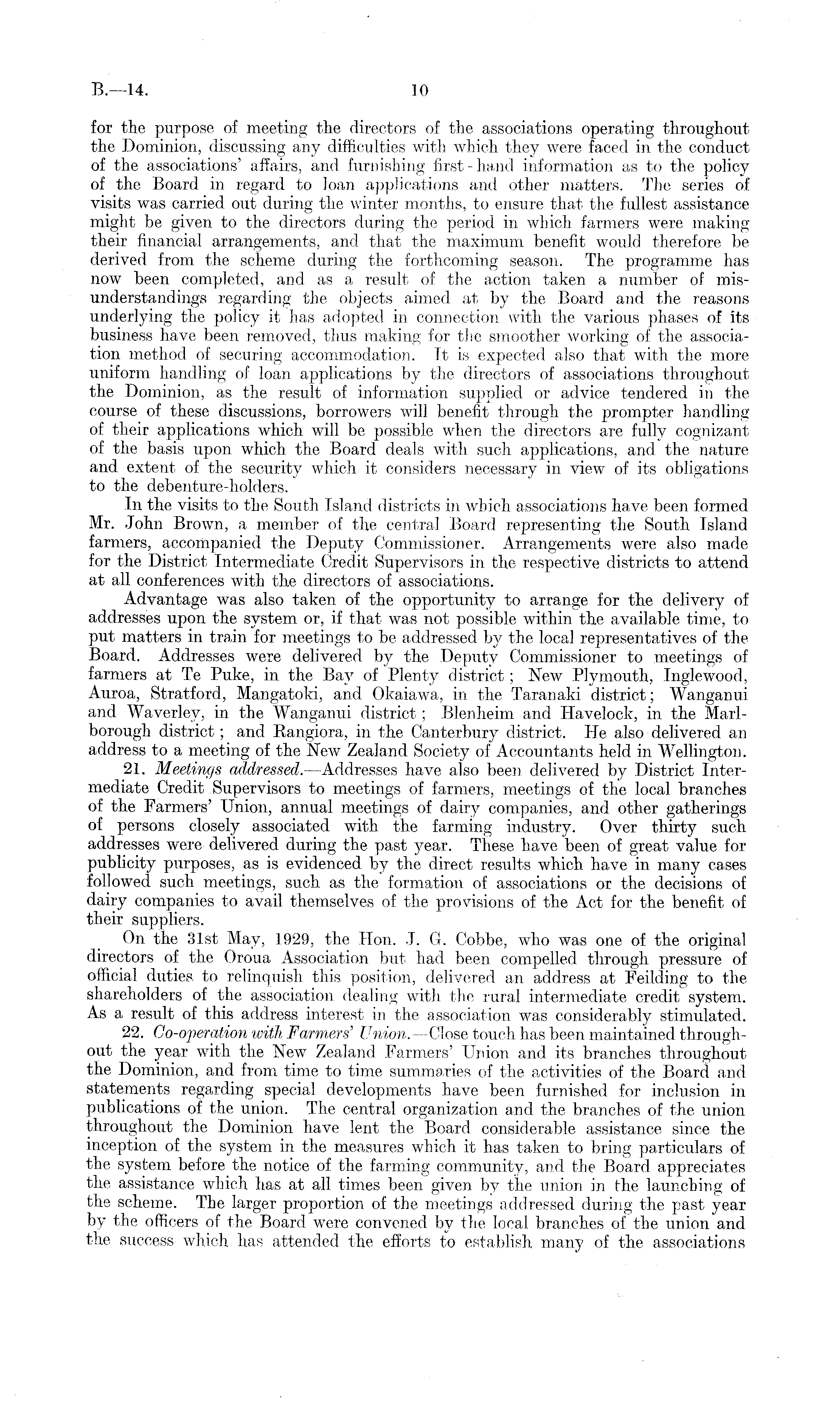 for the purpose of meeting the directors of the associations operating throughout the Dominion, discussing any difficulties with which they were faced in the conduct of the associations' affairs, and furnishing first - hand information as to the policy of the Board in regard to loan applications and other matters. The series of visits was carried out during the winter months, to ensure that the fullest assistance might be given to the directors during the period in which farmers were making their financial arrangements, and that the maximum benefit would therefore be derived from the scheme during the forthcoming season. The programme has now been completed, and as a result of the action taken a number of misunderstandings regarding the objects aimed at by the Board and the reasons underlying the policy it has adopted in connection with the various phases of its business have been removed, thus making for the smoother working of the association method of securing accommodation. It is expected also that with the more uniform handling of loan applications by the directors of associations throughout the Dominion, as the result of information supplied or advice tendered in the course of these discussions, borrowers will benefit through the prompter handling of their applications which will be possible when the directors are fully cognizant of the basis upon which the Board deals with such applications, and the nature and extent of the security which it considers necessary in view of its obligations to the debenture-holders. In the visits to the South Island districts in which associations have been formed Mr. John Brown, a member of the central Board representing the South Island farmers, accompanied the Deputy Commissioner. Arrangements were also made for the District Intermediate Credit Supervisors in the respective districts to attend at all conferences with the directors of associations. Advantage was also taken of the opportunity to arrange for the delivery of addresses upon the system or, if that was not possible within the available time, to put matters in train for meetings to be addressed by the local representatives of the Board. Addresses were delivered by the Deputy Commissioner to meetings of farmers at Te Puke, in the Bay of Plenty district; New Plymouth, Inglewood, Auroa, Stratford, Mangatoki, and Okaiawa, in the Taranaki district; Wanganui and Waverlev, in the Wanganui district ; Blenheim and ITavelock, in the Marlborough district; and Rangiora, in the Canterbury district. He also delivered an address to a meeting of the New Zealand Society of Accountants held in Wellington. 21. Meetings addressed.—Addresses have also been delivered by District Intermediate Credit Supervisors to meetings of farmers, meetings of the local branches of the Farmers' Union, annual meetings of dairy companies, and other gatherings of persons closely associated with the farming industry. Over thirty such addresses were delivered during the past year. These have been of great value for publicity purposes, as is evidenced by the direct results which have in many cases followed such meetings, such as the formation of associations or the decisions of dairy companies to avail themselves of the provisions of the Act for the benefit of their suppliers. On the 31st May, 1929, the Hon. J. G. Cobbe, who was one of the original directors of the Oroua Association but had been compelled through pressure of official duties to relinquish this position, delivered an address at Feilding to the shareholders of the association dealing with the rural intermediate credit system. As a result of this address interest in the association was considerably stimulated. 22. Co-operation with Farmers' Union. —Close touch has been maintained throughout the year with the New Zealand Farmers' Union and its branches throughout the Dominion, and from time to time summaries of the activities of the Board and statements regarding special developments have been furnished for inclusion in publications of the union. The central organization and the branches of the union throughout the Dominion have lent the Board considerable assistance since the inception of the system in the measures which it has taken to bring particulars of the system before the notice of the farming community, and the Board appreciates the assistance which has at all times been given by the union in the launching of the scheme. The larger proportion of the meetings addressed during the past year by the officers of the Board were convened by the local branches of the union and the success which has attended the efforts to establish many of the associations