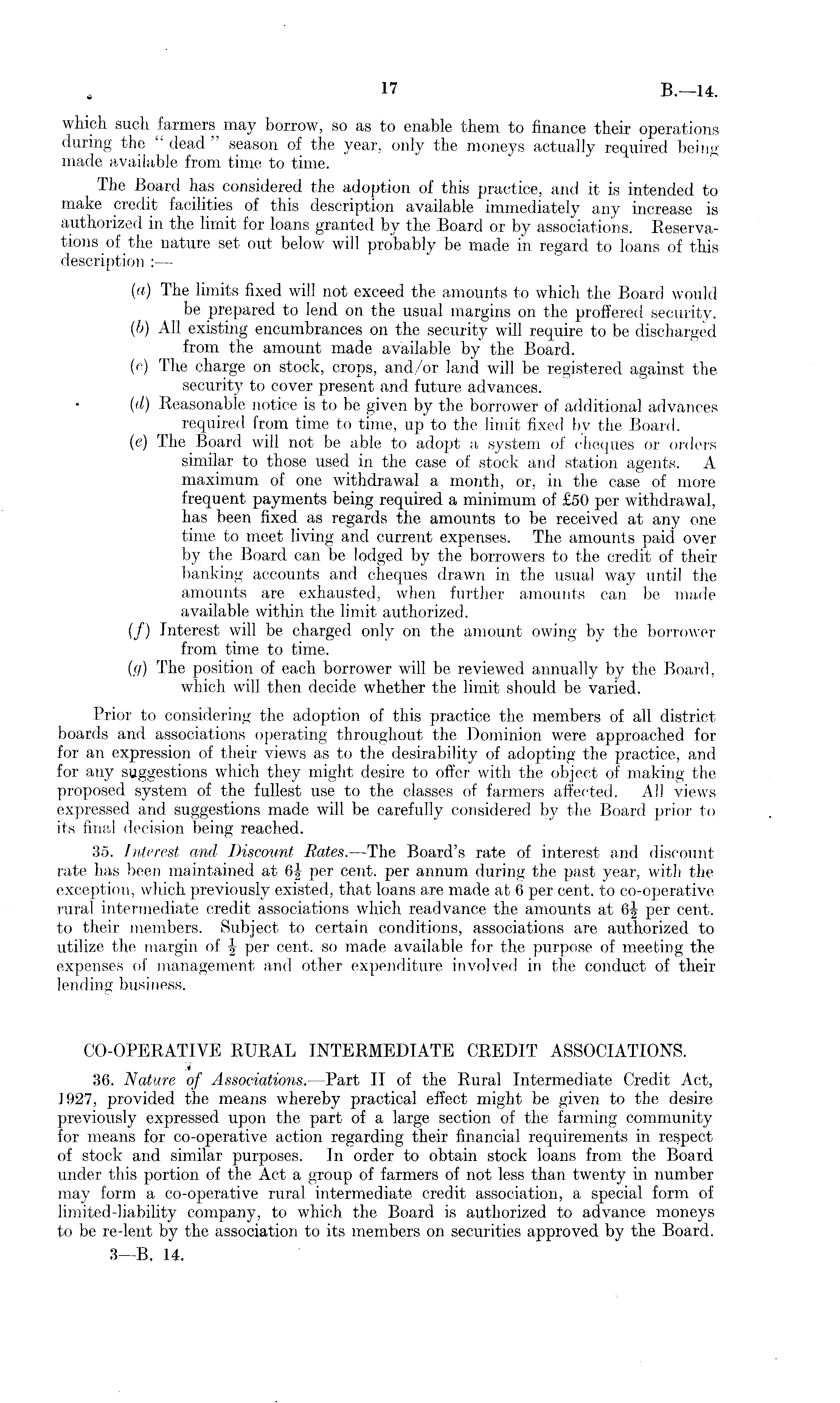 which such farmers may borrow, so as to enable them to finance their operations during the " dead season of the year, only the moneys actually required being made available from time to time. The Board has considered the adoption of this practice, and it is intended to make credit facilities of this description available immediately any increase is authorized in the limit for loans granted by the Board or by associations. Reservations of the nature set out below will probably be made in regard to loans of this description :— (a) The limits fixed will not exceed the amounts to which the Board would be prepared to lend on the usual margins on the proffered security. (■b) All existing encumbrances on the security will require to be discharged from the amount made available by the Board. (c) The charge on stock, crops, and/or land will be registered against the security to cover present and future advances. (d) Reasonable notice is to be given by the borrower of additional advances required from time to time, up to the limit fixed by the Board. (e) The Board will not be able to adopt a system of cheques or orders similar to those used in the case of stock and station agents. A maximum of one withdrawal a month, or, in the case of more frequent payments being required a minimum of £50 per withdrawal, has been fixed as regards the amounts to be received at any one time to meet living and current expenses. The amounts paid over by the Board can be lodged by the borrowers to the credit of their banking accounts and cheques drawn in the usual way until the amounts are exhausted, when further amounts can be made available within the limit authorized. (/) Interest will be charged only on the amount owing by the borrower from time to time. (g) The position of each borrower will be reviewed annually by the Board, which will then decide whether the limit should be varied. Prior to considering the adoption of this practice the members of all district boards and associations operating throughout the Dominion were approached for for an expression of their views as to the desirability of adopting the practice, and for any suggestions which they might desire to offer with the object of making the proposed system of the fullest use to the classes of farmers affected. All views expressed and suggestions made will be carefully considered by the Board prior to its final decision being reached. 35. Interest and Discount Bates. —The Board's rate of interest and discount rate has been maintained at 6f per cent, per annum during the past year, with the exception, which previously existed, that loans are made at 6 per cent, to co-operative rural intermediate credit associations which readvance the amounts at (U- per cent, to their members. Subject to certain conditions, associations are authorized to utilize the margin of J per cent, so made available for the purpose of meeting the expenses of management and other expenditure involved in the conduct of their lending business. CO-OPERATIVE RURAL INTERMEDIATE CREDIT ASSOCIATIONS. 36. Nature of Associations. —Part II of the Rural Intermediate Credit Act, 1927, provided the means whereby practical effect might be given to the desire previously expressed upon the part of a large section of the farming community for means for co-operative action regarding their financial requirements in respect of stock and similar purposes. In order to obtain stock loans from the Board under this portion of the Act a group of farmers of not less than twenty in number may form a co-operative rural intermediate credit association, a special form of limited-liability company, to which the Board is authorized to advance moneys to be re-lent by the association to its members on securities approved by the Board.