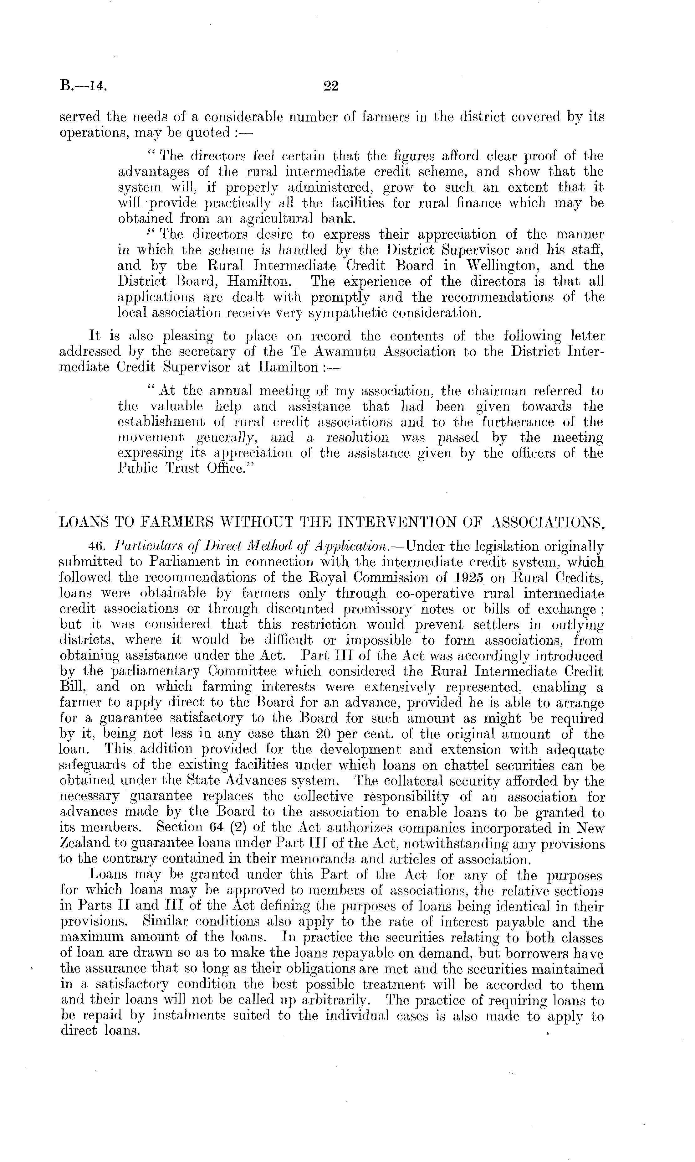 served the needs of a considerable number of farmers in the district covered by its operations, may be quoted : — " Tlie directors feel certain that the figures afford clear proof of the advantages of the rural intermediate credit scheme, and show that the system will, if properly administered, grow to such an extent that it will provide practically all the facilities for rural finance which may be obtained from an agricultural bank. •" The directors desire to express their appreciation of the manner in which the scheme is handled by the District Supervisor and his staff, and by the Rural Intermediate Credit Board in Wellington, and the District Board, Hamilton. The experience of the directors is that all applications are dealt with promptly and the recommendations of the local association receive very sympathetic consideration. It is also pleasing to place on record the contents of the following letter addressed by the secretary of the Te Awamutu Association to the District Intermediate Credit Supervisor at Hamilton : — " At the annual meeting of my association, the chairman referred to the valuable help and assistance that had been given towards the establishment of rural credit associations and to the furtherance of the movement generally, and a resolution was passed by the meeting expressing its appreciation of the assistance given by the officers of the Public Trust Office." LOANS TO FARMERS WITHOUT THE INTERVENTION OF ASSOCIATIONS. 46. Particulars of Direct Method of Application.—Under the legislation originally submitted to Parliament in connection with the intermediate credit system, which followed the recommendations of the Royal Commission of 1925 on Rural Credits, loans were obtainable by farmers only through co-operative rural intermediate credit associations or through discounted promissory notes or bills of exchange ; but it was considered that this restriction would prevent settlers in outlying districts, where it would be difficult or impossible to form associations, from obtaining assistance under the Act. Part 111 of the Act was accordingly introduced by the parliamentary Committee which considered the Rural Intermediate Credit Bill, and on which farming interests were extensively represented, enabling a farmer to apply direct to the Board for an advance, provided he is able to arrange for a guarantee satisfactory to the Board for such amount as might be required by it, being not less in any case than 20 per cent, of the original amount of the loan. This addition provided for the development and extension with adequate safeguards of the existing facilities under which loans on chattel securities can be obtained under the State Advances system. The collateral security afforded by the necessary guarantee replaces the collective responsibility of an association for advances made by the Board to the association to enable loans to be granted to its members. Section 64 (2) of the Act authorizes companies incorporated in New Zealand to guarantee loans under Part 111 of the Act, notwithstanding any provisions to the contrary contained in their memoranda and articles of association. Loans may be granted under this Part of the Act for any of the purposes for which loans may be approved to members of associations, the relative sections in Parts II and 111 of the Act defining the purposes of loans being identical in their provisions. Similar conditions also apply to the rate of interest payable and the maximum amount of the loans. In practice the securities relating to both classes of loan are drawn so as to make the loans repayable on demand, but borrowers have the assurance that so long as their obligations are met and the securities maintained in a satisfactory condition the best possible treatment will be accorded to them and their loans will not be called up arbitrarily. The practice of requiring loans to be repaid by instalments suited to the individual cases is also made to apply to direct loans.