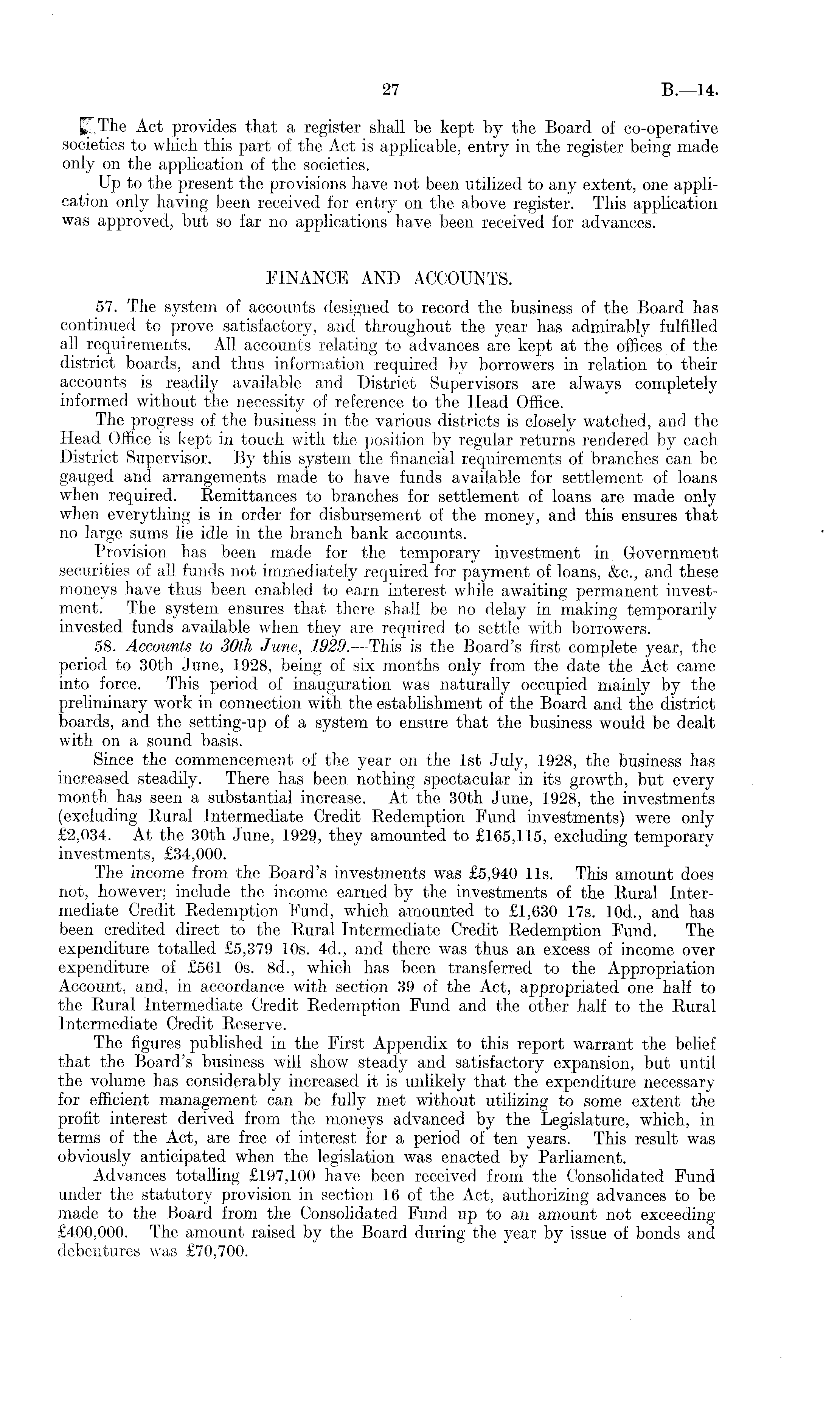 f The Act provides that a register shall be kept by the Board of co-operative societies to which this part of the Act is applicable, entry in the register being made only on the application of the societies. Up to the present the provisions have not been utilized to any extent, one application only having been received for entry on the above register. This application was approved, but so far no applications have been received for advances. FINANCE AND ACCOUNTS. 57. The system of accounts designed to record the business of the Board has continued to prove satisfactory, and throughout the year has admirably fulfilled all requirements. All accounts relating to advances are kept at the offices of the district boards, and thus information required by borrowers in relation to their accounts is readily available and District Supervisors are always completely informed without the necessity of reference to the Head Office. The progress of the business in the various districts is closely watched, and the Head Office is kept in touch with the position by regular returns rendered by each District Supervisor. By this system the financial requirements of branches can be gauged and arrangements made to have funds available for settlement of loans when required. Remittances to branches for settlement of loans are made only when everything is in order for disbursement of the money, and this ensures that no large sums lie idle in the branch bank accounts. Provision has been made for the temporary investment in Government securities of all funds not immediately required for payment of loans, &c., and these moneys have thus been enabled to earn interest while awaiting permanent investment. The system ensures that there shall be no delay in making temporarily invested funds available when they are required to settle with borrowers. 58. Accounts to 30th June, 1929. —This is the Board's first complete year, the period to 30th June, 1928, being of six months only from the date the Act came into force. This period of inauguration was naturally occupied mainly by the preliminary work in connection with the establishment of the Board and the district boards, and the setting-up of a system to ensure that the business would be dealt with on a sound basis. Since the commencement of the year on the Ist July, 1928, the business has increased steadily. There has been nothing spectacular in its growth, but every month has seen a substantial increase. At the 30th June, 1928, the investments (excluding Rural Intermediate Credit Redemption Fund investments) were only £2,034. At the 30th June, 1929, they amounted to £165,115, excluding temporarv investments, £34,000. The income from the Board's investments was £5,940 lis. This amount does not, however; include the income earned by the investments of the Rural Intermediate Credit Redemption Fund, which amounted to £1,630 17s. 10d., and has been credited direct to the Rural Intermediate Credit Redemption Fund. The expenditure totalled £5,379 10s. 4d., and there was thus an excess of income over expenditure of £561 os. Bd., which has been transferred to the Appropriation Account, and, in accordance with section 39 of the Act, appropriated one half to the Rural Intermediate Credit Redemption Fund and the other half to the Rural Intermediate Credit Reserve. The figures published in the First Appendix to this report warrant the belief that the Board's business will show steady and satisfactory expansion, but until the volume has considerably increased it is unlikely that the expenditure necessary for efficient management can be fully met without utilizing to some extent the profit interest derived from the moneys advanced by the Legislature, which, in terms of the Act, are free of interest for a period of ten years. This result was obviously anticipated when the legislation was enacted by Parliament. Advances totalling £197,100 have been received from the Consolidated Fund under the statutory provision in section 16 of the Act, authorizing advances to be made to the Board from the Consolidated Fund up to an amount not exceeding £400,000. The amount raised by the Board during the year by issue of bonds and debentures was £70,700.