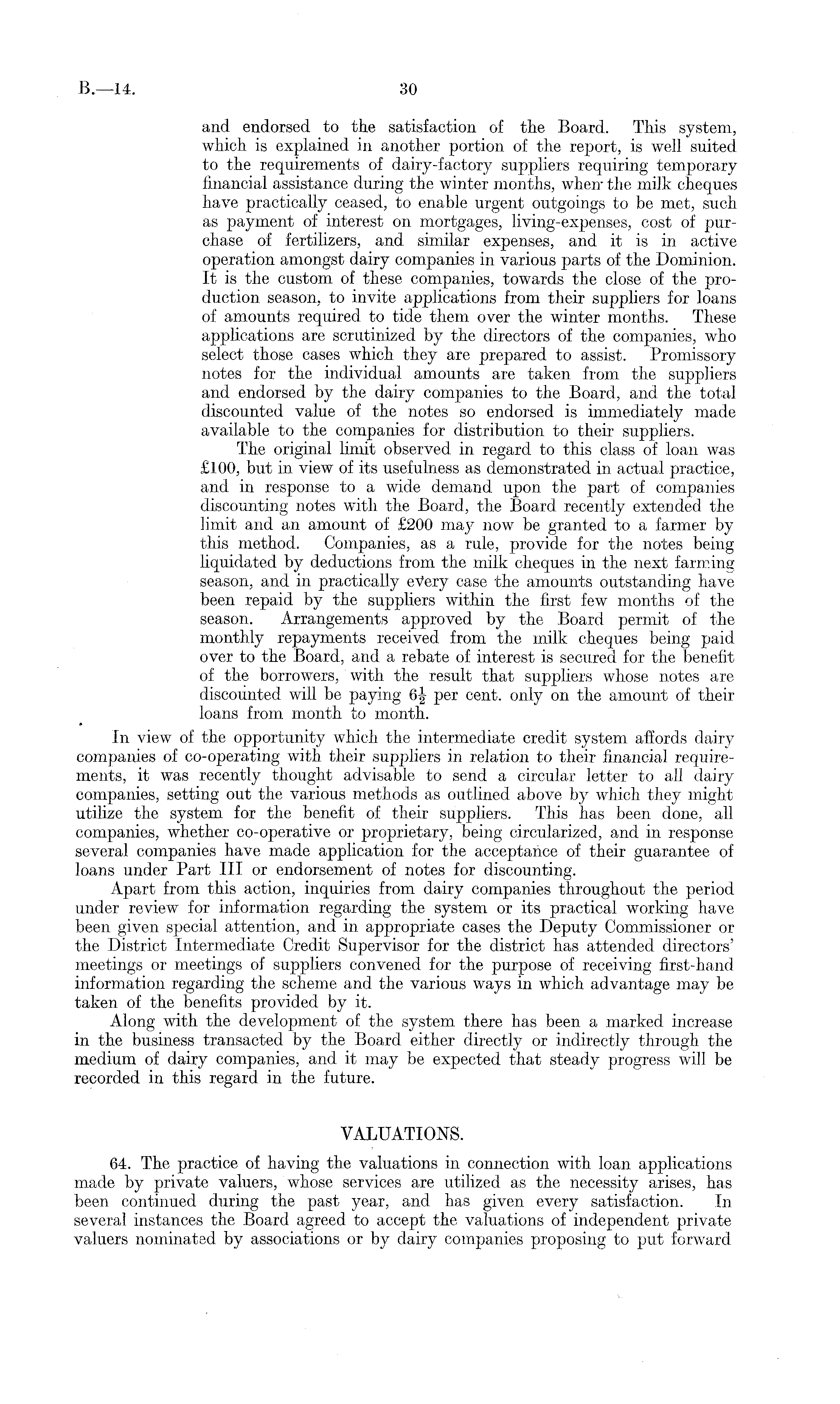 and endorsed to the satisfaction of the Board. This system, which is explained in another portion of the report, is well suited to the requirements of dairy-factory suppliers requiring temporary financial assistance during the winter months, when the milk cheques have practically ceased, to enable urgent outgoings to be met, such as payment of interest on mortgages, living-expenses, cost of purchase of fertilizers, and similar expenses, and it is in active operation amongst dairy companies in various parts of the Dominion. It is the custom of these companies, towards the close of the production season, to invite applications from their suppliers for loans of amounts required to tide them over the winter months. These applications are scrutinized by the directors of the companies, who select those cases which they are prepared to assist. Promissory notes for the individual amounts are taken from the suppliers and endorsed by the dairy companies to the Board, and the total discounted value of the notes so endorsed is immediately made available to the companies for distribution to their suppliers. The original limit observed in regard to this class of loan was £100, but in view of its usefulness as demonstrated in actual practice, and in response to a wide demand upon the part of companies discounting notes with the Board, the Board recently extended the limit and an amount of £200 may now be granted to a farmer by this method. Companies, as a rule, provide for the notes being liquidated by deductions from the milk cheques in the next farming season, and in practically every case the amounts outstanding have been repaid by the suppliers within the first few months of the season. Arrangements approved by the Board permit of the monthly repayments received from the milk cheques being paid over to the Board, and a rebate of interest is secured for the benefit of the borrowers, with the result that suppliers whose notes are discounted will be paying 6| per cent, only on the amount of their loans from month to month. ♦ In view of the opportunity which the intermediate credit system affords dairy companies of co-operating with their suppliers in relation to their financial requirements, it was recently thought advisable to send a circular letter to all dairy companies, setting out the various methods as outlined above by which they might utilize the system for the benefit of their suppliers. This has been done, all companies, whether co-operative or proprietary, being circularized, and in response several companies have made application for the acceptance of their guarantee of loans under Part 111 or endorsement of notes for discounting. Apart from this action, inquiries from dairy companies throughout the period under review for information regarding the system or its practical working have been given special attention, and in appropriate cases the Deputy Commissioner or the District Intermediate Credit Supervisor for the district has attended directors' meetings or meetings of suppliers convened for the purpose of receiving first-hand information regarding the scheme and the various ways in which advantage may be taken of the benefits provided by it. Along with the development of the system there has been a marked increase in the business transacted by the Board either directly or indirectly through the medium of dairy companies, and it may be expected that steady progress will be recorded in this regard in the future. VALUATIONS. 64. The practice of having the valuations in connection with loan applications made by private valuers, whose services are utilized as the necessity arises, has been continued during the past year, and has given every satisfaction. In several instances the Board agreed to accept the valuations of independent private valuers nominated by associations or by dairy companies proposing to put forward