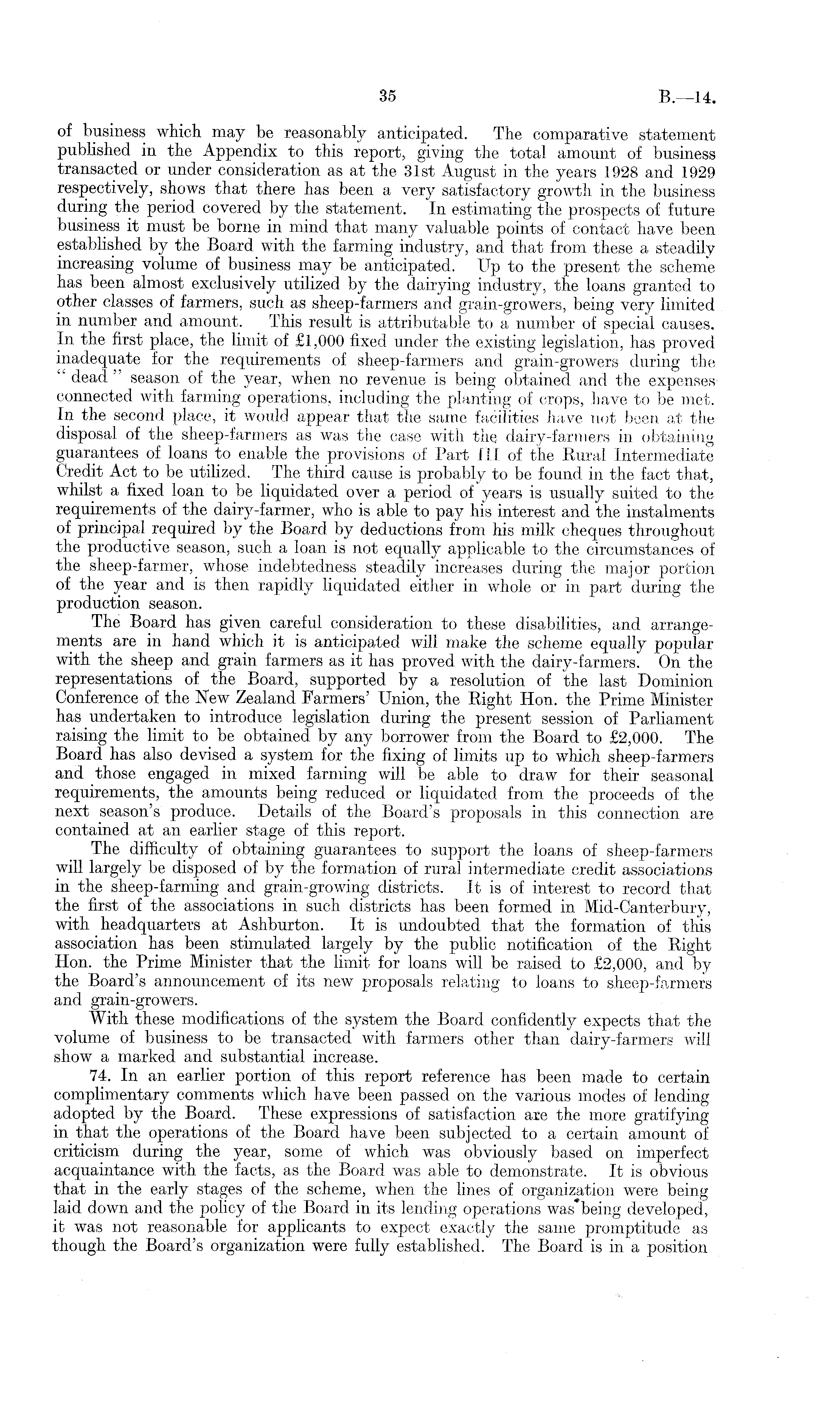 of business which may be reasonably anticipated. The comparative statement published in the Appendix to this report, giving the total amount of business transacted or under consideration as at the 31st August in the years 1928 and 1929 respectively, shows that there has been a very satisfactory growth in the business during the period covered by the statement. In estimating the prospects of future business it must be borne in mind that many valuable points of contact have been established by the Board with the farming industry, and that from these a steadily increasing volume of business may be anticipated. Up to the present the scheme has been almost exclusively utilized by the dairying industry, the loans granted to other classes of farmers, such as sheep-farmers and grain-growers, being very limited in number and amount. This result is attributable to a number of special causes. In the first place, the limit of £.1,000 fixed under the existing legislation, has pro ved inadequate for the requirements of sheep-farmers and grain-growers during the dead " season of the year, when no revenue is being obtained and the expenses connected with farming operations, including the planting of crops, have to be met. In the second place, it would appear that the same facilities have not been at the disposal of the sheep-farmers as was the case with the dairy-farmers in obtaining guarantees of loans to enable the provisions of Part 111 of the Rural Intermediate Credit Act to be utilized. The third cause is probably to be found in the fact that, whilst a fixed loan to be liquidated over a period of years is usually suited to the requirements of the dairy-farmer, who is able to pay his interest and the instalments of principal required by the Board by deductions from his milk cheques throughout the productive season, such a loan is not equally applicable to the circumstances of the sheep-farmer, whose indebtedness steadily increases during the major portion of the year and is then rapidly liquidated either in whole or in part during the production season. The Board has given careful consideration to these disabilities, and arrangements are in hand which it is anticipated will make the scheme equally popular with the sheep and grain farmers as it has proved with the dairy-farmers. On the representations of the Board, supported by a resolution of the last Dominion Conference of the New Zealand Farmers' Union, the Right Hon. the Prime Minister has undertaken to introduce legislation during the present session of Parliament raising the limit to be obtained by any borrower from the Board to £2,000. The Board has also devised a system for the fixing of limits up to which sheep-farmers and those engaged in mixed farming will be able to draw for their seasonal requirements, the amounts being reduced or liquidated from the proceeds of the next season's produce. Details of the Board's proposals in this connection are contained at an earlier stage of this report. The difficulty of obtaining guarantees to support the loans of sheep-farmers will largely be disposed of by the formation of rural intermediate credit associations in the sheep-farming and grain-growing districts. It is of interest to record that the first of the associations in such districts has been formed in Mid-Canterbury, with headquarters at Ashburton. It is undoubted that the formation of this association has been stimulated largely by the public notification of the Right Hon. the Prime Minister that the limit for loans will be raised to £2,000, and by the Board's announcement of its new proposals relating to loans to sheep-farmers and grain-growers. With these modifications of the system the Board confidently expects that the volume of business to be transacted with farmers other than dairy-farmers will show a marked and substantial increase. 74. In an earlier portion of this report reference has been made to certain complimentary comments which have been passed on the various modes of lending adopted by the Board. These expressions of satisfaction are the more gratifying in that the operations of the Board have been subjected to a certain amount of criticism during the year, some of which was obviously based on imperfect acquaintance with the facts, as the Board was able to demonstrate. It is obvious that in the early stages of the scheme, when the lines of organization were being laid down and the policy of the Board in its lending operations was*being developed, it was not reasonable for applicants to expect exactly the same promptitude as though the Board's organization were fully established. The Board is in a position