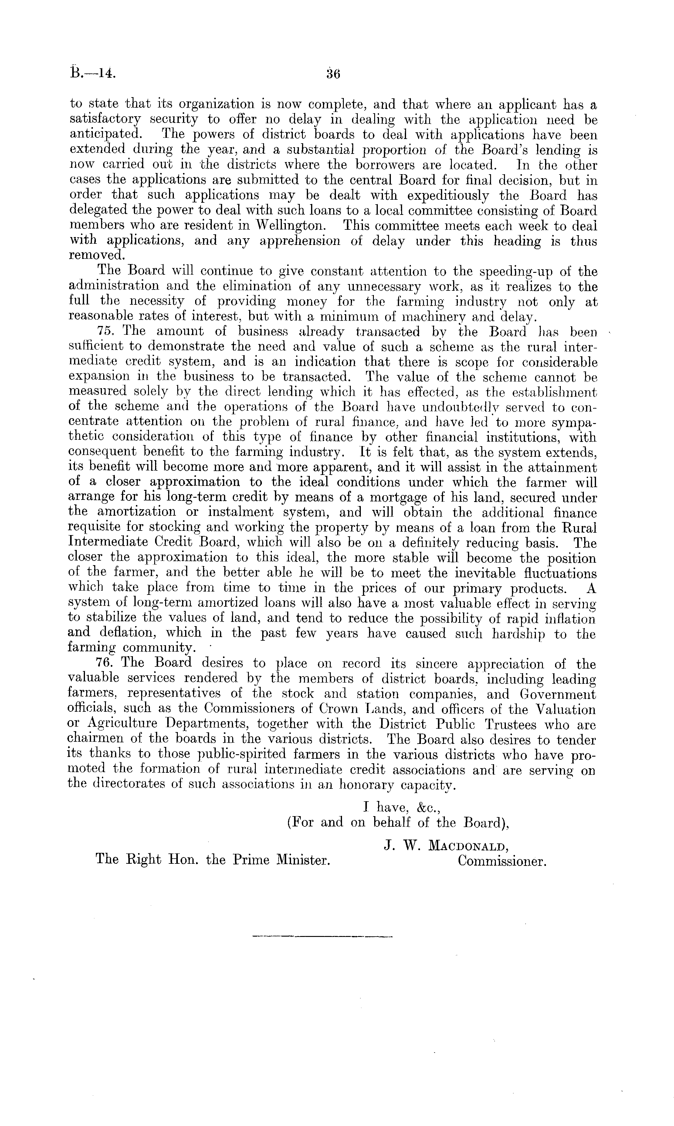 to state that its organization is now complete, and that where an applicant has a satisfactory security to offer no delay in dealing with the application need be anticipated. The powers of district boards to deal with applications have been extended during the year, and a substantial proportion of the Board's lending is now carried out in the districts where the borrowers are located. In the other cases the applications are submitted to the central Board for final decision, but in order that such applications may be dealt with expeditiously the Board has delegated the power to deal with such loans to a local committee consisting of Board members who are resident in Wellington. This committee meets each week to deal with applications, and any apprehension of delay under this heading is thus removed. The Board will continue to give constant attention to the speeding-up of the administration and the elimination of any unnecessary work, as it realizes to the full the necessity of providing money for the farming industry not only at reasonable rates of interest, but with a minimum of machinery and "delay. 75. The amount of business already transacted by the Board has been sufficient to demonstrate the need and value of such a scheme as the rural intermediate credit system, and is an indication that there is scope for considerable expansion in the business to be transacted. The value of the scheme cannot be measured solely by the direct lending which it has effected, as the establishment of the scheme and the operations of the Board have undoubtedly served to concentrate attention on the problem of rural finance, and have led to more sympathetic consideration of this type of finance by other financial institutions, with consequent benefit to the farming industry. It is felt that, as the system extends, its benefit will become more and more apparent, and it will assist in the attainment of a closer approximation to the ideal conditions under which the farmer will arrange for his long-term credit by means of a mortgage of his land, secured under the amortization or instalment system, and will obtain the additional finance requisite for stocking and working the property by means of a loan from the Rural Intermediate Credit Board, which will also be on a definitely reducing basis. The closer the approximation to this ideal, the more stable will become the position of the farmer, and the better able he will be to meet the inevitable fluctuations which take place from time to time in the prices of our primary products. A system of long-term amortized loans will also have a most valuable effect in serving to stabilize the values of land, and tend to reduce the possibility of rapid inflation and deflation, which in the past few years have caused such hardship to the farming community. " 76. The Board desires to place on record its sincere appreciation of the valuable services rendered by the members of district boards, including leading farmers, representatives of the stock and station companies, and Government officials, such as the Commissioners of Crown Lands, and officers of the Valuation or Agriculture Departments, together with the District Public Trustees who are chairmen of the boards in the various districts. The Board also desires to tender its thanks to those public-spirited farmers in the various districts who have promoted the formation of rural intermediate credit associations and are serving on the directorates of such associations in an honorary capacity. I have, &c., (For and on behalf of the Board), J. W. Macdonald, The Right Hon. the Prime Minister. Commissioner.