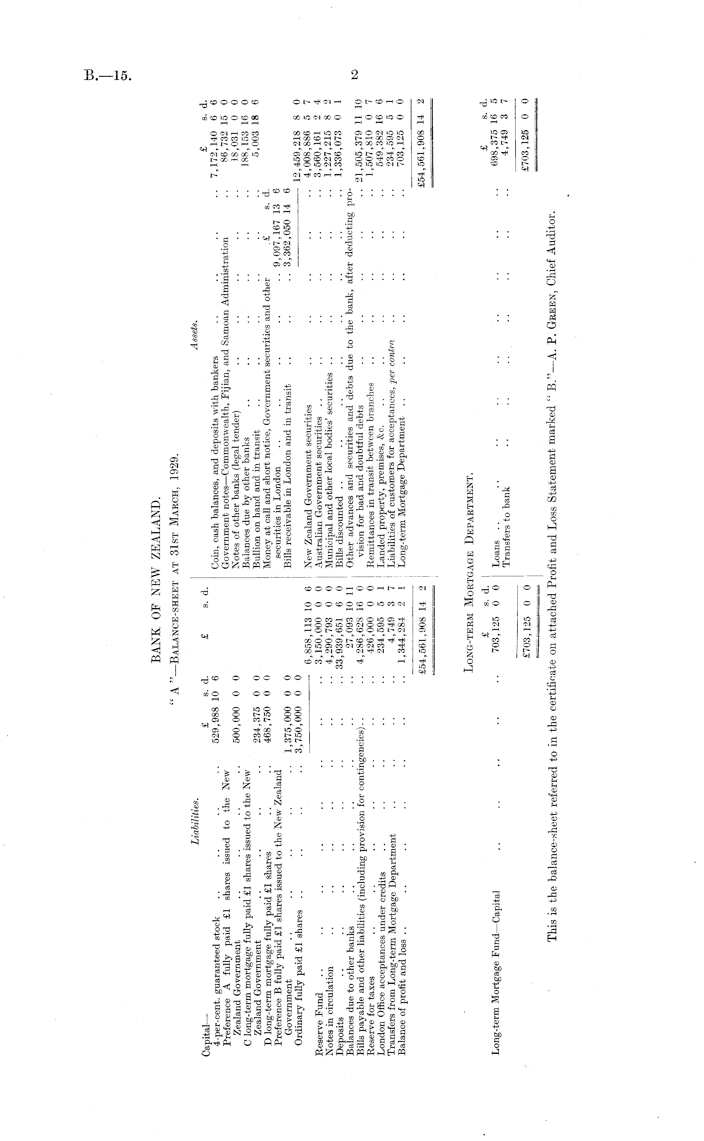 BANK OF NEW ZEALAND. " A "—Balance-sheet at 31st March, 1929. Liabilities. Assets. Capital— £ s. d. £ s. d. £ s. d. 4-per-cent. guaranteed stock .. .. .. .. 529,988 10 6 Coin, cash balances, and deposits with bankers .. .. .. ■■ 7,172,140 6 6 Preference A fully paid £1 shares issued to the New Government notes— Commonwealth, Fijian, and Samoan Administration .. 86,732 15 0 Zealand Government .. .. .. .. 500,000 0 0 Notes of other banks (legal tender) .. .. .. .. .. 18,031 0 0 C long-term mortgage fully paid £1 shares issued to the New Balances due by other banks .. .. .. .. .. .. 188, 153 16 0 Zealand Government * .. .. .. .. 234,375 0 0 Bullion on hand and in transit .. .. .. .. .. .. 5,003 18 6 D long-term mortgage fully paid £1 shares .. .. 468,750 0 0 Money at call and short notice, Government securities and other .£ s. d. Preference B fully paid £1 shares issued to the New Zealand securities in London .. .. .. .. .. 9,097,167 13 6 Government .. .. .. .. .. 1,375,000 0 0 Bills receivable in London and in transit .. .. .. 3,362,050 14 6 Ordinary fully paid £1 shares .. .. .. .. 3,750,000 0 0 12,459,218 8 0 6,858,113 10 6 New Zealand Government securities ... .. .. .. •• 4,008,886 5 7 Reserve Bund .. .. .. .. .. .. .. .. 3,150,000 0 0 Australian Government securities .. .. .. .. .. 3,560,161 2 4 Notes in circulation .. .. .. .. .. .. .. 4,290,793 0 0 Municipal and other local bodies'securities .. .. .. .. •• 1,227,215 8 2 Deposits .. .. .. .. .. .. .. .. 33,939,651 6 0 Bills discounted .. .. .. .. .. •• •• 1,336,073 0 1 Balances due to other banks .. .. .. .. .. •• 27,093 10 11 Other advances and securities and debts due to the bank, after deducting proBills payable and other liabilities (including provision for contingencies).. .. 4,286,628 16 0 vision for bad and doubtful debts .. .. .. .. .. 21,505,379 11 10 Reserve for taxes .. .. .. .. .. .. •• 426,000 0 0 Remittances in transit between branches . . .. .. .. •• 1,507,810 0 7 London Office acceptances under credits .. .. •• •• •• 234,595 5 1 Landed property, premises, &c. .. .. .. .. .. .. 549,382 16 6 Transfers from Long-term Mortgage Department .. •• 4,749 3 7 Liabilities of customers for acceptances, per contra .. .. .. .. 234,595 5 1 Balance of profit and loss .. .. .. .. •• 1,344,284 2 1 Long-term Mortgage Department .. .. .. .. .. •• 703,125 0 0 £54,561,908 14 2 £54,561,908 14 2 Long-term Mortgage Department. £ s. d. £ s. d. Long-term Mortgage Fund—Capital .. .. .. .. 703,125 0 0 Loans .. .. ■■ .. .. .. .. •• 698,375 16 5 Transfers to bank . ■ . . .. .. .. .. • • 4,749 3 7 £703,125 0 0 £703,125 0 0 This is the balance-sheet referred to in the certificate on attached Profit and Loss Statement marked " B.'l— A. P. Green, Chief Auditor.