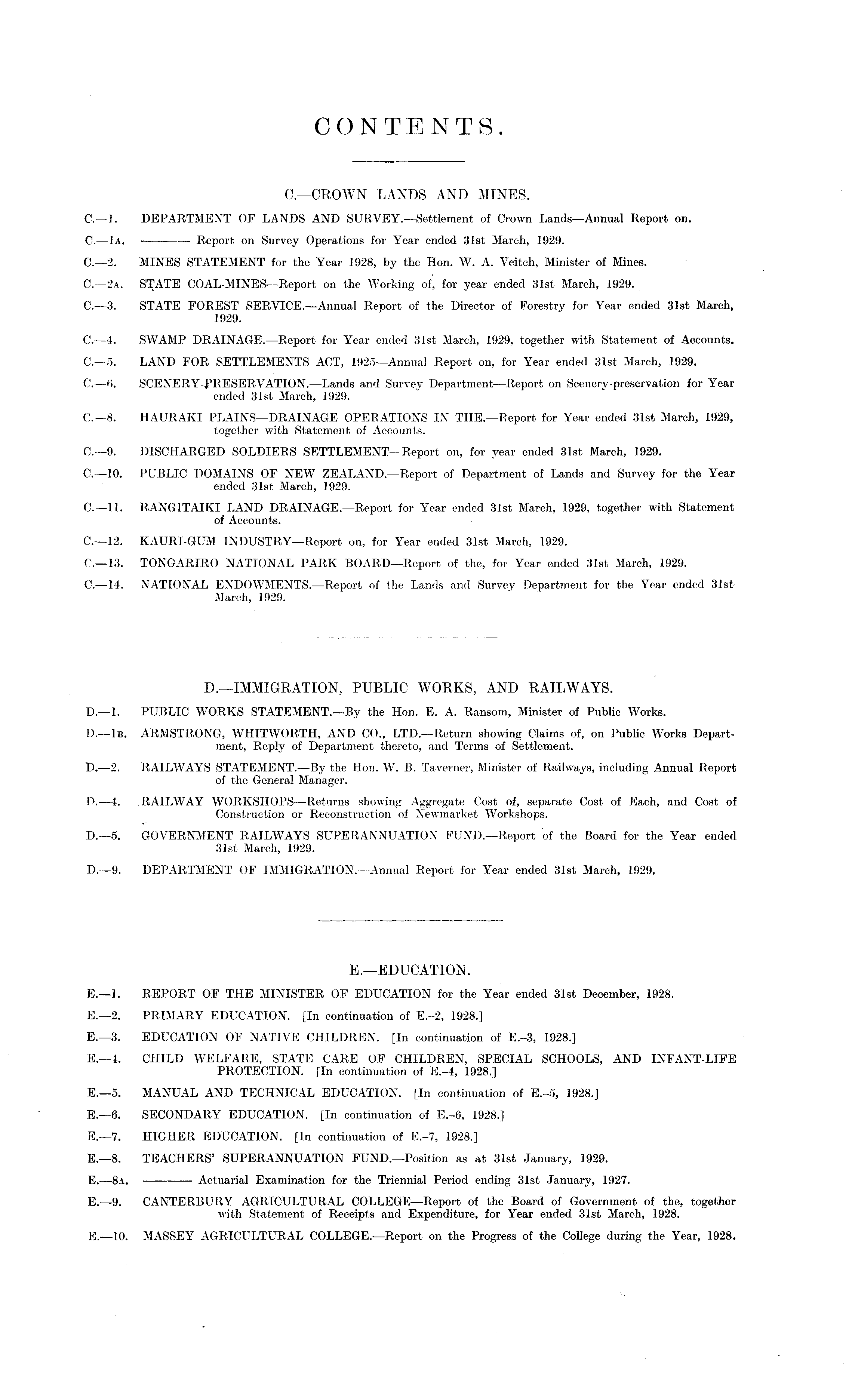 C.—CROWN LANDS AND MINES. C.—l. DEPARTMENT OF LANDS AND SURVEY.—Settlement of Crown Lands—Annual Report on. C.—la. Report on Survey Operations for Year ended 31st March, 1929. C.—2. MINES STATEMENT for the Year 1928, by the Hon. W. A. Veiteh, Minister of Mines. C.—2a. STATE COAL-MlNES—Report on the Working of, for year ended 31st March, 1929. C.—3. STATE FOREST SERVICE.—AnnuaI Report of the Director of Forestry for Year ended 31st March, 1929. C.—4. SWAMP DRAINAGE.—Report for Year ended 31st March, 1929, together with Statement of Accounts. C.—s. LAND FOR SETTLEMENTS ACT, 1925—Annual Report on, for Year ended 31st March, 1929. C.—(:i. SCENERY-PRESERVATION.—Lands and Survey Department—Report on Scenery-preservation for Year ended 31st March, 1929. C.—B. HAURAKI PLAINS—DRAINAGE OPERATIONS IN THE.—Report for Year ended 31st March, 1929, together with Statement of Accounts. C.—9. DISCHARGED SOLDIERS SETTLEMENT—Report on, for year ended 31st, March, 1929. C.—lo. PUBLIC DOMAINS OF NEW ZEALAND.—Report of Department of Lands and Survey for the Year ended 31st March, 1929. C.—11. RANGITAIKI LAND DRAINAGE.—Report for Year ended 31st March, 1929, together with Statement of Accounts. C.—l 2. KAURI-GUM INDUSTRY—Report on, for Year ended 31st March, 1929. C.—l 3. TONGARIRO NATIONAL PARK BOARD—Report of the, for Year ended 31st March, 1929. C.—l 4. NATIONAL ENDOWMENTS.—Report of the Lands and Survey Department for the Year ended 31st March, 1929.