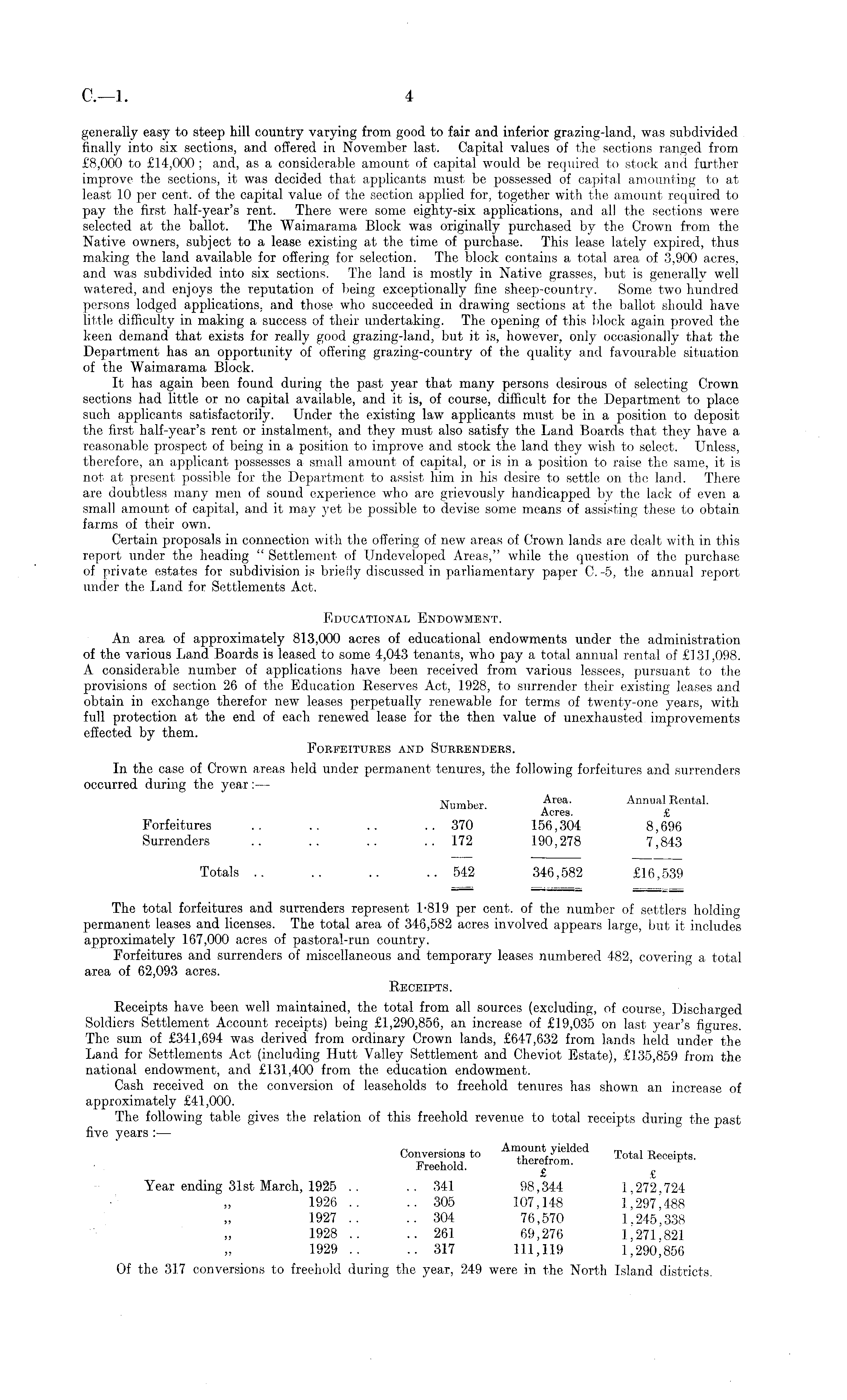 generally easy to steep Mil country varying from good to fair and inferior grazing-land, was subdivided finally into six sections, and offered in November last. Capital values of the sections ranged from £8,000 to £14,000 ; and, as a considerable amount of capital would be required to stock and further improve the sections, it was decided that applicants must be possessed of capital amounting to at least 10 per cent, of the capital value of the section applied for, together with the amount required to pay the first half-year's rent. There were some eighty-six applications, and all the sections were selected at the ballot. The Waimarama Block was originally purchased by the Crown from the Native owners, subject to a lease existing at the time of purchase. This lease lately expired, thus making the land available for offering for selection. The block contains a total area of 3,900 acres, and was subdivided into six sections. The land is mostly in Native grasses, but is generally well watered, and enjoys the reputation of being exceptionally fine sheep-country. Some two hundred persons lodged applications, and those who succeeded in drawing sections at the ballot should have little difficulty in making a success of their undertaking. The opening of this block again proved the keen demand that exists for really good grazing-land, but it is, however, only occasionally that the Department has an opportunity of offering grazing-country of the quality and favourable situation of the Waimarama Block. It has again been found during the past year that many persons desirous of selecting Crown sections had little or no capital available, and it is, of course, difficult for the Department to place such applicants satisfactorily. Under the existing law applicants must be in a position to deposit the first half-year's rent or instalment, and they must also satisfy the Land Boards that they have a reasonable prospect of being in a position to improve and stock the land they wish to select. Unless, therefore, an applicant possesses a small amount of capital, or is in a position to raise the same, it is not at present possible for the Department to assist him in his desire to settle on the land. There are doubtless many men of sound experience who are grievously handicapped by the lack of even a small amount of capital, and it may yet be possible to devise some means of assisting these to obtain farms of their own. Certain proposals in connection with the offering of new areas of Crown lands are dealt with in this report under the heading " Settlement of Undeveloped Areas," while the question of the purchase of private estates for subdivision is briefly discussed in parlia mental paper C.-5, the annual report under the Land for Settlements Act. Educational Endowment. An area of approximately 813,000 acres of educational endowments under the administration of the various Land Boards is leased to some 4,043 tenants, who pay a total annual rental of £131,098. A considerable number of applications have been received from various lessees, pursuant to the provisions of section 26 of the Education Reserves Act, 1928, to surrender their existing leases and obtain in exchange therefor new leases perpetually renewable for terms of twenty-one years, with full protection at the end of each renewed lease for the then value of unexhausted improvements effected by them. Forfeitures and Surrenders. In the case of Crown areas held under permanent tenures, the following forfeitures and surrenders occurred during the year: — Number. rea " Annual Rental. Acres. £ Forfeitures .. .. .. .. 370 156,304 8,696 Surrenders .. .. .. ..172 190,278 7,843 Totals .. .. .. ..542 346,582 £16,539 The total forfeitures and surrenders represent 1-819 per cent, of the number of settlers holding permanent leases and licenses. The total area of 346,582 acres involved appears large, but it includes approximately 167,000 acres of pastoral-run country. Forfeitures and surrenders of miscellaneous and temporary leases numbered 482, covering a total area of 62,093 acres. Receipts. Receipts have been well maintained, the total from all sources (excluding, of course, Discharged Soldiers Settlement Account receipts) being £1,290,856, an increase of £19,035 on last year's figures. The sum of £341,694 was derived from ordinary Crown lands, £647,632 from lands held under the Land for Settlements Act (including Hutt Valley Settlement and Cheviot Estate), £135,859 from the national endowment, and £131,400 from the education endowment. Cash received on the conversion of leaseholds to freehold tenures has shown an increase of approximately £41,000. The following table gives the relation of this freehold revenue to total receipts during the past five years : —■ Conversions to Total Receipts. Freehold. tUerelrom. Year ending 31st March, 1925 .. .. 341 98,344 1,272.724 1926 .. ..305 107,148 1,297,488 1927 .. ..304 76,570 1.245,338 1928 .. ..261 69,276 1,271.821 1929 .. ..317 111,119 1,290,856 Of the 317 conversions to freehold during the year, 249 were in the North Island districts.