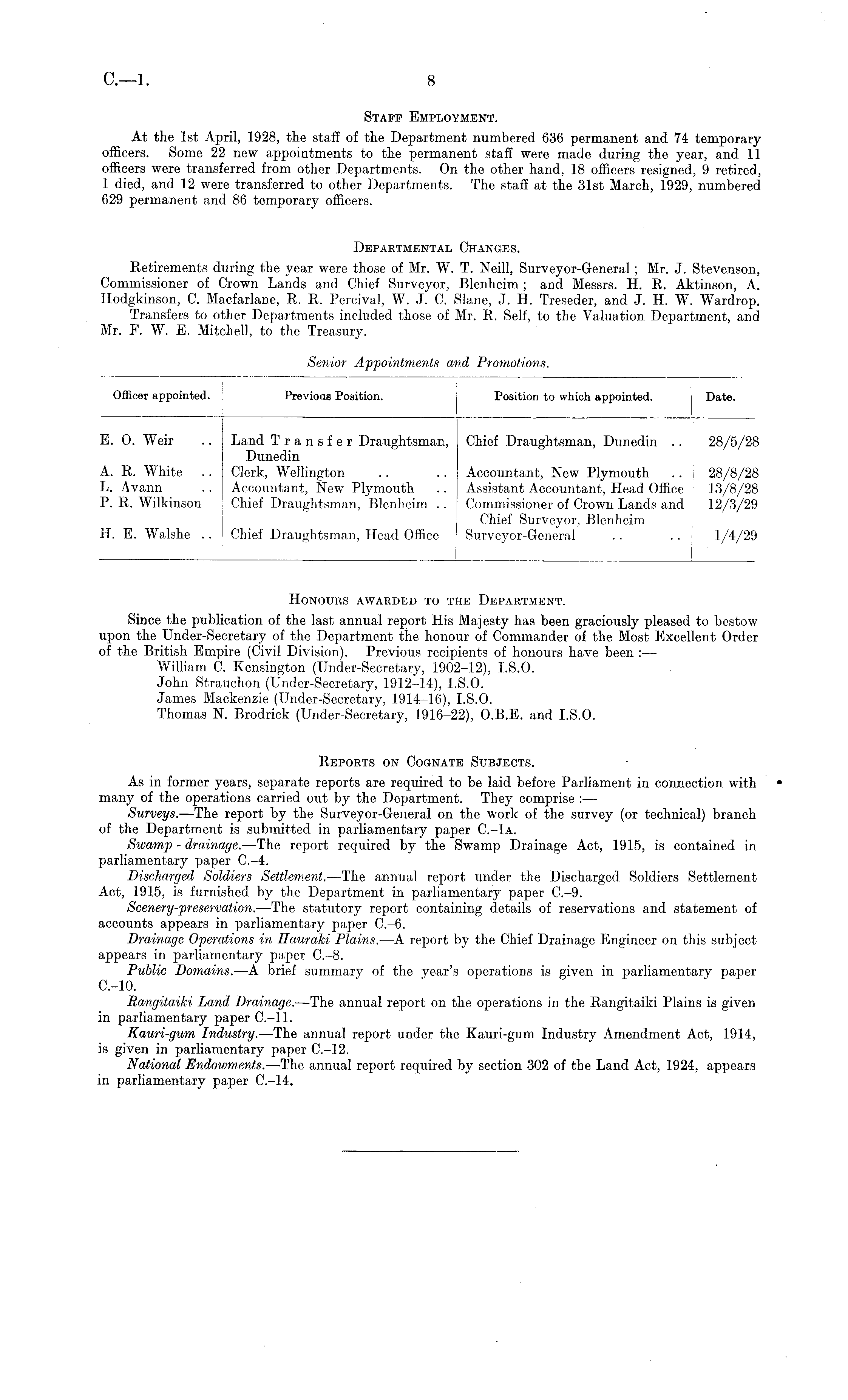Staff Employment. At the Ist April, 1928, the staff of the Department numbered 636 permanent and 74 temporary officers. Some 22 new appointments to the permanent staff were made during the year, and 11 officers were transferred from other Departments. On the other hand, 18 officers resigned, 9 retired, 1 died, and 12 were transferred to other Departments. The staff at the 31st March, 1929, numbered 629 permanent and 86 temporary officers. Departmental Changes. Retirements during the year were those of Mr. W. T. Neill, Surveyor-General; Mr. J. Stevenson, Commissioner of Crown Lands and Chief Surveyor, Blenheim; and Messrs. H. R. Aktinson, A. Hodgkinson, C. Macfarlane, R. R. Percival, W. J. C. Slane, J. H. Treseder, and J. H. W. Wardrop. Transfers to other Departments included those of Mr. R. Self, to the Valuation Department, and Mr. F. W. E. Mitchell, to the Treasury.
