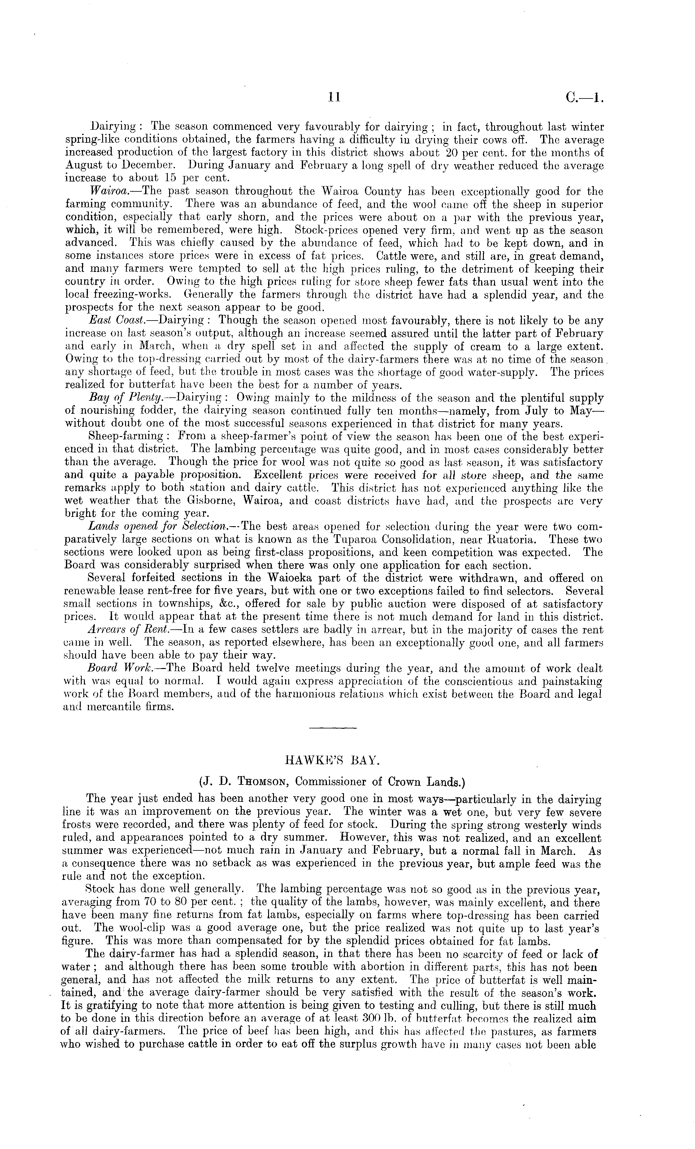 Dairying : The season commenced very favourably for dairying ; in fact, throughout last winter spring-like conditions obtained, the farmers having a difficulty in drying their cows off. The average increased production of the largest factory in this district shows about 20 per cent, for the months of August to December. During January and February a long spell of dry weather reduced the average increase to about 15 per cent. Wairoa. —The past season throughout the Wairoa County has been exceptionally good for the farming community. There was an abundance of feed, and the wool came off the sheep in superior condition, especially that early shorn, and the prices were about on a par with the previous year, which, it will be remembered, were high. Stock-prices opened very firm, and went up as the season advanced. This was chiefly caused by the abundance of feed, which had to be kept down, and in some instances store prices were in excess of fat prices. Cattle were, and still are, in great demand, and many farmers were tempted to sell at the high prices ruling, to the detriment of keeping their country in order. Owing to the high prices ruling for store sheep fewer fats than usual went into the local freezing-works. Generally the farmers through the district have had a splendid year, and the prospects for the next season appear to be good. East Coast. —Dairying : Though the season opened most favourably, there is not likely to be any increase on last season's output, although an increase seemed assured until the latter part of February and early in March, when a dry spell set in and affected the supply of cream to a la-rge extent. Owing to the top-dressing carried out by most of the dairy-farmers there was at no time of the season any shortage of feed, but the trouble in. most cases was the shortage of good water-supply. The prices realized for butterfat have been the best for a number of years. Bay of Plenty. —Dairying : Owing mainly to the mildness of the season and the plentiful supply of nourishing fodder, the dairying season continued fully ten months —namely, from July to May— without doubt one of the most successful seasons experienced in that district for many years. Sheep-farming : From a sheep-farmer's point of view the season has been one of the best experienced in that district. The lambing percentage was quite good, and in most cases considerably better than the average. Though the price for wool was not quite so good as last season, it was satisfactory and quite a payable proposition. Excellent prices were received for all store sheep, and the same remarks apply to both station and dairy cattle. This district has not experienced anything like the wet weather that the Gisborne, Wairoa, and coast districts have had, and the prospects are very bright for the coming year. Lands opened for Selection.—The best areas opened for selection during the year were two comparatively large sections on what is known as the Tuparoa Consolidation, near Ruatoria. These two sections were looked upon as being first-class propositions, and keen competition was expected. The Board was considerably surprised when there was only one application for each section. Several forfeited sections in the Waioeka part of the district were withdrawn, and offered on renewable lease rent-free for five years, but with one or two exceptions failed to find selectors. Several small sections in townships, &c., offered for sale by public auction were disposed of at satisfactory prices. It would appear that at the present time there is not much demand for land in this district. Arrears of Rent. —In a few cases settlers are badly in arrear, but in the majority of cases the rent came in well. The season, as reported elsewhere, has been an exceptionally good one, and all farmers should have been able to pay their way. Board Work. —The Board held twelve meetings during the year, and the amount of work dealt with was equal to normal. I would again express appreciation of the conscientious and painstaking work of the Board members, and of the harmonious relations which exist between the Board and legal and mercantile firms. HAWKE'S BAY. (J. D. Thomson, Commissioner of Crown Lands.) The year just ended has been another very good one in most ways—particularly in the dairying line it was an improvement 011 the previous year. The winter was a wet one, but very few severe frosts were recorded, and there was plenty of feed for stock. During the spring strong westerly winds ruled, and appearances pointed to a dry summer. However, this was not realized, and an excellent summer was experienced—not much rain in January and February, but a normal fall in March. As a consequence there was no setback as was experienced in the previous year, but ample feed was the rule and not the exception. Stock has done well generally. The lambing percentage was not so good as in the previous year, averaging from 70 to 80 per cent. ; the quality of the lambs, however, was mainly excellent, and there have been many fine returns from fat lambs, especially on farms where top-dressing has been carried out. The wool-clip was a good average one, but the price realized was not quite up to last year's figure. This was more than compensated for by the splendid prices obtained for fat lambs. The dairy-farmer has had a splendid season, in that there has been no scarcity of feed or lack of water ; and although there has been some trouble with abortion in different parts, this has not been general, and has not affected the milk returns to any extent. The price of butterfat is well maintained, and the average dairy-farmer should be very satisfied with the result of the season's work. It is gratifying to note that more attention is being given to testing and culling, but there is still much to be done in this direction before an average of at least 300 lb. of butterfat becomes the realized aim of all dairy-farmers. The price of beef has been high, and