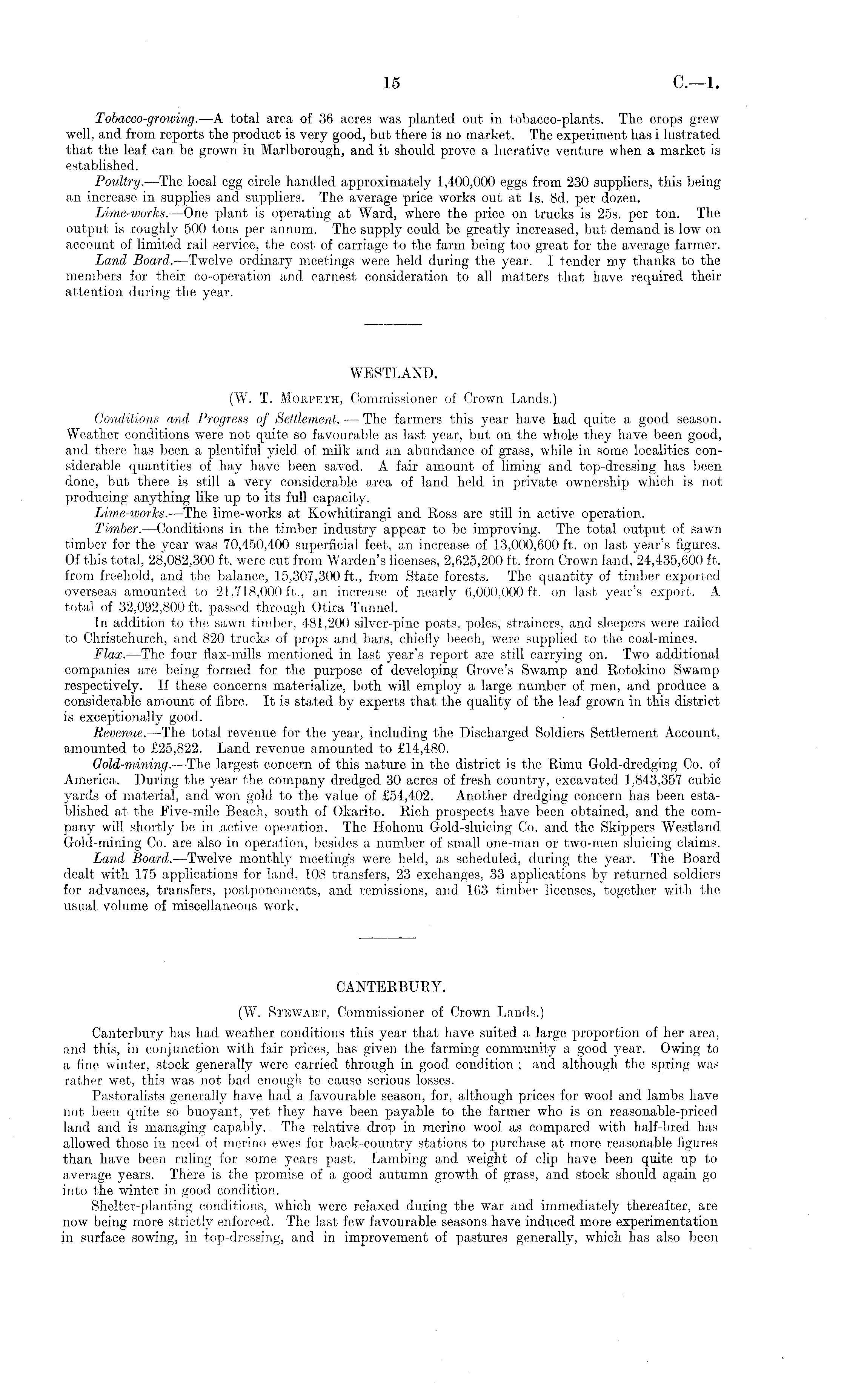 Tobacco-growing.—A total area of 36 acres was planted out in tobacco-plants. The crops grew well, and from reports the product is very good, but there is no market. The experiment has i lustrated that the leaf can be grown in Marlborough, and it should prove a lucrative venture when a market is established. Poultry.—The local egg circle handled approximately 1,400,000 eggs from 230 suppliers, this being an increase in supplies and suppliers. The average price works out at Is. Bd. per dozen. Lime-works. —One plant is operating at Ward, where the price on trucks is 255. per ton. The output is roughly 500 tons per annum. The supply could be greatly increased, but demand is low on account of limited rail service, the cost of carriage to the farm being too great for the average farmer. Land Board.—Twelve ordinary meetings were held during the year. I tender my thanks to the members for their co-operation and earnest consideration to all matters that have required their attention during the year. WESTLAND. (W. T. Mokpeth, Commissioner of Crown Lands.) Conditions and Progress of Settlement. —■ The farmers this year have had quite a good season. Weather conditions were not quite so favourable as last year, but on the whole they have been good, and there has been a plentiful yield of milk and an abundance of grass, while in some localities considerable quantities of hay have been saved. A fair amount of liming and top-dressing has been done, but there is still a very considerable area of land held in private ownership which is not producing anything like up to its full capacity. Lime-works.—The lime-works at Kowhitirangi and Ross are still in active operation. Timber.—Conditions in the timber industry appear to be improving. The total output of sawn timber for the year was 70,450,400 superficial feet, an increase of 13,000,600 ft. on last year's figures. Of this total, 28,082,300 ft. were cut from Warden's licenses, 2,625,200 ft. from Crown land, 24,435,600 ft. from freehold, and the balance, 15,307,300 ft., from State forests. The quantity of timber exported overseas amounted to 21,718,000 ft., an increase of nearly 6,000,000 ft. on last year's export. A total of 32,092,800 ft. passed through Otira Tunnel. In addition to the sawn timber, 481,200 silver-pine posts, poles, strainers, and sleepers were railed to Christchurch, and 820 trucks of props and bars, chiefly beech, were supplied to the coal-mines. Flax. —The four flax-mills mentioned in last year's report are still carrying on. Two additional companies are being formed for the purpose of developing Grove's Swamp and Rotokino Swamp respectively. If these concerns materialize, both will employ a large number of men, and produce a considerable amount of fibre. It is stated by experts that the quality of the leaf grown in this district is exceptionally good. Revenue.—The total revenue for the year, including the Discharged Soldiers Settlement Account, amounted to £25,822. Land revenue amounted to £14,480. Gold-mining.—The largest concern of this nature in the district is the Rimu Gold-dredging Co. of America. During the year the company dredged 30 acres of fresh country, excavated 1,843,357 cubic yards of material, and won gold to the value of £54,402. Another dredging concern has been established at the Five-mile Beach, south of Okarito. Rich prospects have been obtained, and the company will shortly be in .active operation. The Hohonu Gold-sluicing Co. and the Skippers Westland Gold-mining Co. are also in operation, besides a number of small one-man or two-men sluicing claims. Land Board. —Twelve monthly meeting's were held, as scheduled, during the year. The Board dealt with 175 applications for land, 108 transfers, 23 exchanges, 33 applications by returned soldiers for advances, transfers, postponements, and remissions, and 163 timber licenses, together with the usual, volume of miscellaneous work. CANTERBURY. (W. Stewart, Commissioner of Crown Lands.) Canterbury has had weather conditions this year that have suited a large proportion of her area, and this, in conjunction with fair prices, has given the farming community a good year. Owing to a fine winter, stock generally were carried through in good condition ; and although the spring was rather wet, this was not bad enough to cause serious losses. Pastoralists generally have had a favourable season, for, although prices for wool and lambs have not been quite so buoyant, yet they have been payable to the farmer who is on reasonable-priced land and is managing capably. The relative drop in merino wool as compared with half-bred has allowed those in need of merino ewes for back-country stations to purchase at more reasonable figures than have been ruling for some years past. Lambing and weight of clip have been quite up to average years. There is the promise of a good autumn growth of grass, and stock should again go into the winter in good condition. Shelter-planting conditions, which were relaxed during the war and immediately thereafter, are now being more strictly enforced. The last few favourable seasons have induced more experimentation in surface sowing, in top-dressing, and in improvement of pastures generally, which has also been