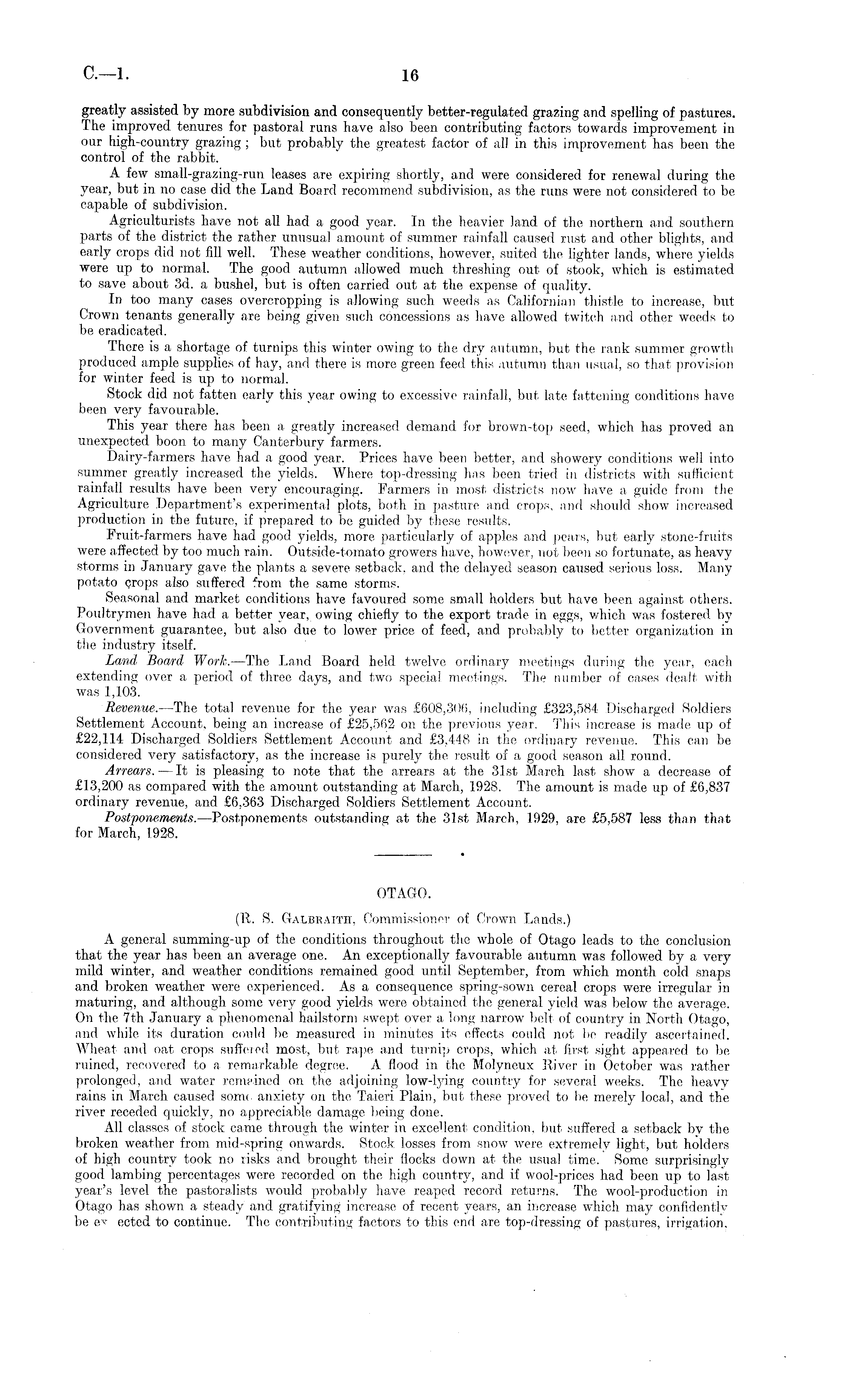 greatly assisted by more subdivision and consequently better-regulated grazing and spelling of pastures. The improved tenures for pastoral runs have also been contributing factors towards improvement in our high-country grazing ; but probably the greatest factor of all in this improvement has been the control of the rabbit. A few small-grazing-run leases are expiring shortly, and were considered for renewal during the year, but in no case did the Land Board recommend subdivision, as the runs were not considered to be capable of subdivision. Agriculturists have not all had a good year. In the heavier land of the northern and southern parts of the district the rather unusual amount of summer rainfall caused rust and other blights, and early crops did not fill well. These weather conditions, however, suited the lighter lands, where yields were up to normal. The good autumn allowed much threshing out of stook, which is estimated to save about 3d. a bushel, but is often carried out at the expense of quality. In too many cases overcropping is allowing such weeds as Californian thistle to increase, but Crown tenants generally are being given such concessions as have allowed twitch and other weeds to be eradicated. There is a shortage of turnips this winter owing to the dry autumn, but the rank summer growth produced ample supplies of hay, and there is more green feed this autumn than usual, so that provision for winter feed is up to normal. Stock did not fatten early this year owing to excessive rainfall, but late fattening conditions have been very favourable. This year there has been a greatly increased demand for brown-top seed, which has proved an unexpected boon to many Canterbury farmers. Dairy-farmers have had a good year. Prices have been better, and showery conditions well into summer greatly increased the yields. Where top-dressing has been tried in districts with sufficient rainfall results have been very encouraging. Farmers in most districts now have a guide from the Agriculture Department's experimental plots, both in pasture and crops, and should show increased production in the future, if prepared to be guided by these results. Fruit-farmers have had good yields, more particularly of apples and pears, but early stone-fruits were affected by too much rain. Outside-tomato growers have, however, not been so fortunate, as heavy storms in January gave the plants a severe setback, and the delayed season caused serious loss. Many potato crops also suffered from the same storms. Seasonal and market conditions have favoured some small holders but have been against others. Poultrymen have had a better year, owing chiefly to the export trade in eggs, which was fostered by Government guarantee, but also due to lower price of feed, and probably to better organization in the industry itself. Land Board Work. —The Land Board held twelve ordinary meetings during the year, each extending over a period of three days, and two special meetings. The number of cases dealt with was 1,103. Revenue.—The total revenue for the year was £608,306, including £323,584 Discharged Soldiers Settlement Account, being an increase of £25,562 on the previous year. This increase is made up of £22,114 Discharged Soldiers Settlement Account and £3,448 in the ordinary revenue. This can be considered very satisfactory, as the increase is purely the result of a good season all round. Arrears. —It is pleasing to note that the arrears at the 31st March last show a decrease of £13,200 as compared with the amount outstanding at March, 1928. The amount is made up of £6,837 ordinary revenue, and £6,363 Discharged Soldiers Settlement Account. Postponements.—Postponements outstanding at the 31st March, 1929, are £5,587 less than that for March, 1928. OTAGO. (R. S. Galbraith, Commissioner of Crown Lands.) A general summing-up of the conditions throughout the whole of Otago leads to the conclusion that the year has been an average one. An exceptionally favourable autumn was followed by a very mild winter, and weather conditions remained good until September, from which month cold snaps and broken weather were experienced. As a consequence spring-sown cereal crops were irregular in maturing, and although some very good yields were obtained the general yield was below the average. On the 7th January a phenomenal hailstorm swept over a long narrow belt of country in North Otago, and while its duration could be measured in minutes its effects could not be readily ascertained. Wheat and oat crops suffered most, but rape and turnip crops, which at first sight appeared to be ruined, recovered to a remarkable degree. A flood in the Molyneux River in October was rather prolonged, and water remained on the adjoining low-lying country for several weeks. The heavy rains in March caused som< anxiety on the Taieri Plain, but these proved to be merely local, and the river receded quickly, no appreciable damage being done. All classes of stock came through the winter in excellent condition, but suffered a setback by the broken weather from mid-spring onwards. Stock losses from snow were extremely light, but holders of high country took no risks and brought their flocks down at the usual time. Some surprisingly good lambing percentages were recorded on the high country, and if wool-prices had been up to last year's level the pastoralists would probably have reaped record returns. The wool-production in Otago has shown a steady and gratifying increase of recent years, an increase which may confidentlv be ev ected to continue. The contributing factors to this end are top-dressing of pastures, irrigation.