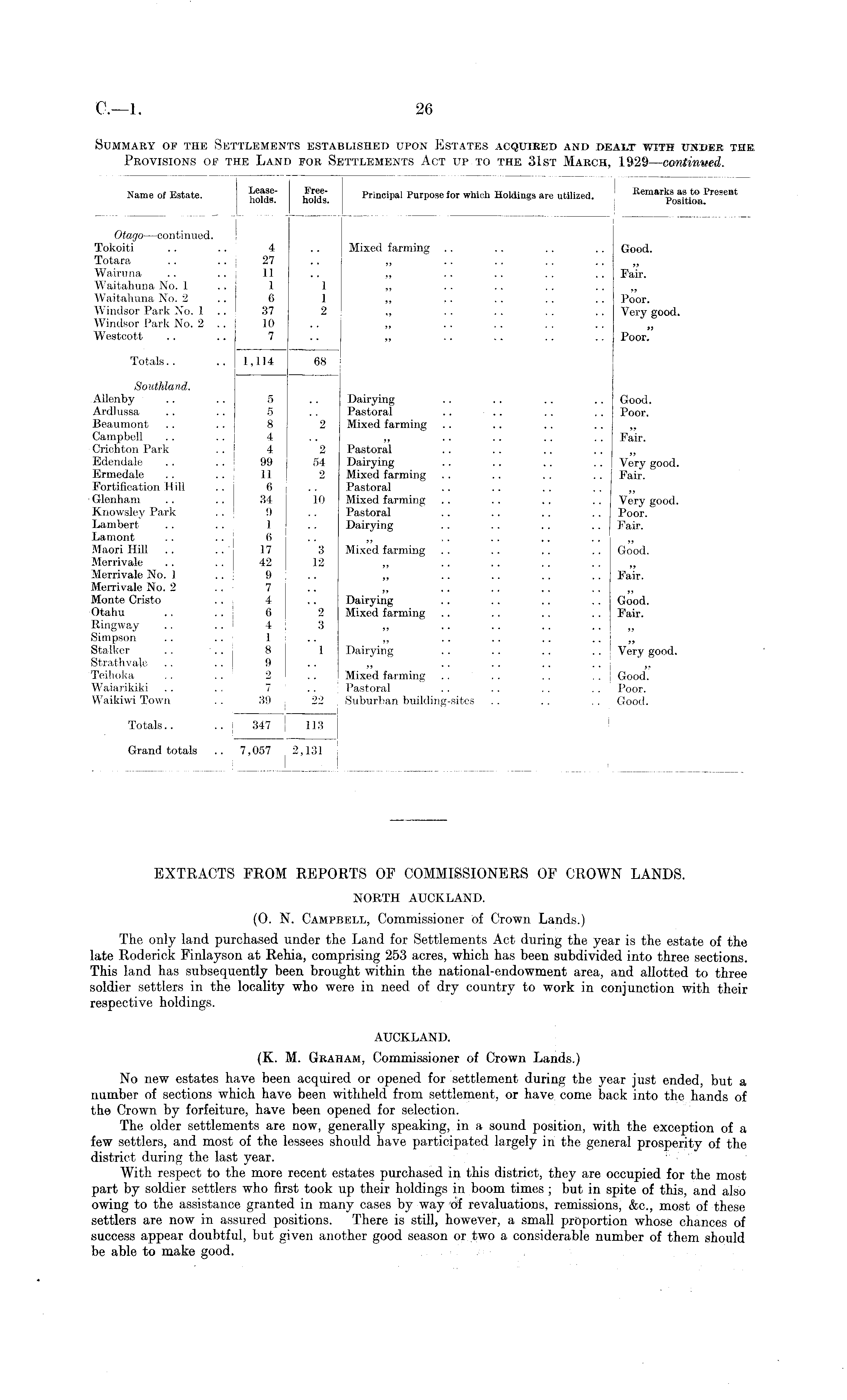 EXTRACTS FROM REPORTS OF COMMISSIONERS OF CROWN LANDS. NORTH AUCKLAND. (0. N. Campbell, Commissioner of Crown Lands.) The only land purchased under the Land for Settlements Act during the year is the estate of the late Roderick Finlayson at Rehia, comprising 253 acres, which has been subdivided into three sections. This land has subsequently been brought within the national-endowment area, and allotted to three soldier settlers in the locality who were in need of dry country to work in conjunction with their respective holdings. AUCKLAND. (K. M. Graham, Commissioner of Crown Lands.) No new estates have been acquired or opened for settlement during the year just ended, but a number of sections which have been withheld from settlement, or have come back into the hands of the Crown by forfeiture, have been opened for selection. The older settlements are now, generally speaking, in a sound position, with the exception of a few settlers, and most of the lessees should have participated largely in the general prosperity of the district during the last year. With respect to the more recent estates purchased in this district, they are occupied for the most part by soldier settlers who first took up their holdings in boom times ; but in spite of this, and also owing to the assistance granted in many cases by way of revaluations, remissions, &c., most of these settlers are now in assured positions. There is still, however, a small proportion whose chances of success appear doubtful, but given another good season or two a considerable number of them should be able to make good.