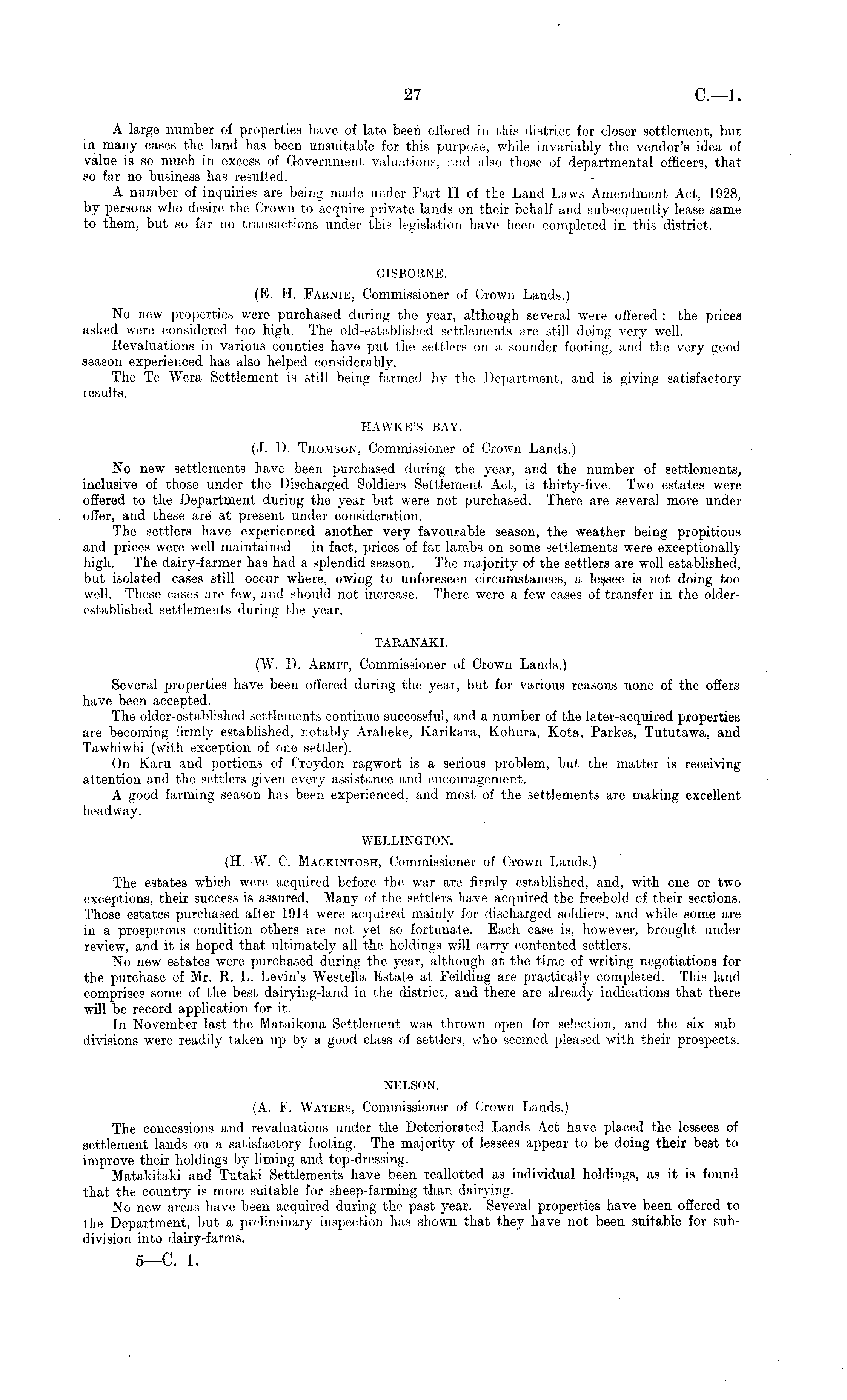 A large number of properties have of late been offered in this district for closer settlement, but in many cases the land has been unsuitable for this purpose, while invariably the vendor's idea of value is so much in excess of Government valuations, and also those of departmental officers, that so far no business has resulted. A number of inquiries are being made under Part II of the Land Laws Amendment Act, 1928, by persons who desire the Crown to acquire private lands on their behalf and subsequently lease same to them, but so far no transactions under this legislation have been completed in this district. GISBORNE. (E. H. Farnie, Commissioner of Crown Lands.) No new properties were purchased during the year, although several were offered : the prices asked were considered too high. The old-established settlements are still doing very well. Revaluations in various counties have put the settlers on a sounder footing, and the very good season experienced has also helped considerably. The Te Wera Settlement is still being farmed by the Department, and is giving satisfactory results. HAWKE'S BAY. (J. D. Thomson, Commissioner of Crown Lands.) No new settlements have been purchased during the year, and the number of settlements, inclusive of those under the Discharged Soldiers Settlement Act, is thirty-five. Two estates were offered to the Department during the year but were not purchased. There are several more under offer, and these are at present under consideration. The settlers have experienced another very favourable season, the weather being propitious and prices were well maintained —in fact, prices of fat lambs on some settlements were exceptionally high. The dairy-farmer has had a splendid season. The majority of the settlers are well established, but isolated cases still occur where, owing to unforeseen circumstances, a lessee is not doing too well. These cases are few, and should not increase. There were a few cases of transfer in the olderestablished settlements during the year. TARANAKI. (W. D. Armit, Commissioner of Crown Lands.) Several properties have been offered during the year, but for various reasons none of the offers have been accepted. The older-established settlements continue successful, and a number of the later-acquired properties are becoming firmly established, notably Araheke, Karikara, Kohura, Kota, Parkes, Tututawa, and Tawhiwhi (with exception of one settler). On Karu and portions of Croydon ragwort is a serious problem, but the matter is receiving attention and the settlers given every assistance and encouragement. A good farming season has been experienced, and most of the settlements are making excellent headway. WELLINGTON. (H. W. C. Mackintosh, Commissioner of Crown Lands.) The estates which were acquired before the war are firmly established, and, with one or two exceptions, their success is assured. Many of the settlers have acquired the freehold of their sections. Those estates purchased after 1914 were acquired mainly for discharged soldiers, and while some are in a prosperous condition others are not yet so fortunate. Each case is, however, brought under review, and it is hoped that ultimately all the holdings will carry contented settlers. No new estates were purchased during the year, although at the time of writing negotiations for the purchase of Mr. R. L. Levin's Westella Estate at Feilding are practically completed. This land comprises some of the best dairying-land in the district, and there are already indications that there will be record application for it. In November last the Mataikona Settlement was thrown open for selection, and the six subdivisions were readily taken up by a good class of settlers, who seemed pleased with their prospects. NELSON. (A. E. Waters, Commissioner of Crown Lands.) The concessions and revaluations under the Deteriorated Lands Act have placed the lessees of settlement lands on a satisfactory footing. The majority of lessees appear to be doing their best to improve their holdings by liming and top-dressing. Matakitaki and Tutaki Settlements have been reallotted as individual holdings, as it is found that the country is more suitable for sheep-farming than dairying. No new areas have been acquired during the past year. Several properties have been offered to the Department, but a preliminary inspection has shown that they have not been suitable for subdivision into dairy-farms.