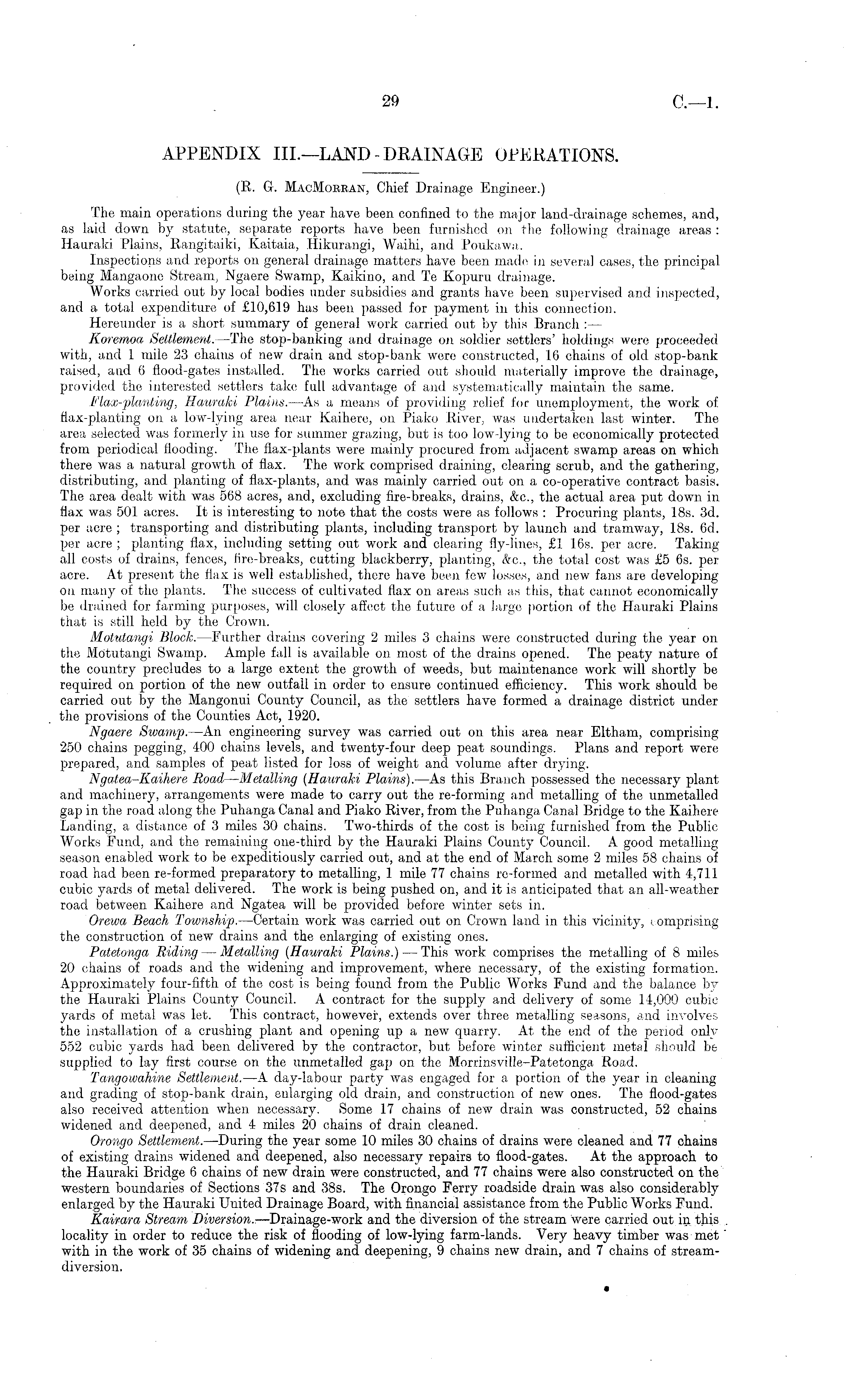 APPENDIX lII.—LAND - DRAINAGE OPERATIONS. (R. G. MacMorran, Chief Drainage Engineer.) The main operations during the year have been confined to the major land-drainage schemes, and, as laid down by statute, separate reports have been furnished on the following drainage areas : Hauraki Plains, Rangitaiki, Kaitaia, Hikurangi, Waihi, and Poukawa. Inspections and reports 011 general drainage matters have been made in several cases, the principal being Mangaone Stream, Ngaere Swamp, Kaikino, and Te Kopuru drainage. Works carried out by local bodies under subsidies and grants have been supervised and inspected, and a total expenditure of £10,619 has been passed for payment in this connection. Hereunder is a short summary of general work carried out by this Branch : — Koremoa Settlement. —The stop-banking and drainage 011 soldier settlers' holdings were proceeded with, and 1 mile 23 chains of new drain and stop-bank were constructed, 16 chains of old stop-bank raised, and 6 flood-gates installed. The works carried out should materially improve the drainage, provided the interested settlers take full advantage of and systematically maintain the same. Flax-planting, Hauraki Plains. —As a means of providing relief for unemployment, the work of flax-planting on a low-lying area near Kaihere, on Piako River, was undertaken last winter. The area selected was formerly in use for summer grazing, but is too low-lying to be economically protected from periodical flooding. The flax-plants were mainly procured from adjacent swamp areas on which there was a natural growth of flax. The work comprised draining, clearing scrub, and the gathering, distributing, and planting of flax-plants, and was mainly carried out on a co-operative contract basis. The area dealt with was 568 acres, and, excluding fire-breaks, drains, &c., the actual area put down in flax was 501 acres. It is interesting to note that the costs were as follows : Procuring plants, 18s. 3d. per acre ; transporting and distributing plants, including transport by launch and tramway, 18s. 6d. per acre ; planting flax, including setting out work and clearing fly-lines, £1 16s. per acre. Taking all costs of drains, fences, fire-breaks, cutting blackberry, planting, &c., the total cost was £5 6s. per acre. At present the flax is well established, there have been few losses, and new fans are developing on many of the plants. The success of cultivated flax on areas such as this, that cannot economically be drained for farming purposes, will closely affect the future of a large portion of the Hauraki Plains that is still held by the Crown. Motutangi Block. —Further drains covering 2 miles 3 chains were constructed during the year on the Motutangi Swamp. Ample fall is available on most of the drains opened. The peaty nature of the country precludes to a large extent the growth of weeds, but maintenance work will shortly be required on portion of the new outfall in order to ensure continued efficiency. This work should be carried out by the Mangonui County Council, as the settlers have formed a drainage district under the provisions of the Counties Act, 1920. Ngaere Swamp. —An engineering survey was carried out on this area near Eltham, comprising 250 chains pegging, 400 chains levels, and twenty-four deep peat soundings. Plans and report were prepared, and samples of peat listed for loss of weight and volume after drying. Ngatea-Kaihere Road —Metalling (Hauraki Plains). —As this Branch possessed the necessary plant and machinery, arrangements were made to carry out the re-forming and metalling of the unmetalled gap in the road along the Puhanga Canal and Piako River, from the Puhanga Canal Bridge to the Kaihere Landing, a distance of 3 miles 30 chains. Two-thirds of the cost is being furnished from the Public Works Fund, and the remaining one-third by the Hauraki Plains County Council. A good metalling season enabled work to be expeditiously carried out, and at the end of March some 2 miles 58 chains of road had been re-formed preparatory to metalling, 1 mile 77 chains re-formed and metalled with 4,711 cubic yards of metal delivered. The work is being pushed on, and it is anticipated that an all-weather road between Kaihere and Ngatea will be provided before winter sets in. Orewa Beach Township.—Certain work was carried out on Crown land in this vicinity, comprising the construction of new drains and the enlarging of existing ones. Patetonga Hiding — Metalling (Hauraki Plains.) — ; This work comprises the metalling of 8 miles 20 chains of roads and the widening and improvement, where necessary, of the existing formation. Approximately four-fifth of the cost is being found from the Public Works Fund and the balance by the Hauraki Plains County Council. A contract for the supply and delivery of some 14,000 cubic yards of metal was let. This contract, however, extends over three metalling seasons, and involves the installation of a crushing plant and opening up a new quarry. At the end of the period only 552 cubic yards had been delivered by the contractor, but before winter sufficient metal should be supplied to lay first course on the unmetalled gap on the Morrinsville-Patetonga Road. Tangowahine Settlement.—A day-labour party was engaged for a portion of the year in cleaning and grading of stop-bank drain, enlarging old drain, and construction of new ones. The flood-gates also received attention when necessary. Some 17 chains of new drain was constructed, 52 chains widened and deepened, and 4 miles 20 chains of drain cleaned. Orongo Settlement. —During the year some 10 miles 30 chains of drains were cleaned and 77 chains of existing drains widened and deepened, also necessary repairs to flood-gates. At the approach to the Hauraki Bridge 6 chains of new drain were constructed, and 77 chains were also constructed on the western boundaries of Sections 37s and 38s. The Orongo Ferry roadside drain was also considerably enlarged by t