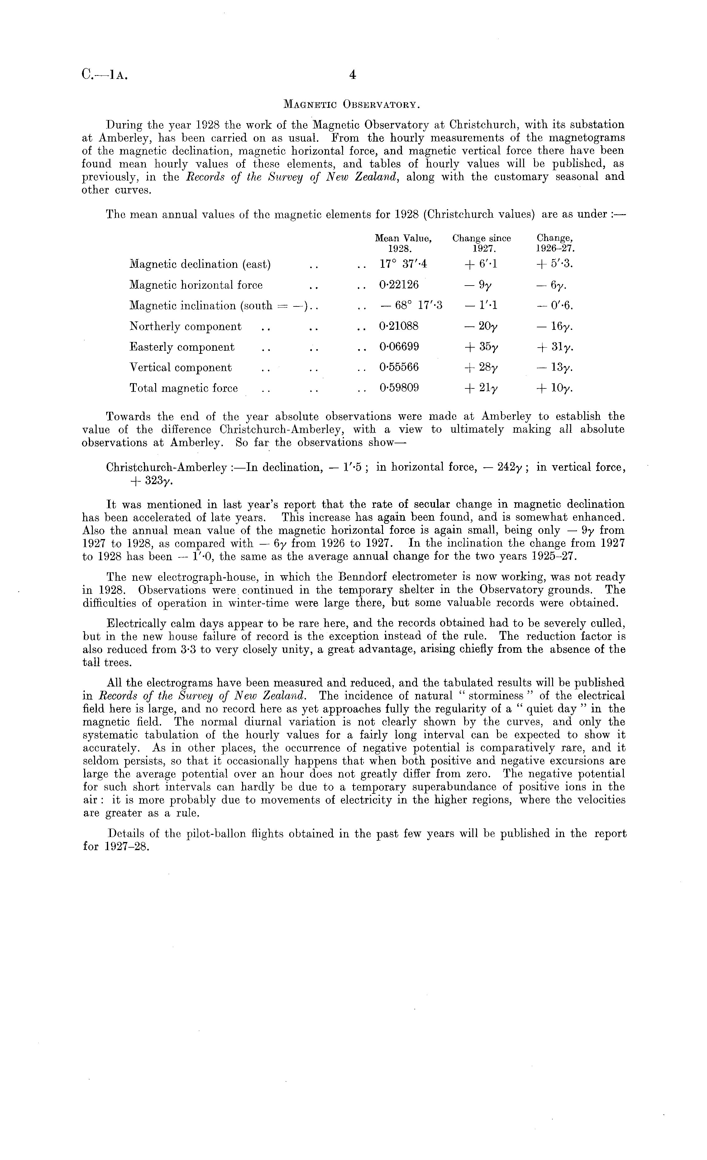 Magnetic Observatory. During the year 1928 the work of the Magnetic Observatory at Christchurch, with its substation at Amberley, has been carried on as usual. From the hourly measurements of the magnetograms of the magnetic declination, magnetic horizontal force, and magnetic vertical force there have been found mean hourly values of these elements, and tables of hourly values will be published, as previously, in the Records of the Survey of New Zealand, along with the customary seasonal and other curves. The mean annual values of the magnetic elements for 1928 (Christchurch values) are as under : — Mean Value, Change since Change, 1928. 1927. 1926-27. Magnetic declination (east) .. .. 17° 37'-4 + 6'-l + s'-3. Magnetic horizontal force .. .. 0-22126 —9y — 6y. Magnetic inclination (south = —).. . . — 68° 17'-3 — l'-l — o'-6. Northerly component .. .. .. 0-21088 — 20y — 16y. Easterly component .. .. .. 0-06699 + 35y +31 y. Vertical component .. .. . . 0-55566 -j- 28y — 13y. Total magnetic force . . .. . . 0-59809 + 21y -f- lOy. Towards the end of the year absolute observations were made at Amberley to establish the value of the difference Christchurch-Amberley, with a view to ultimately making all absolute observations at Amberley. So far the observations show— Christchurch-Amberley In declination, — l'-5 ;in horizontal force, — 242y ;in vertical force, + 323y. It was mentioned in last year's report that the rate of secular change in magnetic declination has been accelerated of late years. This increase has again been found, and is somewhat enhanced. Also the annual mean value of the magnetic horizontal force is again small, being only — 9y from 1927 to 1928, as compared with —6y from 1926 to 1927. In the inclination the change from 1927 to 1928 has been — l'-0, the same as the average annual change for the two years 1925-27. The new electrograph-house, in which the Benndorf electrometer is now working, was not ready in 1928. Observations were. continued in the temporary shelter in the Observatory grounds. The difficulties of operation in winter-time were large there, but some valuable records were obtained. Electrically calm days appear to be rare here, and the records obtained had to be severely culled, but in the new house failure of record is the exception instead of the rule. The reduction factor is also reduced from 3-3 to very closely unity, a great advantage, arising chiefly from the absence of the tall trees. All the electrograms have been measured and reduced, and the tabulated results will be published in Records of the Survey of New Zealand. The incidence of natural " storminess " of the electrical field here is large, and no record here as yet approaches fully the regularity of a " quiet day " in the magnetic field. The normal diurnal variation is not clearly shown by the curves, and only the systematic tabulation of the hourly values for a fairly long interval can be expected to show it accurately. As in other places, the occurrence of negative potential is comparatively rare, and it seldom persists, so that it occasionally happens that when both positive and negative excursions are large the average potential over an hour does not greatly differ from zero. The negative potential for such short intervals can hardly be due to a temporary superabundance of positive ions in the air : it is more probably due to movements of electricity in the higher regions, where the velocities are greater as a rule. Details of the pilot-ballon flights obtained in the past few years will be published in the report for 1927-28.