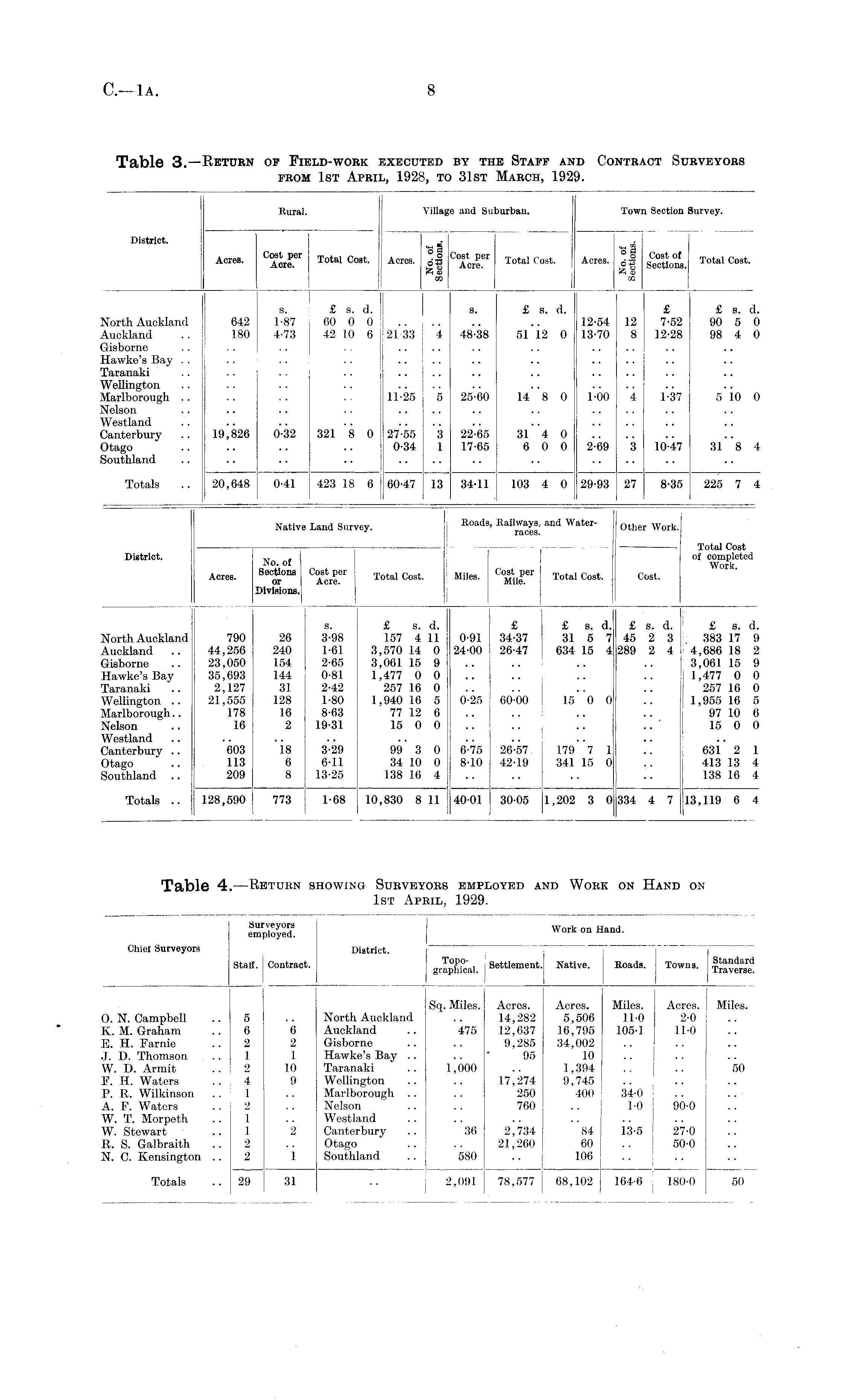 Rural. Village and Suburban. Town Section Survey. District. | Acres. j Total Coat. Acres. Co fP er Total Cost. Acres. °| g C ° B t [ 0 °' Total Cost. fe S , s CO CQ s £ s. d s. £ s d £ £ s cl North Auckland 642 1-87 60 0 0 .. 12-54 12 7-52 90 5 0 Auckland .. 180 4-73 42 10 6 21 33 4 48-38 51 12 0 13-70 8 12-28 98 4 0 Gisborne Hawke's Bay Taranaki .. ... Wellington Marlborough .. . . . . . . 11-25 5 25-60 14 8 0 1-00 4 1-37 5 10 0 Nelson Westland Canterbury .. 19,826 0-32 321 8 0 27-55 3 22-65 31 4 0 Otago .. .. .. .. 0-34 1 17-65 6 0 0 2-69 3 10-47 31 8 4 Southland Totals .. 20,648 0-41 423 18 6 60-47 13 34-11 103 4 0 29-93 27 8-35 225 7 4 Native Land Survey. i B-oads, Railways, and Water- other Work. . I - Total Cost District. ,, , of completed No. of Work Acres. Sec £ onB C^ r P er Total Cost. Miles. ' Co^ u P er Total Cost. Cost. Divisions. ,_\ I s £ s d £ £ s d £ s d £ s d. North Auckland 790 26 3-98 157 4 11 0-91 34-37 31 5 7 45 2 3 383 17 9 Auckland .. 44,256 240 1-61 3,570 14 0 24-00 26-47 634 15 4 289 2 4 4,686 18 2 Gisborne .. 23,050 154 2-65 3,061 15 9 .. .. .. .. 3,061 15 9 Hawke's Bay 35,693 144 0-81 1,477 0 0 .. .. .. .. 1,477 0 0 Taranaki .. 2,127 31 2-42 257 16 0 .. .. .. .. 257 16 0 Wellington .. 21,555 128 1-80 1,940 16 5 0-25 60-00 15 0 0 .. 1,955 16 5 Marlborough.. 178 16 8-63 77 12 6 .. .. .. .. 97 10 6 Nelson .. 16 2 19-31 15 0 0 .. .. .. . . 15 0 0 Westland Canterbury .. 603 18 3-29 99 3 0 6-75 26-57 179 7 1 .. 631 2 1 Otago .. 113 6 6-11 34 10 0 8-10 42-19 341 15 0 .. 413 13 4 Southland .. 209 8 13-25 138 16 4 .. .. .. .. 138 16 4 Totals .. 128,590 773 1-68 10,830 8 11 40-01 30-05 1,202 3 0 334 4 7 13,119 6 4