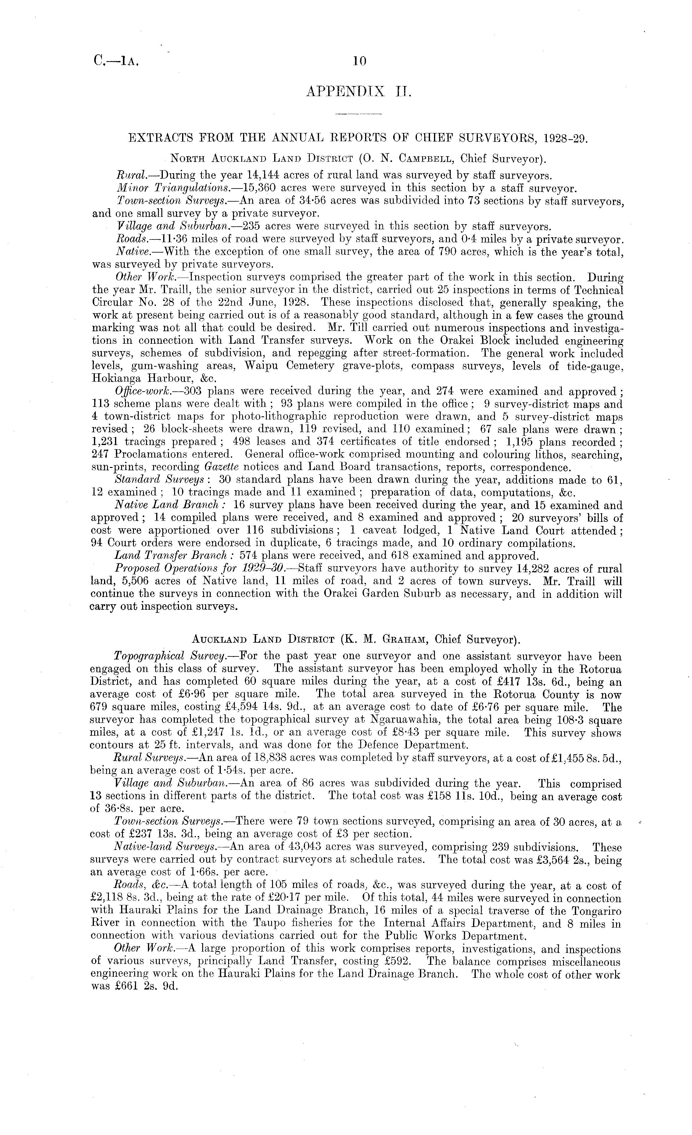 APPENDIX 11. EXTRACTS FROM THE ANNUAL REPORTS OF CHIEF SURVEYORS, 1928-29. North Auckland Land District (0. N. Campbell, Chief Surveyor). Rural. —During the year 14,144 acres of rural land was surveyed by staff surveyors. Minor Triangidations.—ls,36o acres were surveyed in this section by a staff surveyor. Town-section Surveys. —An area of 34-56 acres was subdivided into 73 sections by staff surveyors, and one small survey by a private surveyor. Village and Suburban.—23s acres were surveyed in this section by staff surveyors. Roads.—ll-36 miles of road were surveyed by staff surveyors, and 0-4 miles by a private surveyor. Native. —With the exception of one small survey, the area of 790 acres, which is the year's total, was surveyed by private surveyors. Other Work. —Inspection surveys comprised the greater part of the work in this section. During the year Mr. Traill, the senior surveyor in the district, carried out 25 inspections in terms of Technical Circular No. 28 of the 22nd June, 1928. These inspections disclosed that, generally speaking, the work at present being carried out is of a reasonably good standard, although in a few cases the ground marking was not all that could be desired. Mr. Till carried out numerous inspections and investigations in connection with Land Transfer surveys. Work on the Orakei Block included engineering surveys, schemes of subdivision, and repegging after street-formation. The general work included levels, gum-washing areas, Waipu Cemetery grave-plots, compass surveys, levels of tide-gauge, Hokianga Harbour, &c. Office-work. —303 plans were received during the year, and 274 were examined and ajjproved ; 113 scheme plans were dealt with ; 93 plans were compiled in the office; 9 survey-district maps and 4 town-district maps for photo-lithographic reproduction were drawn, and 5 survey-district maps revised; 26 block-sheets were drawn, 119 revised, and 110 examined; 67 sale plans were drawn; 1,231 tracings prepared ; 498 leases and 374 certificates of title endorsed ; 1,195 plans recorded ; 247 Proclamations entered. General office-work comprised mounting and colouring lithos, searching, sun-prints, recording Gazette notices and Land Board transactions, reports, correspondence. Standard Surveys : 30 standard plans have been drawn during the year, additions made to 61, 12 examined ; 10 tracings made and 11 examined ; preparation of data, computations, &c. Native Land Branch : 16 survey plans have been received during the year, and 15 examined and approved ; 14 compiled plans were received, and 8 examined and approved ; 20 surveyors' bills of cost were apportioned over 116 subdivisions ; 1 caveat lodged, 1 Native Land Court attended ; 94 Court orders were endorsed in duplicate, 6 tracings made, and 10 ordinary compilations. Land Transfer Branch : 574 plans were received, and 618 examined and approved. Proposed Operations for 1929-30.—Staff surveyors have authority to survey 14,282 acres of rural land, 5,506 acres of Native land, 11 miles of road, and 2 acres of town surveys. Mr. Traill will continue the surveys in connection with the Orakei Garden Suburb as necessary, and in addition will carry out inspection surveys. Auckland Land District (K. M. Graham, Chief Surveyor). Topographical Survey.—For the past year one surveyor and one assistant surveyor have been engaged on this class of survey. The assistant surveyor has been employed wholly in the Rotor ua District, and has completed 60 square miles during the year, at a cost of £417 13s. 6d., being an average cost of £6-96 per square mile. The total area surveyed in the Rotorua County is now 679 square miles, costing £4,594 14s. 9d., at an average cost to date of £6-76 per square mile. The surveyor has completed the topographical survey at Ngaruawahia, the total area being 108-3 square miles, at a cost of £1,247 Is. Id., or an average cost of £8-43 per square mile. This survey shows contours at 25 ft. intervals, and was done for the Defence Department. Rural Surveys. —An area of 18,838 acres was completed by staff surveyors, at a cost of £1,455 Bs. 5d., being an average cost of l-545. per acre. Village and Suburban. —An area of 86 acres was subdivided during the year. This comprised 13 sections in different parts of the district. The total cost was £158 lis. 10d., being an average cost of 36-Bs. per acre. Town-section Surveys. —There were 79 town sections surveyed, comprising an area of 30 acres, at a. cost of £237 13s. 3d., being an average cost of £3 per section. Native-land Surveys.—An area of 43,043 acres was surveyed, comprising 239 subdivisions. These surveys were carried out by contract surveyors at schedule rates. The total cost was £3,564 25., being an average cost of l-665. per acre. Roads, &c. —A total length of 105 miles of roads, &c., was surveyed during the year, at a cost of £2,118 Bs. 3d., being at the rate of £20-17 per mile. Of this total, 44 miles were surveyed in connection with Ilauraki Plains for the Land Drainage Branch, 16 miles of a special traverse of the Tongariro River in connection with the Taupo fisheries for the Internal Affairs Department, and 8 miles in connection with various deviations carried out for the Public Works Department. Other Work.—A large proportion of this work comprises reports, investigations, and inspections of various surveys, principally Land Transfer, costing £592. The balance comprises miscellaneous engineering work on the Hauraki Plains for the Land Drainage Branch. The whole cost of other work was £661 2s. 9d.