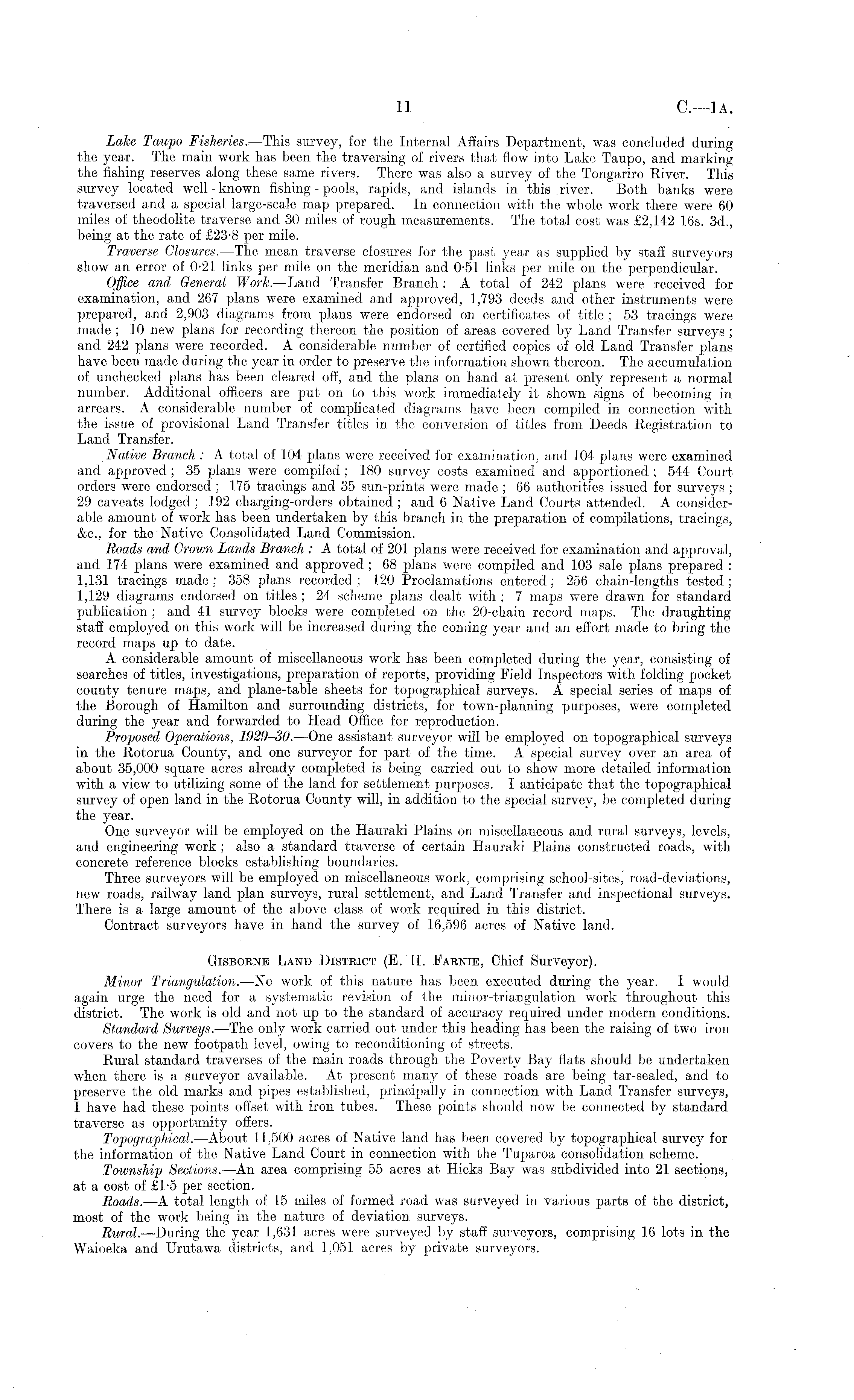 Lake Taupo Fisheries. —This survey, for the Internal Affairs Department, was concluded during the year. The main work has been the traversing of rivers that flow into Lake Taupo, and marking the fishing reserves along these same rivers. There was also a survey of the Tongariro River. This survey located well-known fishing - pools, rapids, and islands in this river. Both banks were traversed and a special large-scale map prepared. In connection with the whole work there were 60 miles of theodolite traverse and 30 miles of rough measurements. The total cost was £2,142 16s. 3d., being at the rate of £23-8 per mile. Traverse Closures. —The mean traverse closures for the past year as supplied by staff surveyors show an error of 0-21 links per mile on the meridian and 0-51 links per mile on the perpendicular. Office and General Work.—Land Transfer Branch : A total of 242 plans were received for examination, and 267 plans were examined and approved, 1,793 deeds and other instruments were prepared, and 2,903 diagrams from plans were endorsed on certificates of title ; 53 tracings were made ; 10 new plans for recording thereon the position of areas covered by Land Transfer surveys ; and 242 plans were recorded. A considerable number of certified copies of old Land Transfer plans have been made during the year in order to preserve the information shown thereon. The accumulation of unchecked plans has been cleared off, and the plans on hand at present only represent a normal number. Additional officers are put on to this work immediately it shown signs of becoming in arrears. A considerable number of complicated diagrams have been compiled in connection with the issue of provisional Land Transfer titles in the conversion of titles from Deeds Registration to Land Transfer. Native Branch : A total of 104 plans were received for examination, and 104 plans were examined and approved ; 35 plans were compiled ; 180 survey costs examined and apportioned ; 544 Courtorders were endorsed ; 175 tracings and 35 sun-prints were made ; 66 authorities issued for surveys ; 29 caveats lodged ; 192 charging-orders obtained ; and 6 Native Land Courts attended. A considerable amount of work has been undertaken by this branch in the preparation of compilations, tracings, &c., for the Native Consolidated Land Commission. Roads and Crown Lands Branch : A total of 201 plans were received for examination and approval, and 174 plans were examined and approved; 68 plans were compiled and 103 sale plans prepared : 1,131 tracings made; 358 plans recorded; 120 Proclamations entered; 256 chain-lengths tested; 1,129 diagrams endorsed on titles ; 24 scheme plans dealt with ; 7 maps were drawn for standard publication ; and 41 survey blocks were comjdeted on the 20-chain record maps. The draughting staff employed on this work will be increased during the coming year and an effort made to bring the record maps up to date. A considerable amount of miscellaneous work has been completed during the year, consisting of searches of titles, investigations, preparation of reports, providing Field Inspectors with folding pocket county tenure maps, and plane-table sheets for topographical surveys. A special series of maps of the Borough of Hamilton and surrounding districts, for town-planning purposes, were completed during the year and forwarded to Head Office for reproduction. Proposed Operations, 1929-30.—One assistant surveyor will be employed on topographical surveys in the Rotorua County, and one surveyor for part of the time. A special survey over an area of about 35,000 square acres already completed is being carried out to show more detailed information with a view to utilizing some of the land for settlement purposes. I anticipate that the topographical survey of open land in the Rotorua County will, in addition to the special survey, be completed during the year. One surveyor will be employed on the Hauraki Plains on miscellaneous and rural surveys, levels, and engineering work ; also a standard traverse of certain Hauraki Plains constructed roads, with concrete reference blocks establishing boundaries. Three surveyors will be employed on miscellaneous work, comprising school-sites, road-deviations, new roads, railway land plan surveys, rural settlement, and Land Transfer and inspectional surveys. There is a large amount of the above class of work required in this district. Contract surveyors have in hand the survey of 16,596 acres of Native land. Gisborne Land District (E. H. Farnie, Chief Surveyor). Minor Triangulation. —No work of this nature has been executed during the year. I would again urge the need for a systematic revision of the minor-triangulation work throughout this district. The work is old and not up to the standard of accuracy required under modern conditions. Standard Surveys.—The only work carried out under this heading has been the raising of two iron covers to the new footpath level, owing to reconditioning of streets. Rural standard traverses of the main roads through the Poverty Bay flats should be undertaken when there is a surveyor available. At present many of these roads are being tar-sealed, and to preserve the old marks and pipes established, principally in connection with Land Transfer surveys, I have had these points offset with iron tubes. These points should now be connected by standard traverse as opportunity offers. Topographical.—About 11,500 acres of Native land has been covered by topographical survey for the information of the Native Land Court in connection with the Tuparoa consolidation scheme. Township Sections. —An area comprising 55 acres at Hicks Bay was subdivided into 21 sections, at a cost of £1-5 per section. Roads. —A total length of 15 miles of formed road was surveyed in various parts of the district, most of the work being in the nature of deviation surveys. Rural. —During the year 1,631 acres were surveyed by staff surveyors, comprising 16 lots in the Waio