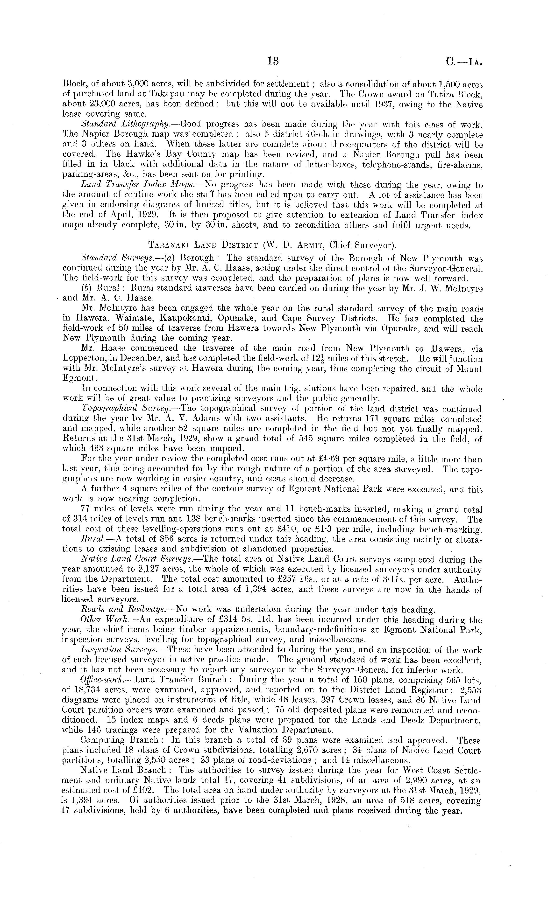 Block, of about 3,000 acres, will be subdivided for settlement; also a consolidation of about 1,500 acres of purchased land at Takapau may be completed during the year. The Crown award on T'utira Block, about 23,000 acres, has been defined ; but this will not be available until 1937, owing to the Native lease covering same. Standard Lithography.—Good progress has been made during the year with this class of work. The Napier Borough map was completed ; also 5 district 40-chain drawings, with 3 nearly complete and 3 others on hand. When these latter are complete about three-quarters of the district will be covered. The Hawke's Bay County map has been revised, and a Napier Borough pull has been filled in in black with additional data in the nature of letter-boxes, telephone-stands, fire-alarms, parking-areas, &c., has been sent on for printing. Land Transfer Index Maps. —No progress has been made with these during the year, owing to the amount of routine work the staff has been called upon to carry out. A lot of assistance has been given in endorsing diagrams of limited titles, but it is believed that this work will be completed at the end of April, 1929. It is then proposed to give attention to extension of Land Transfer index maps already complete, 30 in. by 30 in. sheets, and to recondition others and fulfil urgent needs. Taranaki Land District (W. D. Armit, Chief Surveyor). Standard Surveys.—(a) Borough : The standard survey of the Borough of New Plymouth was continued during the year by Mr. A. C. Haase, acting under the direct control of the Surveyor-General. The field-work for this survey was completed, and the preparation of plans is now well forward. (b) Rural: Rural standard traverses have been carried on during the year by Mr. J. W. Mclntyre and Mr. A. C. Haase. Mr. Mclntyre has been engaged the whole year on the rural standard survey of the main roads in Hawera, Waimate, Kaupokonui, Opunake, and Cape Survey Districts. He has completed the field-work of 50 miles of traverse from Hawera towards New Plymouth via Opunake, and will reach New Plymouth during the coming year. Mr. Haase commenced the traverse of the main road from New Plymouth to Hawera, via Lepperton, in December, and has completed the field-work of 12-| miles of this stretch. He will junction with Mr. Mclntyre's survey at Hawera during the coming year, thus completing the circuit of Mount Egmont. In connection with this work several of the main trig, stations have been repaired, and the whole work will be of great value to practising surveyors and the public generally. Topographical Survey. —The topographical survey of portion of the land district was continued during the year by Mr. A. V. Adams with two assistants. He returns 171 square miles completed and mapped, while another 82 square miles are completed in the field but not yet finally mapped. Returns at the 31st March, 1929, show a grand total of 545 square miles completed in the field, of which 463 square miles have been mapped. For the year under review the completed cost runs out at £4'69 per square mile, a little more than last year, this being accounted for by the rough nature of a portion of the area surveyed. The topographers are now working in easier country, and costs should decrease. A further 4 square miles of the contour survey of Egmont National Park were executed, and this work is now nearing completion. 77 miles of levels were run during the year and 11 bench-marks inserted, making a grand total of 314 miles of levels run and 138 bench-marks inserted since the commencement of this survey. The total cost of these levelling-operations runs out at £410, or £1-3 per mile, including bench-marking. Rural. —A total of 856 acres is returned under this heading, the area consisting mainly of alterations to existing leases and subdivision of abandoned properties. Native Land Court Surveys.—The total area of Native Land Court surveys completed during the year amounted to 2,127 acres, the whole of which was executed by licensed surveyors under authority from the Department. The total cost amounted to £257 165., or at a rate of 3-lls. per acre. Authorities have been issued for a total area of 1,394 acres, and these surveys are now in the hands of licensed surveyors. Roads and Railways.—No work was undertaken during the year under this heading. Other Work. —An expenditure of £314- ss. lid. has been incurred under this heading during the year, the chief items being timber appraisements, boundary-redefinitions at Egmont National Park, inspection surveys, levelling for topographical survey, and miscellaneous. Inspection Surveys.—These have been attended to during the year, and an inspection of the work of each licensed surveyor in active practice made. The general standard of w T ork has been excellent, and it has not been necessary to report any surveyor to the Surveyor-General for inferior work. Office-work. —Land Transfer Branch : During the year a total of 150 plans, comprising 565 lots, of 18,734 acres, were examined, approved, and reported on to the District Land Registrar ; 2,553 diagrams were placed on instruments of title, while 48 leases, 397 Crown leases, and 86 Native Land Court partition orders were examined and passed ; 75 old deposited plans were remounted and reconditioned. 15 index maps and 6 deeds plans were prepared for the Lands and Deeds Department, while 146 tracings were prepared for the Valuation Department. Computing Branch : In this branch a total of 89 plans were examined and approved. These plans included 18 plans of Crown subdivisions, totalling 2,670 acres ; 34 plans of Native Land Court partitions, totalling 2,550 acres ; 23 plans of road-deviations ; and 14 miscellaneous. Native Land Branch : The authorities to survey issued during the year for West Coast Settlement and ordinary Native lands total 17, covering 41 subdivisions, of an area of 2,990 acres, at an estimated cost of £402. The total area on hand und