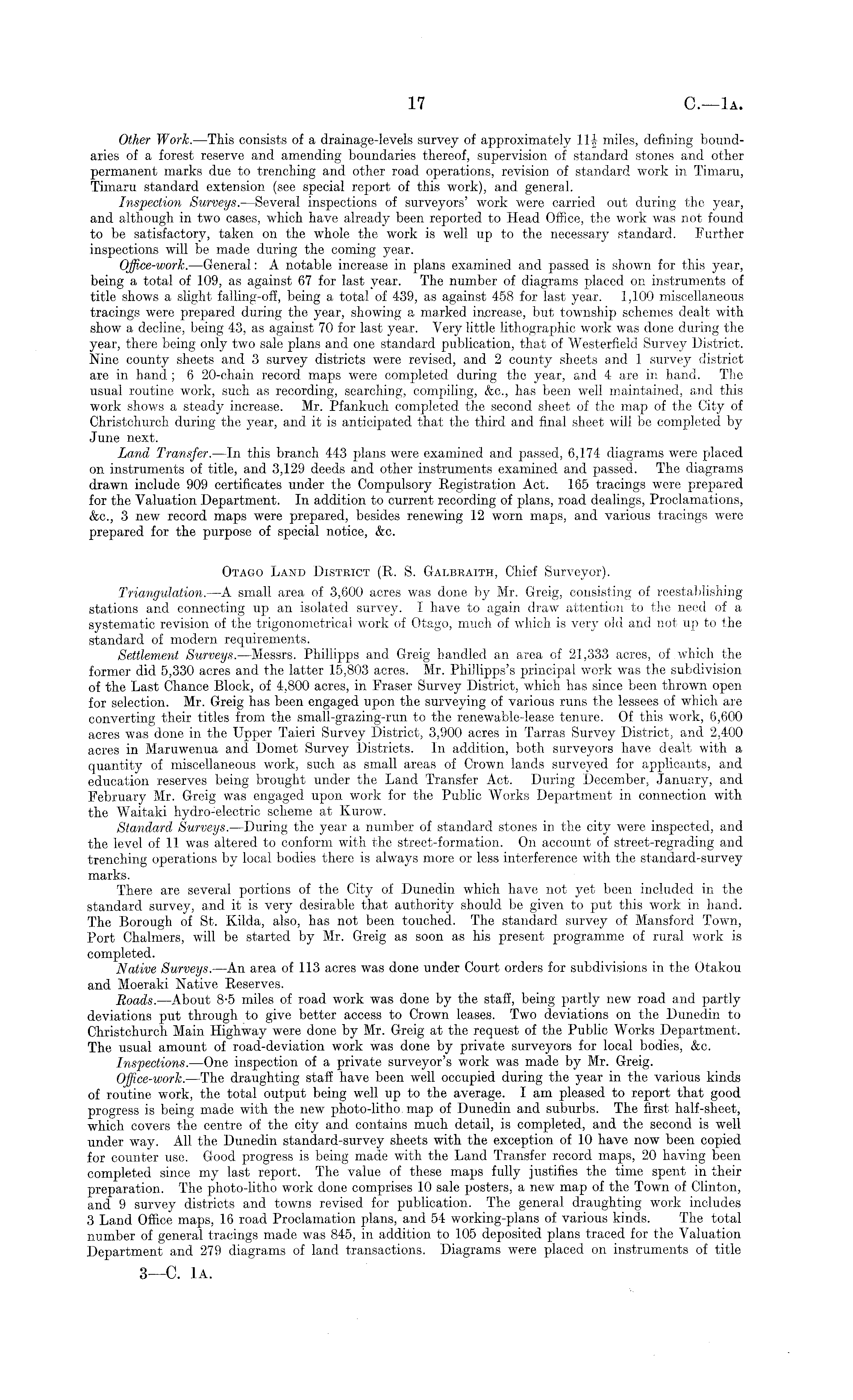 Other Work. —This consists of a drainage-levels survey of approximately lli miles, defining boundaries of a forest reserve and amending boundaries thereof, supervision of standard stones and other permanent marks due to trenching and other road operations, revision of standard work in Timaru, Timaru standard extension (see special report of this work), and general. Inspection Surveys.—Several inspections of surveyors' work were carried out during the year, and although in two cases, which have already been reported to Head Office, the work was not found to be satisfactory, taken on the whole the work is well up to the necessary standard. Further inspections will be made during the coming year. Office-work. —General: A notable increase in plans examined and passed is shown for this year, being a total of 109, as against 67 for last year. The number of diagrams placed on instruments of title shows a slight falling-off, being a total of 439, as against 458 for last year. 1,100 miscellaneous tracings were prepared during the year, showing a marked increase, but township schemes dealt with show a decline, being 43, as against 70 for last year. Very little lithographic work was done during the year, there being only two sale plans and one standard publication, that of Westerfield Survey District. Nine county sheets and 3 survey districts were revised, and 2 county sheets and 1 survey district are in hand ; 6 20-chain record maps were completed during the year, and 4- are in hand. The usual routine work, such as recording, searching, compiling, &c., has been well maintained, and this work shows a steady increase. Mr. Pfankuch completed the second sheet of the map of the City of Christchurch during the year, and it is anticipated that the third and final sheet will be completed by June next. Land Transfer. —In this branch 443 plans were examined and passed, 6,174 diagrams were placed on instruments of title, and 3,129 deeds and other instruments examined and passed. The diagrams drawn include 909 certificates under the Compulsory Registration Act. 165 tracings were prepared for the Valuation Department. In addition to current recording of plans, road dealings, Proclamations, &c., 3 new record maps were prepared, besides renewing 12 worn maps, and various tracings were prepared for the purpose of special notice, &c. Otago Land District (R. S. Galbraith, Chief Surveyor). Triangulation. —A small area of 3,600 acres was done by Mr. Greig, consisting of reestablishing stations and connecting up an isolated survey. I have to again draw attention to the need of a systematic revision of the trigonometrical work of Otago, much of which is very old and not up to the standard of modern requirements. Settlement Surveys. —Messrs. Phillipps and Greig handled an area of 21,333 acres, of which the former did 5,330 acres and the latter 15,803 acres. Mr. PhiJlipps's principal work was the subdivision of the Last Chance Block, of 4,800 acres, in Eraser Survey District, which has since been thrown open for selection. Mr. Greig has been engaged upon the surveying of various runs the lessees of which are converting their titles from the small-grazing-run to the renewable-lease tenure. Of this work, 6,600 acres was done in the Upper Taieri Survey District, 3,900 acres in Tarras Survey District, and 2,400 acres in Maruwenua and Domet Survey Districts. In addition, both surveyors have dealt with a quantity of miscellaneous work, such as small areas of Crown lands surveyed for applicants, and education reserves being brought under the Land Transfer Act. During December, January, and February Mr. Greig was engaged upon work for the Public Works Department in connection with the Waitaki hydro-electric scheme at Ivurow. Standard Surveys. —During the year a number of standard stones in the city were inspected, and the level of 11 was altered to conform with the street-formation. On account of street-regrading and trenching operations by local bodies there is always more or less interference with the standard-survey marks. There are several portions of the City of Dunedin which have not yet been included in the standard survey, and it is very desirable that authority should be given to put this work in hand. The Borough of St. Kilda, also, has not been touched. The standard survey of Mansford Town, Port Chalmers, will be started by Mr. Greig as soon as his present programme of rural work is completed. Native Surveys. —An area of 113 acres was done under Court orders for subdivisions in the Otakou and Moeraki Native Reserves. Roads. —About 8-5 miles of road work was done by the staff, being partly new road and partly deviations put through to give better access to Crown leases. Two deviations on the Dunedin to Christchurch Main Highway were done by Mr. Greig at the request of the Public Works Department. The usual amount of road-deviation work was done by private surveyors for local bodies, &c. Inspections. —One inspection of a private surveyor's work was made by Mr. Greig. Office-work. —The draughting staff have been well occupied during the year in the various kinds of routine work, the total output being well up to the average. I am pleased to report that good progress is being made with the new photo-litho map of Dunedin and suburbs. The first half-sheet, which covers the centre of the city and contains much detail, is completed, and the second is well under way. All the Dunedin standard-survey sheets with the exception of 10 have now been copied for counter use. Good progress is being made with the Land Transfer record maps, 20 having been completed since my last report. The value of these maps fully justifies the time spent in their preparation. The photo-litho work done comprises 10 sale posters, a new map of the Town of Clinton, and 9 survey districts and towns revised for publication. The general draughting work includes 3 Land Office maps, 16 road Proclamation plans, and 54 working-plans of vari
