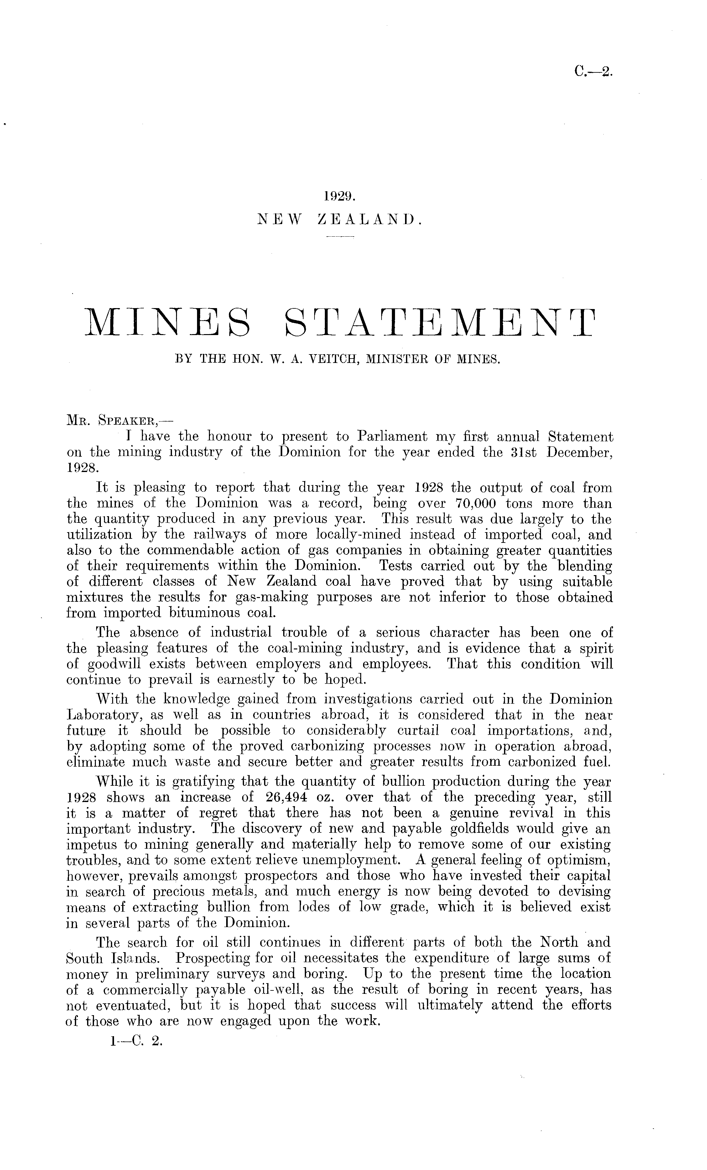 Mr. Speaker,— 1 have the honour to present to Parliament my first annual Statement on the mining industry of the Dominion for the year ended the 31st December, 1928. It is pleasing to report that during the year 1928 the output of coal from the mines of the Dominion was a record, being over 70,000 tons more than the quantity produced in any previous year. This result was due largely to the utilization by the railways of more locally-mined instead of imported coal, and also to the commendable action of gas companies in obtaining greater quantities of their requirements within the Dominion. Tests carried out by the blending of different classes of New Zealand coal have proved that by using suitable mixtures the results for gas-making purposes are not inferior to those obtained from imported bituminous coal. The absence of industrial trouble of a serious character has been one of the pleasing features of the coal-mining industry, and is evidence that a spirit of goodwill exists between employers and employees. That this condition will continue to prevail is earnestly to be hoped. With the knowledge gained from investigations, carried out in the Dominion Laboratory, as well as in countries abroad, it is considered that in the near future it should be possible to considerably curtail coal importations, and, by adopting some of the proved carbonizing processes now in operation abroad, eliminate much waste and secure better and greater results from carbonized fuel. While it is gratifying that the quantity of bullion production during the year 1928 shows an increase of 26,494 oz. over that of the preceding year, still it is a matter of regret that there has not been a genuine revival in this important industry. The discovery of new and payable goldfields would give an impetus to mining generally and materially help to remove some of our existing troubles, and to some extent relieve unemployment. A general feeling of optimism, however, prevails amongst prospectors and those who have invested their capital in search of precious metals, and much energy is now being devoted to devising means of extracting bullion from lodes of low grade, which it is believed exist in several parts of the Dominion. The search for oil still continues in different parts of both the North and South Islands. Prospecting for oil necessitates the expenditure of large sums of money in preliminary surveys and boring. Up to the present time the location of a commercially payable oil-well, as the result of boring in recent years, has not eventuated, but it is hoped that success will ultimately attend the efforts of those who are now engaged upon the work.