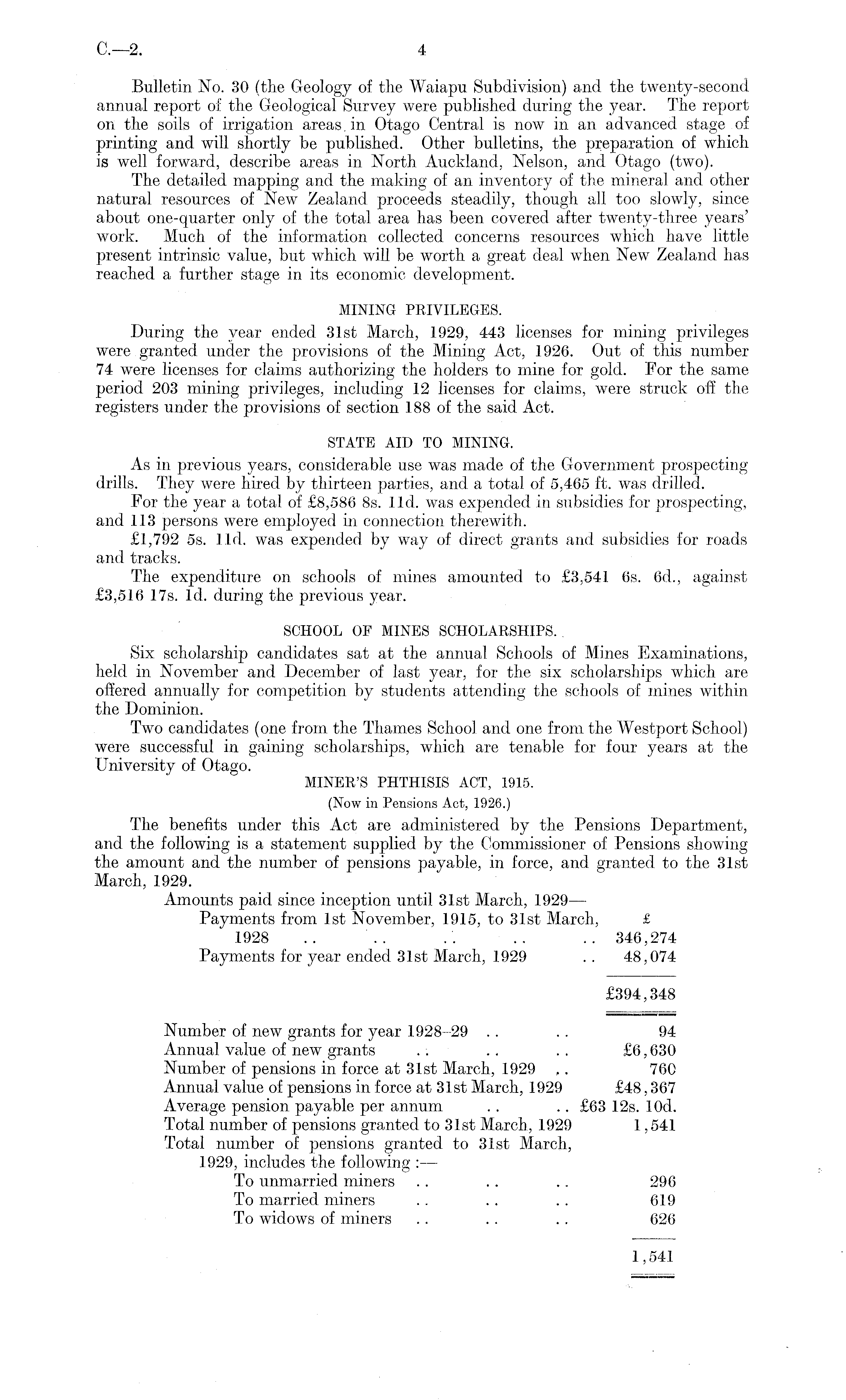 Bulletin No. 30 (the Geology of the Waiapu Subdivision) and the twenty-second annual report of the Geological Survey were published during the year. The report on the soils of irrigation areas. in Otago Central is now in an advanced stage of printing and will shortly be published. Other bulletins, the preparation of which is well forward, describe areas in North Auckland, Nelson, and Otago (two). The detailed mapping and the making of an inventory of the mineral and other natural resources of New Zealand proceeds steadily, though all too slowly, since about one-quarter only of the total area has been covered after twenty-three years' work. Much of the information collected concerns resources which have little present intrinsic value, but which will be worth a great deal when New Zealand has reached a further stage in its economic development. MINING PRIVILEGES. During the year ended 31st March, 1929, 443 licenses for mining privileges were granted under the provisions of the Mining Act, 1926. Out of this number 74 were licenses for claims authorizing the holders to mine for gold. For the same period 203 mining privileges, including 12 licenses for claims, were struck off the registers under the provisions of section 188 of the said Act. STATE AID TO MINING. As in previous years, considerable use was made of the Government prospecting drills. They were hired by thirteen parties, and a total of 5,465 ft. was drilled. For the year a total of £8,586 Bs. lid. was expended in subsidies for prospecting, and 113 persons were employed in connection therewith. £1,792 ss. lid. was expended by way of direct grants and subsidies for roads and tracks. The expenditure on schools of mines amounted to £3,541 6s. 6d., against £3,516 17s. Id. during the previous year. SCHOOL OF MINES SCHOLARSHIPS. Six scholarship candidates sat at the annual Schools of Mines Examinations, held in November and December of last year, for the six scholarships which are offered annually for competition by students attending the schools of mines within the Dominion. Two candidates (one from the Thames School and one from the Westport School) were successful in gaining scholarships, which are tenable for four years at the University of Otago. MINER'S PHTHISIS ACT, 1915. (Now in Pensions Act, 1926.) The benefits under this Act are administered by the Pensions Department, and the following is a statement supplied by the Commissioner of Pensions showing the amount and the number of pensions payable, in force, and granted to the 31st March, 1929. Amounts paid since inception until 31st March, 1929 — Payments from Ist November, 1915, to 31st March, £ 1928 . . .. .. .. .. 346,274 Payments for year ended 31st March, 1929 . . 48,074 £394,348 Number of new grants for year 1928-29 . . . . 94 Annual value of new grants . . . . . . £6,630 Number of pensions in force at 31st March, 1929 ~ 760 Annual value of pensions in force at 31st March, 1929 £48,367 Average pension payable per annum . . .. £63 12s. lOd. Total number of pensions granted to 31st March, 1929 1,541 Total number of pensions granted to 31st March, 1929, includes the following : — To unmarried miners . . . . .. 296 To married miners .. .. . . 619 To widows of miners .. . . .. 626 1,541