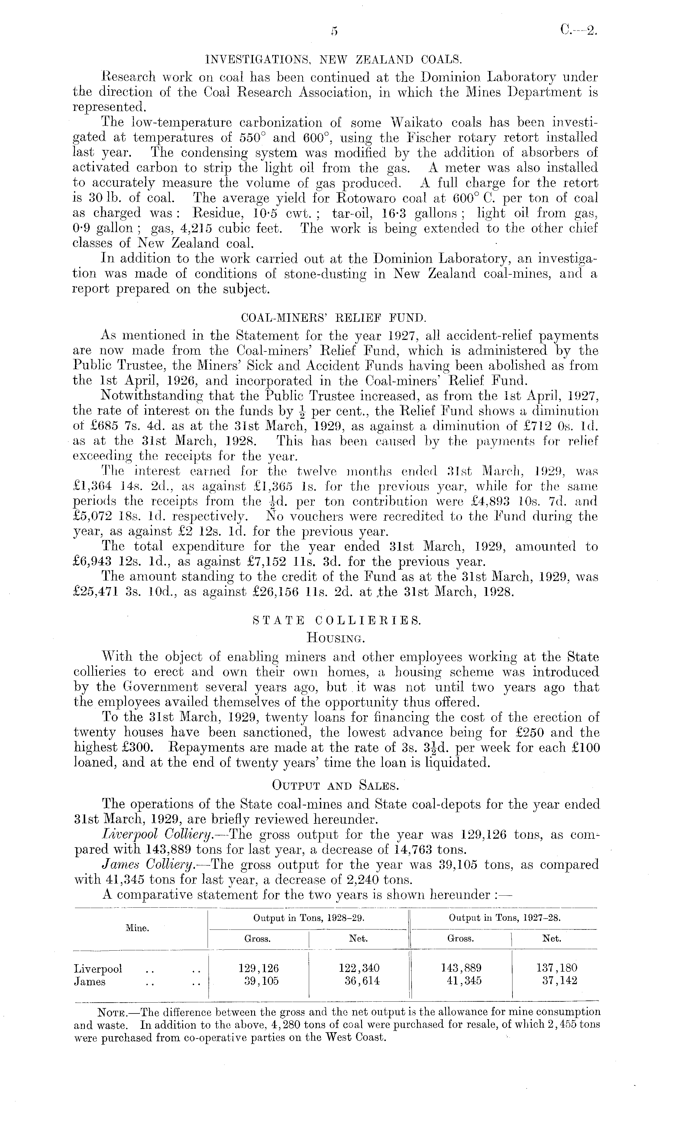INVESTIGATIONS, NEW ZEALAND COALS. -Research work on coal has been continued at the Dominion Laboratory under the direction of the Coal Research Association, in which the Mines Department is represented. The low-temperature carbonization of some Waikato coals has been investigated at temperatures of 550° and 600°, using the Fischer rotary retort installed last year. The condensing system was modified by the addition of absorbers of activated carbon to strip the light oil from the gas. A meter was also installed to accurately measure the volume of gas produced. A full charge for the retort is 30 lb. of coal. The average yield for Rotowaro coal at 600° C. per ton of coal as charged was : Residue, 10-5 cwt. ; tar-oil, 16-3 gallons ; light oil from gas, 0-9 gallon; gas, 4,215 cubic feet. The work is being extended to the other chief classes of New Zealand coal. In addition to the work carried out at the Dominion Laboratory, an investigation was made of conditions of stone-dusting in New Zealand coal-mines, and a report prepared on the subject. COAL-MINERS' RELIEF FUND. As mentioned in the Statement for the year 1927, all accident-relief payments are now made from the Coal-miners' Relief Fund, which is administered by the Public Trustee, the Miners' Sick and Accident Funds having been abolished as from the Ist April, 1926, and incorporated in the Goal-miners' Relief Fund. Notwithstanding that the Public Trustee increased, as from the Ist April, 1927, the rate of interest on the funds by | per cent., the Relief Fund shows a diminution of £685 7s. 4d. as at the 31st March, 1929, as against a diminution of £712 os. Id. as at the 31st March, 1928. This has been caused by the payments for relief exceeding the receipts for the year. The interest earned for the twelve months ended 31st March, 1929, was £.1,364 14s. 2d., as against £1,365 Is. for the previous year, while for the same periods the receipts from the |-d. per ton contribution were £4,893 10s. 7d. and £5,072 18s. Id. respectively. No vouchers were recredited to the Fund during the year, as against £2 12s. Id. for the previous year. The total expenditure for the year ended 31st March, 1929, amounted to £6,943 12s. Id., as against £7,152 lis. 3d. for the previous year. The amount standing to the credit of the Fund as at the 31st March, 1929, was £25,471 3s. Iod., as against £26,156 lis. 2d. at the 31st March, 1928. STATE COLLIERIES. Housing. With the object of enabling miners and other employees working at the State collieries to erect and own their own homes, a housing scheme was introduced by the Government several years ago, but .it was not until two years ago that the employees availed themselves of the opportunity thus offered. To the 31st March, 1929, twenty loans for financing the cost of the erection of twenty houses have been sanctioned, the lowest advance being for £250 and the highest £300. Repayments are made at the rate of 3s. 3jd. per week for each £100 loaned, and at the end of twenty years' time the loan is liquidated. Output and Sales. The operations of the State coal-mines and State coal-depots for the year ended 31st March, 1929, are briefly reviewed hereunder. Liverpool Colliery. —The gross output for the year was 129,126 tons, as compared with 143,889 tons for last year, a decrease of 14,763 tons. James Colliery. —The gross output for the year was 39,105 tons, as compared with 41,345 tons for last year, a decrease of 2,240 tons. A comparative statement for the two years is shown hereunder : —