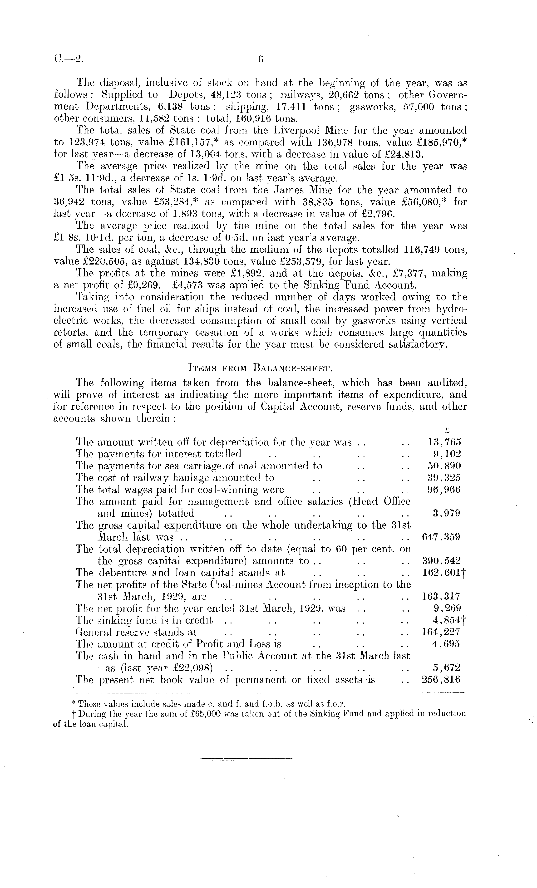 The disposal, inclusive of stock on hand at the beginning of the year, was as follows : Supplied to —Depots, 48,123 tons ; railways, 20,662 tons ; other Government Departments, 6,138 tons ; shipping, 17,411 tons ; gasworks, 57,000 tons ; other consumers, 11,582 tons : total, 160,916 tons. The total sales of State coal from the Liverpool Mine for the year amounted to 123,974 tons, value £161.157,* as compared with 136,978 tons, value £.185,970,* for last year —a decrease of 13,004 tons, with a decrease in value of £24,813. The average price realized by the mine on the total sales for the year was £l ss. U'9d., a decrease of Is. l-9d. on last year's average. The total sales of State coal from the James Mine for the year amounted to 36,942 tons, value £53,284,* as compared with 38,835 tons, value £56,080,* for last year —a decrease of 1,893 tons, with a decrease in value of £2,796. The average price realized by the mine on the total sales for the year was £l Bs. 10-Id. per ton, a decrease of 0-sd. on last year's average. The sales of coal, &c., through the medium of the depots totalled 116,749 tons, value £220,505, as against 134,830 tons, value £253,579, for last year. The profits at the mines were £1,892, and at the depots, &c., £7,377, making a net profit of £9,269. £4,573 was applied to the Sinking Fund Account. Taking into consideration the reduced number of days worked owing to the increased use of fuel oil for ships instead of coal, the increased power from hydroelectric works, the decreased consumption of small coal by gasworks using vertical retorts, and the temporary cessation of a works which consumes large quantities of small coals, the financial results for the year must be considered satisfactory. Items prom Balance-sheet. The following items taken from the balance-sheet, which has been audited, will prove of interest as indicating the more important items of expenditure, and for reference in respect to the position of Capital Account, reserve funds, and other accounts shown therein :— £ The amount written off for depreciation for the year was .. . . 13,765 The payments for interest totalled .. .. .. .. 9,102 The payments for sea carriage.of coal amounted to .. .. 50,890 The cost of railway haulage amounted to . . . . 39,325 The total wages paid for coal-winning were .. . . . . 96,966 The amount paid for management and office salaries (Head Office and mines) totalled .. .. .. .. .. 3,979 The gross capital expenditure on the whole undertaking to the 31st March last was . . . . . . . . . . . . 647,359 The total depreciation written off to date (equal to 60 per cent, on the gross capital expenditure) amounts to . . . . . . 390,542 The debenture and loan capital stands at .. .. .. 162,601"j" The net profits of the State Coal-mines Account from inception to the 31st March, 1929, are .. .. .. .. .. 163,317 The net profit for the year ended 31st March, 1929, was . . . . 9,269 The sinking fund is in credit . . . . . . . . . . 4,854f General reserve stands at . . . . . . . . 164,227 The amount at credit of Profit and Loss is .. .. .. 4,695 The cash in hand and in the Public Account at the 31st March last as (last year £22,098) .. . . . . .. . . 5,672 The present net book value of permanent or fixed assets is .. 256,816 * These values include sales made c. and f. and f.o.b. as well as f.o.r. f During the year the sum of £65,000 was taken out of the Sinking Fund and applied in reduction of the loan capital.