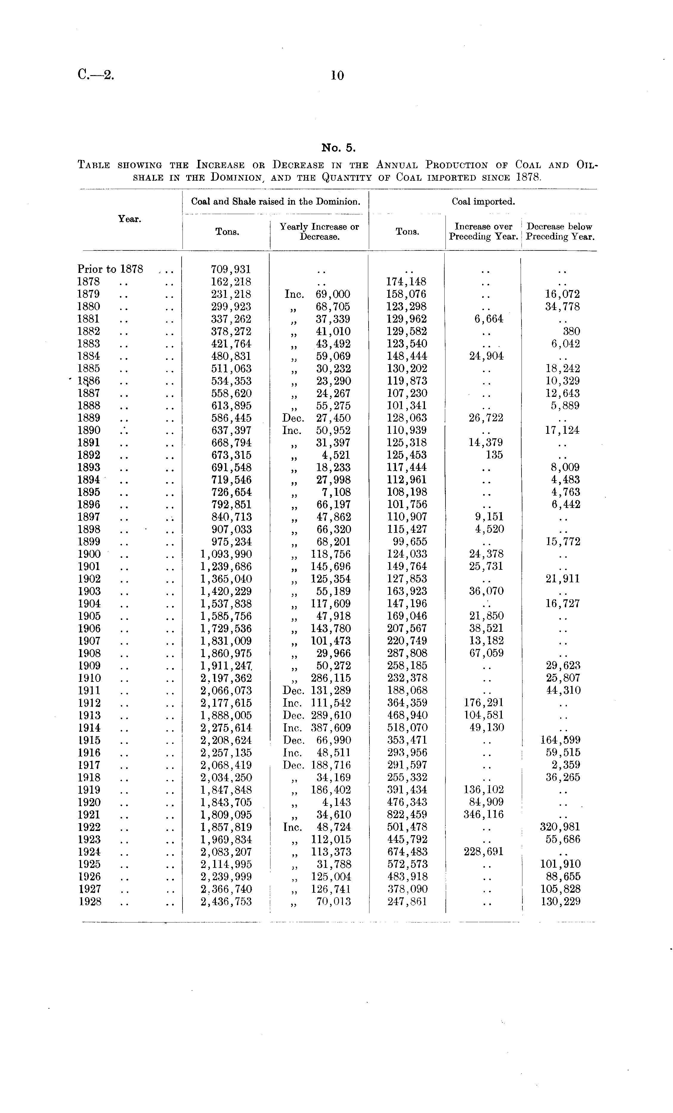 No. 5. Table showing the Increase or Decrease in the Annual Production of Coal and Oilshale in the Dominion, and the Quantity of Coal imported since 1878.