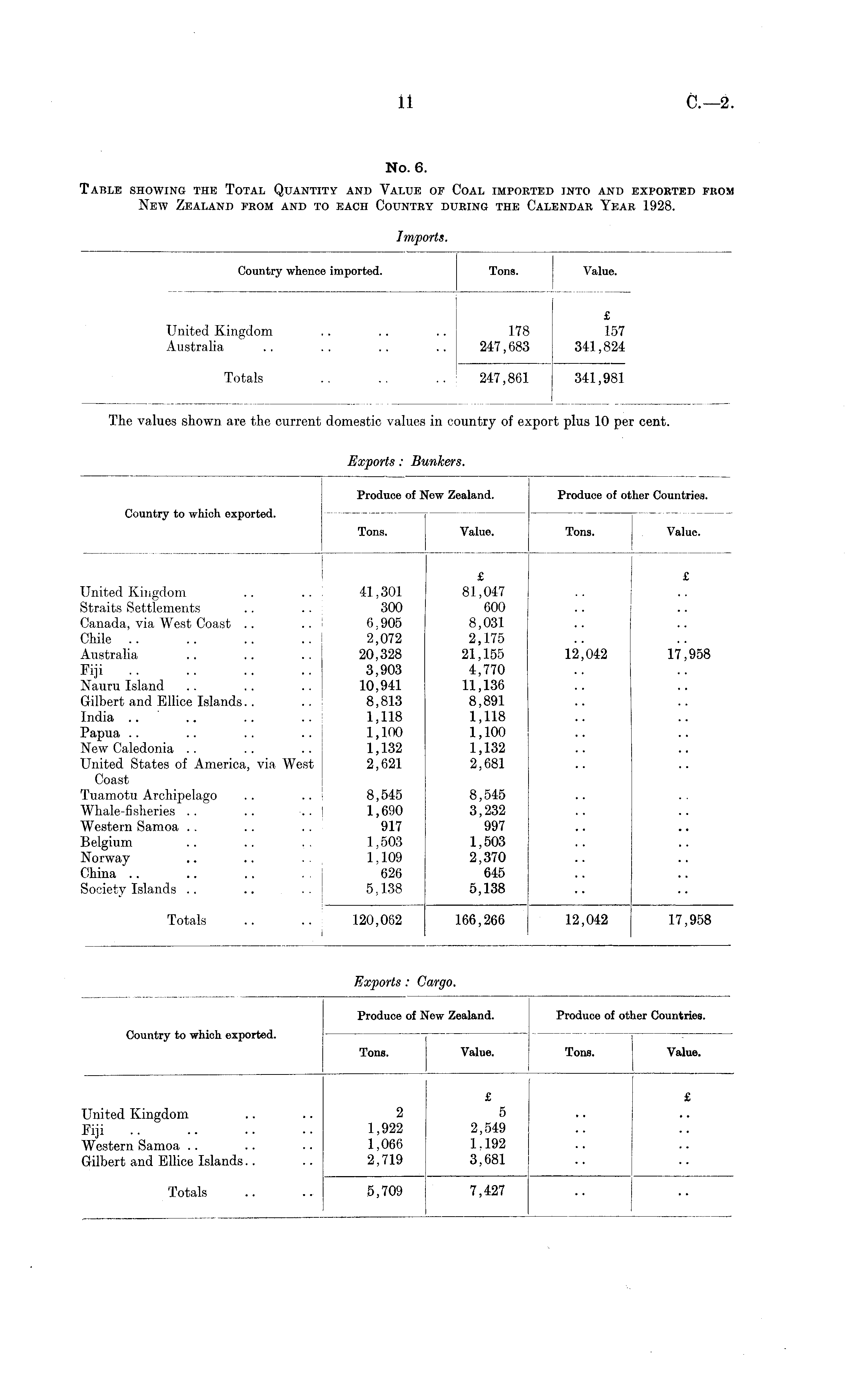 No. 6. Table showing the Total Quantity and Value of Coal imported into and exported prom New Zealand prom and to each Country during the Calendar Year 1928.