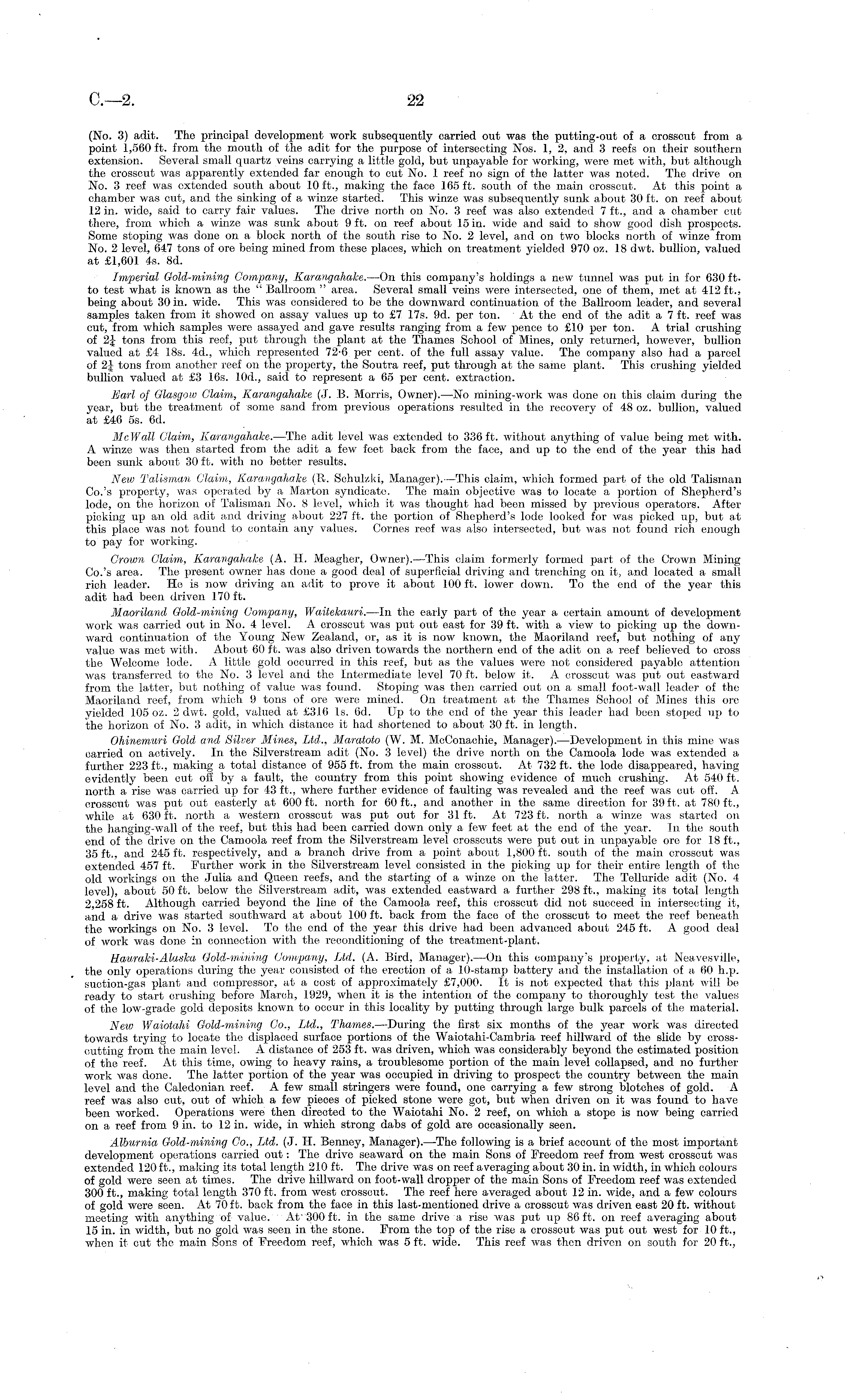(No. 3) adit. The principal development work subsequently carried out was the putting-out of a crosscut from a point 1,560 ft. from the mouth of the adit for the purpose of intersecting Nos. 1, 2, and 3 reefs on their southern extension. Several small quartz veins carrying a little gold, but unpayable for working, were met with, but although the crosscut was apparently extended far enough to cut No. 1 reef no sign of the latter was noted. The drive on No. 3 reef was extended south about 10 ft., making the face 165 ft. south of the main crosscut. At this point a chamber was out, and the sinking of a winze started. This winze was subsequently sunk about 30 ft. on reef about 12 in. wide, said to carry fair values. The drive north on No. 3 reef was also extended 7 ft., and a chamber cut there, from which a winze was sunk about 9 ft. on reef about 15 in. wide and said to show good dish prospects. Some stoping was done on a block north of the south rise to No. 2 level, and on two blocks north of winze from No. 2 level, 647 tons of ore being mined from these places, which on treatment yielded 970 oz. 18 dwt. bullion, valued at £1,601 4s. Bd. Imperial Gold-mining Company, Karangahake.—On this company's holdings a new tunnel was put in for 630 ft. to test what is known as the " Ballroom " area. Several small veins were intersected, one of them, met at 412 ft., being about 30 in. wide. This was considered to be the downward continuation of the Ballroom leader, and several samples taken from it showed on assay values up to £7 17s. 9d. per ton. At the end of the adit a 7 ft. reef was cut, from which samples were assayed and gave results ranging from a few pence to £10 per ton. A trial crushing of 2J tons from this reef, put through the plant at the Thames School of Mines, only returned, however, bullion valued at £4 18s. 4d., which represented 72-6 per cent, of the full assay value. The company also had a parcel of 2J tons from another reef on the property, the Soutra reef, put through at the same plant. This crushing yielded bullion valued at £3 16s. 10d., said to represent a 65 per cent, extraction. Earl of Glasgow Claim, Karangahake (J. B. Morris, Owner). —No mining-work was done on this claim during the year, but the treatment of some sand from previous operations resulted in the recovery of 48 oz. bullion, valued at £46 ss. 6d. McWall Claim, Karangahake.—The adit level was extended to 336 ft. without anything of value being met with. A winze was then started from the adit a few feet back from the face, and up to the end of the year this had been sunk about 30 ft. with no better results. New Talisman Claim, Karangahake (R. Schulzlii, Manager).—This claim, which formed part of the old Talisman Co.'s property, was operated by a Marton syndicate. The main objective was to locate a portion of Shepherd's lode, on the horizon of Talisman No. 8 level, which it was thought had been missed by previous operators. After picking up an old adit and driving about 227 ft. the portion of Shepherd's lode looked for was picked up, but at this place was not found to contain any values. Cornes reef was also intersected, but was not found rich enough to pay for working. Crown Claim, Karangahake (A. H. Meagher, Owner). —This claim formerly formed part of the Crown Mining Co.'s area. The present owner has done a good deal of superficial driving and trenching on it, and located a small rich leader. He is now driving an adit to prove it about 100 ft. lower down. To the end of the year this adit had been driven 170 ft. Maoriland Gold-mining Company, Waitekauri. —In the early part of the year a certain amount of development work was carried out in No. 4 level. A crosscut was put out east for 39 ft. with a view to picking up the downward continuation of the Young New Zealand, or, as it is now known, the Maoriland reef, but nothing of any value was met with. About 60 ft. was also driven towards the northern end of the adit on a reef believed to cross the Welcome lode. A little gold occurred in this reef, but as the values were not considered payable attention was transferred to the No. 3 level and the Intermediate level 70 ft. below it. A crosscut was put out eastward from the latter, but nothing of value was found. Stoping was then carried out on a small foot-wall leader of the Maoriland reef, from which 9 tons of ore were mined. On treatment at the Thames School of Mines this ore yielded 105 oz. 2 dwt. gold, valued at £316 Is. 6d. Up to the end of the year this leader had been stoped up to the horizon of No. 3 adit, in which distance it had shortened to about 30 ft. in length. Ohinemuri Gold and Silver Mines, Ltd., Maratoto (W. M. McConaehie, Manager).—Development in this mine was carried on actively. In the Silverstream adit (No. 3 level) the drive north on the Camoola lode was extended a further 223 ft., making a total distance of 955 ft. from the main crosscut. At 732 ft. the lode disappeared, having evidently been cut 00 by a fault, the country from this point showing evidence of much crushing. At 540 ft. north a rise was carried up for 43 ft., where further evidence of faulting was revealed and the reef was cut off. A crosscut was put out easterly at 600 ft. north for 60 ft., and another in the same direction for 39 ft. at 780 ft., while at 630 ft. north a western crosscut was put out for 31ft. At 723 ft. north a winze was started on the hanging-wall of the reef, but this had been carried down only a few feet at the end of the year. In the south end of the drive on the Camoola reef from the Silverstream level crosscuts were put out in unpayable ore for 18 ft., 35 ft., and 245 ft. respectively, and a branch drive from a point about 1,800 ft. south of the main crosscut was extended 457 ft. Further work in the Silverstream level consisted in the picking up for their entire length of the old workings on the Julia and Queen reefs, and the starting of a winze on the latter. The Telluride adit (No. 4 le