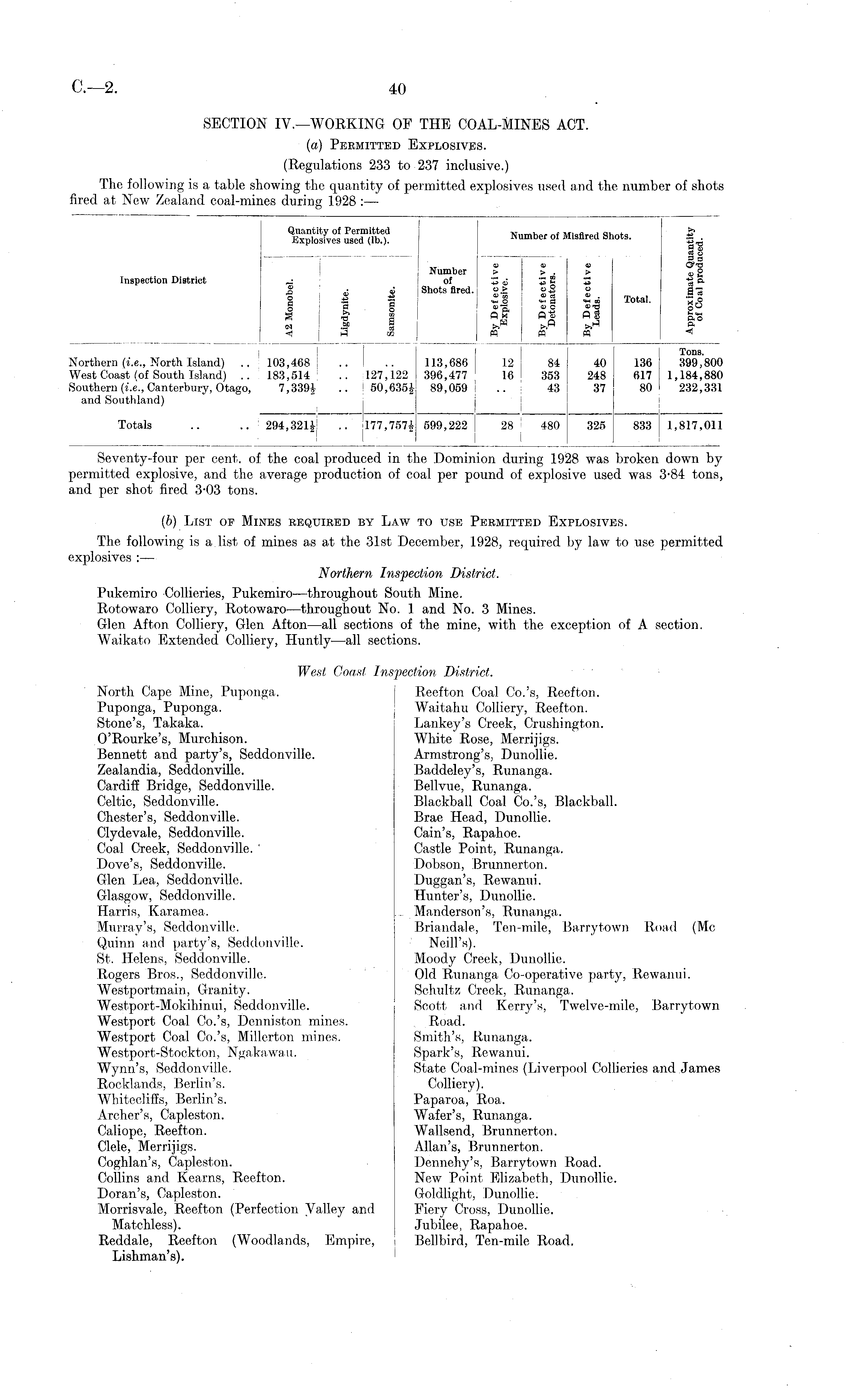 SECTION IV.—WORKING OF THE COAL-MINES ACT. (a) Permitted Explosives. (Regulations 233 to 237 inclusive.) The following is a table showing the quantity of permitted explosives used and the number of shots fired at New Zealand coal-mines during 1928 :—