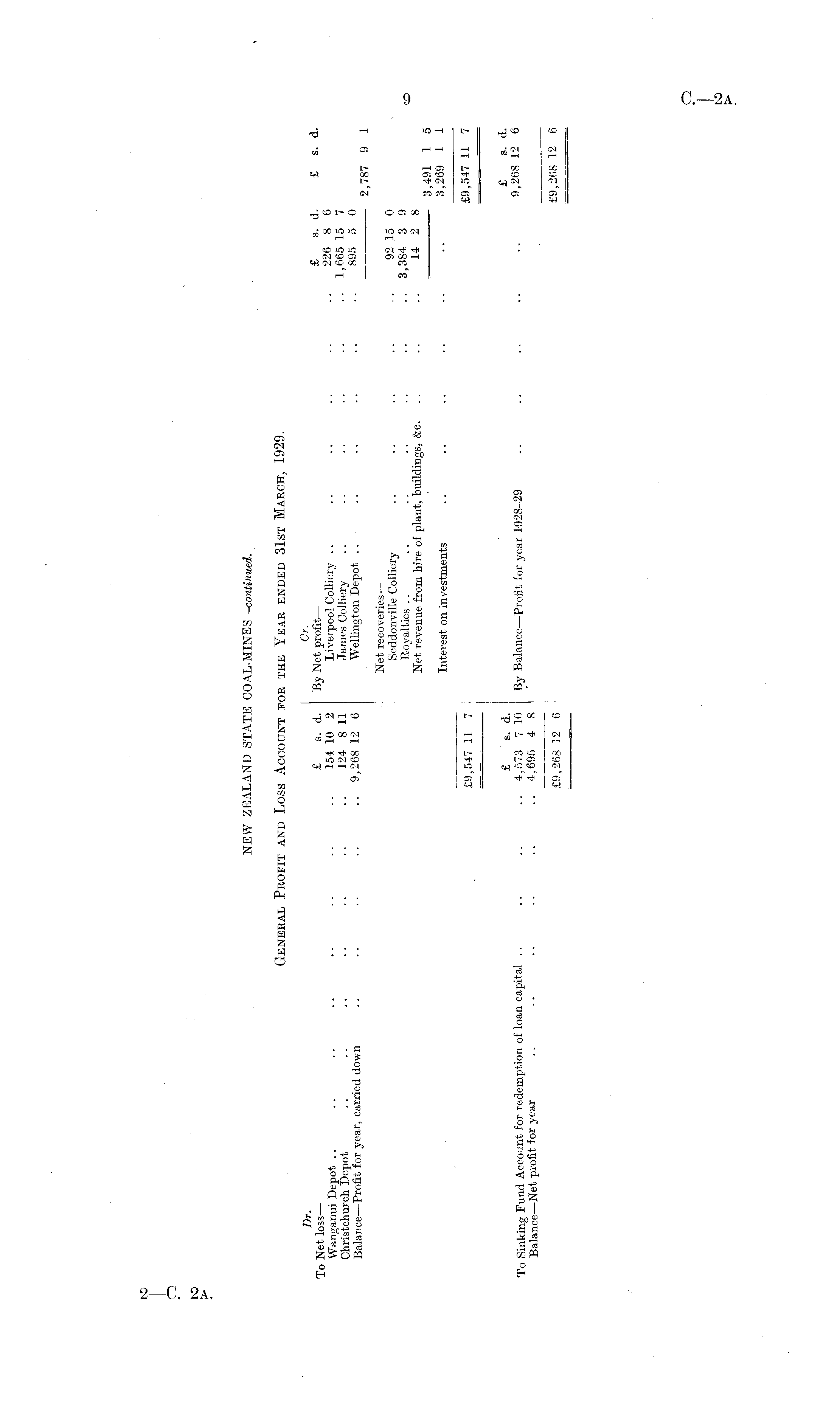 NEW ZEALAND STATE GOAL-MINES— continued. General Profit and Loss Account for the Year ended 31st March, 1929. Dr. CY. To Net loss £ s - d. By Net profit— £ s. d. £ s. d. Wanganui Depot .. .. .. .. ■■ •• •• 154 10 2 Liverpool Colliery .. .. .. .. •• - 226 8 6 Christchurch Depot .. .. .. •• ■■ •• •• 124 8 11 James Colliery .. .. .. -• 1,665 15 1 Balance— Profit for year, carried down .. .. . • .. 9,268 12 6 Wellington Depot .. .. .. .. 885 5 0 2,787 9 1 Net recoveries— Seddonville Colliery .. .. .. • • - ■ 92 15 0 "Royalties .. .. .. • • ■ • • • .. 3,384 3 9 Net revenue from hire of plant, buildings, &c. .. .. . ■ 14 2 8 3,491 1 5 Interest on investments .. •• •• •• •• •• 3,26911 £9,547 11 7 £9,547 11 7 £ s. d. £ s - d. To Sinkin« Fund Account for redemption of loan capital .. .. .. .. 4,573 7 10 By Balance— Profit for year 1928-29 .. .. .. •• 9,268 12 6 Balance— Net profit for year .. .. .. .. .. .. 4,695 4 8 ' £9,268 12 6 £9,268 12 6