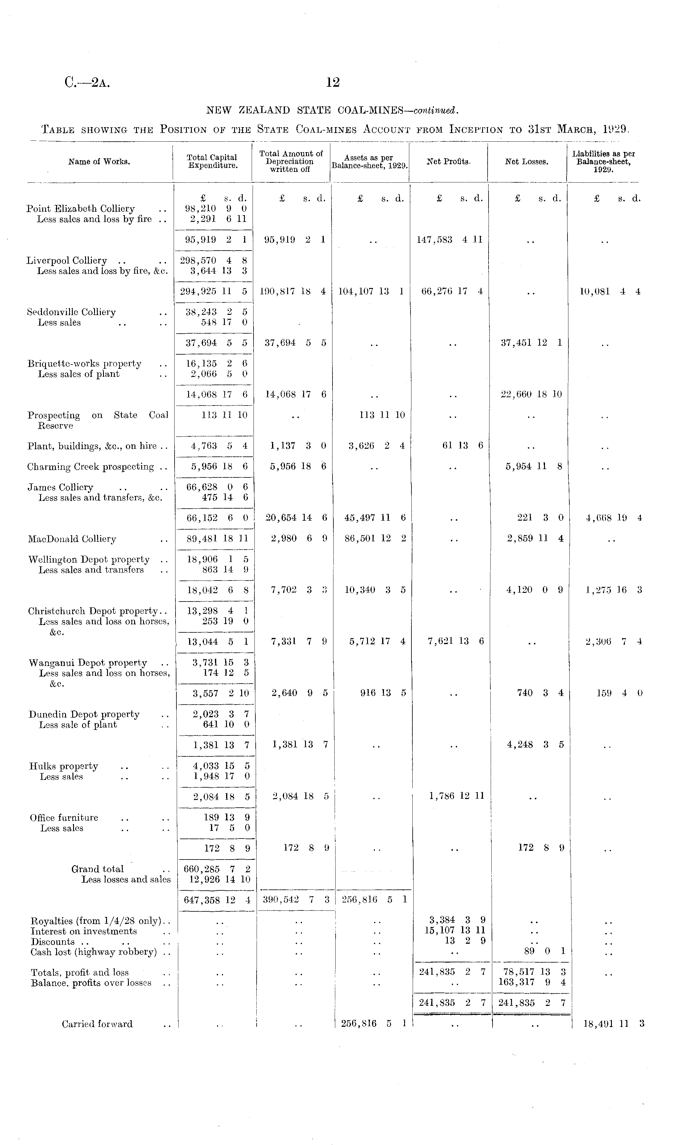 TnHl ranitnl Total Amount oi , , Liabilities as per Name of Works. IxpLditire! Balance-sheet 1 ! 1929. Profits. Net Losses. Balance-sheet, £ s. d. £ s. d. £ s. d. £ s. d. £ s. d. £ s. d. Point Elizabeth Colliery .. 98,210 9 0 Less sales and loss by fire .. 2,291 6 11 95,919 2 1 95,919 2 1 .. 147,583 4 11 Liverpool Colliery .. .. 298,570 4 8 Less sales and loss by fire, &c. 3,644 13 3 294,925 11 5 190,817 18 4 104,107 13 1 66,270 17 4 .. 10,081 4 4 Seddonville Colliery .. 38,243 2 5 Less sales .. .. 548 17 0 37,694 5 5 37,694 5 5 .. .. 37,451 12 1 Briquette-works property .. 16,135 2 6 Less sales of plant .. 2,066 5 0 14,068 17 6 14,068 17 6 .. .. 22,660 18 10 Prospecting on State Coal 113 11 10 .. 113 11 10 .. Reserve Plant, buildings, &c., on hire .. 4,763 5 4 1,137 3 0 3,626 2 4 61 13 6 Charming Creek prospecting .. 5,956 18 6 5,956 18 6 .. .. 5,954 11 8 James Colliery .. .. 66,628 0 6 Less sales and transfers, &c. 475 14 6 66,152 6 0 20,654 14 6 45,497 11 6 .. 221 3 0 4,668 19 4 MacDonald Colliery .. 89,481 18 11 2,980 6 9 86,501 12 2 .. 2,859 11 4 Wellington Depot property .. 18,906 1 5 Less sales and transfers .. 863 14 9 18,042 6 8 7,702 3 3 10,340 3 5 .. 4,120 0 9 1,275 16 3 Christchurch Depot property.. 13,298 4 1 Less sales and loss on horses, 253 19 0 &c. 13,044 5 1 7,331 7 9 5,712 17 4 7,621 13 6 .. 2,306 7 4 Wanganui Depot property .. 3,731 15 3 Less sales and loss on horses, 174 12 5 &c. 3,557 2 10 2,640 9 5 916 13 5 .. 740 3 4 159 4 0 Dunedin Depot property .. 2,023 3 7 Less sale of plant . . 641 10 0 1,38113 7 1,381 13 7 .. .. 4,248 3 5 Hulks property .. .. 4,033 15 5 Less sales .. .. 1,948 17 0 2,084 18 5 2,084 18 5 .. 1,786 12 11 Office furniture .. .. 189 13 9 Less sales .. .. 17 5 0 172 8 9 172 8 9 .. .. 172 8 9 Grand total .. 660,285 7 2 Less losses and sales 12,926 14 10 647,358 12 4 390,542 7 3 256,816 5 1 Royalties (from 1/4/28 only).. .. .. .. 3,384 3 9 Interest on investments .. .. .. .. 15,107 13 11 Discounts .. .. . . .. .. .. 13 2 9 Cash lost (highway robbery) .. . . .. .. .. 89 0 1 Totals, profit and loss .. .. .. .. 241,835 2 7 78,517 13 3 Balance, profits over losses .. .. .. .. .. 163,317 9 4 241,835 2 7 241,835 2 7 Carried forward .. .. •• 256,816 5 1 .. .. 18,491 11 3
