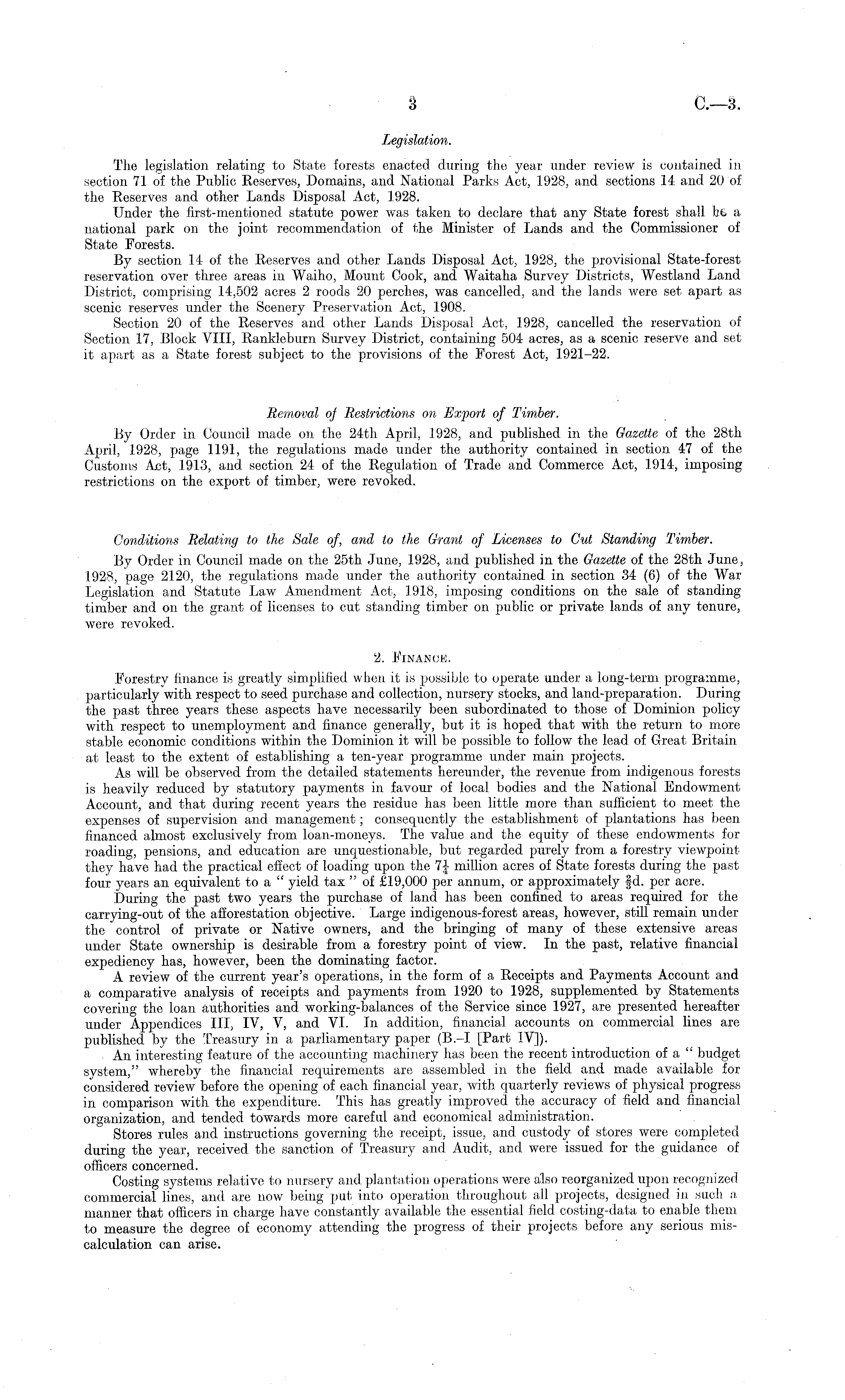 Legislation. The legislation relating to State forests enacted during the year under review is contained in section 71 of the Public Reserves, Domains, and National Parks Act, 1928, and sections 14 and 20 of the Reserves and other Lands Disposal Act, 1928. Under the first-mentioned statute power was taken to declare that any State forest shall te a national park on the joint recommendation of the Minister of Lands and the Commissioner of State Forests. By section 14 of the Reserves and other Lands Disposal Act, 1928, the provisional State-forest reservation over three areas in Waiho, Mount Cook, and Waitaha Survey Districts, Westland Land District, comprising 14,502 acres 2 roods 20 perches, was cancelled, and the lands were set apart as scenic reserves under the Scenery Preservation Act, 1908. Section 20 of the Reserves and other Lands Disposal Act, 1928, cancelled the reservation of Section 17, Block VIII, Rankleburn Survey District, containing 504 acres, as a scenic reserve and set it apart as a State forest subject to the provisions of the Forest Act, 1921-22. Removal of Restrictions on Export of Timber. By Order in Council made on the 24th April, 1928, and published in the Gazette of the 28th April, 1928, page 1191, the regulations made under the authority contained in section 47 of the Customs Act, 1913, and section 24 of the Regulation of Trade and Commerce Act, 1914, imposing restrictions on the export of timber, were revoked. Conditions Relating to the Sale of, and to the Grant of Licenses to Cut Standing Timber. By Order in Council made on the 25th June, 1928, and published in the Gazette of the 28th June, 1928, page 2120, the regulations made under the authority contained in section 34 (6) of the War Legislation and Statute Law Amendment Act, 1918, imposing conditions on the sale of standing timber and on the grant of licenses to cut standing timber on public or private lands of any tenure, were revoked. 2. Finance. Forestry finance is greatly simplified when it is possible to operate under a long-term programme, particularly with respect to seed purchase and collection, nursery stocks, and land-preparation. During the past three years these aspects have necessarily been subordinated to those of Dominion policy with respect to unemployment and finance generally, but it is hoped that with the return to more stable economic conditions within the Dominion it will be possible to follow the lead of Great Britain at least to the extent of establishing a ten-year programme under main projects. As will be observe,d from the detailed statements hereunder, the revenue from indigenous forests is heavily reduced by statutory payments in favour of local bodies and the National Endowment Account, and that during recent years the residue has been little more than sufficient to meet the expenses of supervision and management; consequently the establishment of plantations has been financed almost exclusively from loan-moneys. The value and the equity of these endowments for roading, pensions, and education are unquestionable, but regarded purely from a forestry viewpoint they have had the practical effect of loading upon the 7J million acres of State forests during the past four years an equivalent to a " yield tax " of £19,000 per annum, or approximately §d. per acre. During the past two years the purchase of land has been confined to areas required for the carrying-out of the afforestation objective. Large indigenous-forest areas, however, still remain under the control of private or Native owners, and the bringing of many of these extensive areas under State ownership is desirable from a forestry point of view. In the past, relative financial expediency has, however, been the dominating factor. A review of the current year's operations, in the form of a Receipts and Payments Account and a comparative analysis of receipts and payments from 1920 to 1928, supplemented by Statements covering the loan authorities and working-balances of the Service since 1927, are presented hereafter under Appendices 111, IV, V, and VI. In addition, financial accounts on commercial lines are published by the Treasury in a parliamentary paper (8.-I [Part IV]). An interesting feature of the accounting machinery has been the recent introduction of a " budget system," whereby the financial requirements are assembled in the field and made available for considered review before the opening of each financial year, with quarterly reviews of physical progress in comparison with the expenditure. This has greatly improved the accuracy of field and financial organization, and tended towards more careful and economical administration. Stores rules and instructions governing the receipt, issue, and custody of stores were completed during the year, received the sanction of Treasury and Audit, and were issued for the guidance of officers concerned. Costing systems relative to nursery and plantation operations were also reorganized upon recognized commercial lines, and are now being put into operation throughout all projects, designed in such a manner that officers in charge have constantly available the essential field costing-data to enable them to measure the degree of economy attending the progress of their projects before any serious miscalculation can arise.