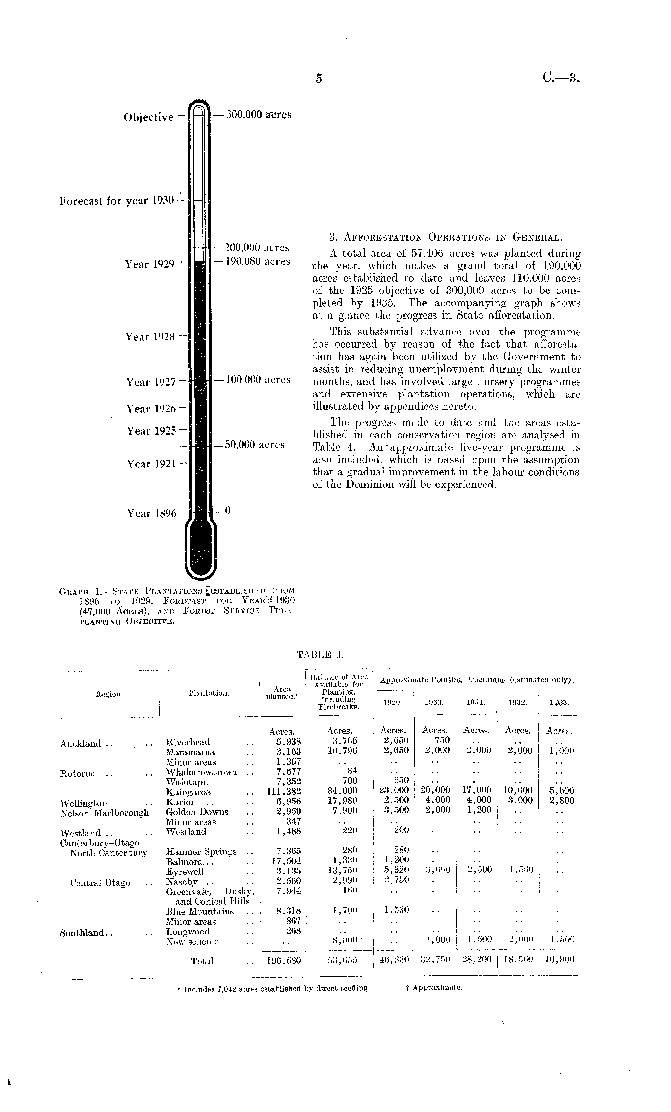 3. Afforestation Operations in General. A total area of 57,406 acres was planted during tie year, which makes a grand total of 190,000 acres established to date and leaves 110,000 acres of the 1925 objective of 300,000 acres to be completed by 1935. The accompanying graph shows at a glance the progress in State afforestation. This substantial advance over the programme has occurred by reason of the fact that afforestation has again been utilized by the Government to assist in reducing unemployment during the winter months, and has involved large nursery programmes and extensive plantation operations, which are illustrated by appendices hereto. The progress made to date and the areas established in each conservation region are analysed in Table 4. An" approximate five-year programme is also included, which is based upon the assumption that a gradual improvement in the labour conditions of the Dominion will be experienced .