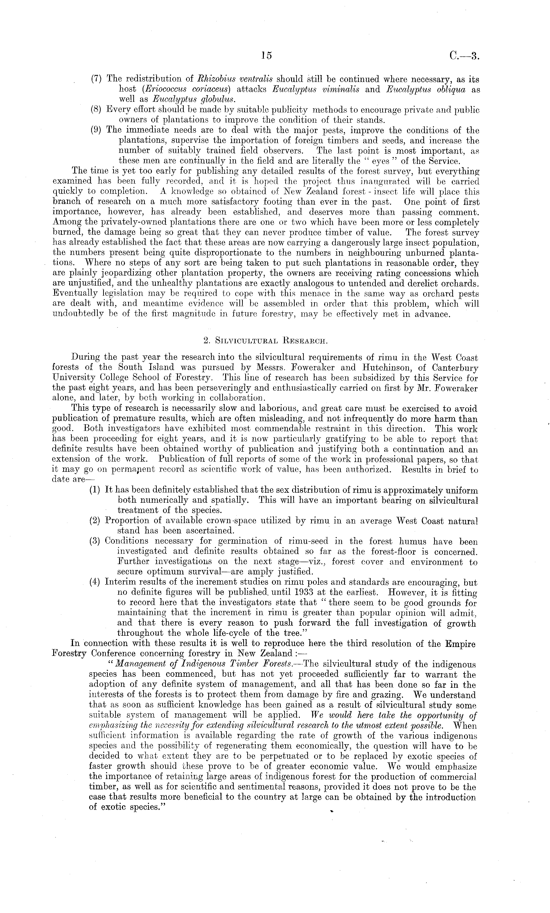 (7) The redistribution of Rhizobius ventralis should still be continued where necessary, as its host (Eriococcus coriaceus) attacks Eucalyptus viminalis and Eucalyptus obliqua as well as Eucalyptus globulus. (8) Every effort should be made by suitable publicity methods to encourage private and public owners of plantations to improve the condition of their stands. (9) The immediate needs are to deal with the major pests, improve the conditions of the plantations, supervise the importation of foreign timbers and seeds, and increase the number of suitably trained field observers. The last point is most important, as these men are continually in the field and are literally the " eyes " of the Service. The time is yet too early for publishing any detailed results of the forest survey, but everything examined has been fully recorded, and it is hoped the project thus inaugurated will be carried quickly to completion. A knowledge so obtained of New Zealand forest - insect life will place this branch of research on a much more satisfactory footing than ever in the past. One point of first importance, however, has already been established, and deserves more than passing comment. Among the privately-owned plantations there are one or two which have been more or less completely burned, the damage being so great that they can never produce timber of value. The forest survey has already established the fact that these areas are now carrying a dangerously large insect population, the numbers present being quite disproportionate to the numbers in neighbouring unburned plantations. Where no steps of any sort are being taken to put such plantations in reasonable order, they are plainly jeopardizing other plantation property, the owners are receiving rating concessions which are unjustified, and the unhealthy plantations are exactly analogous to untended and derelict orchards. Eventually legislation may be required to cope with this menace in the same way as orchard pests are dealt with, and meantime evidence will be assembled in order that this problem, which will undoubtedly be of the first magnitude in future forestry, may be effectively met in advance. 2. SILVICULTURAL RESEARCH. During the past year the research into the silvicultural requirements of rimu in the West Coast forests of the South Island was pursued by Messrs. Foweraker and Hutchinson, of Canterbury University College School of Forestry. This line of research has been subsidized by this Service for the past eight years, and has been perseveringly and enthusiastically carried on first by Mr. Foweraker alone, and later, by both working in collaboration. This type of research is necessarily slow and laborious, and great care must be exercised to avoid publication of premature results, which are often misleading, and not infrequently do more harm than good. Both investigators have exhibited most commendable restraint in this direction. This work has been proceeding for eight years, and it is now particularly gratifying to be able to report that definite results have been obtained worthy of publication and justifying both a continuation and an extension of the work. Publication of full reports of some of the work in professional papers, so that it may go on permanent record as scientific work of value, has been authorized. Results in brief to date are — (1) It has been definitely established that the sex distribution of rimu is approximately uniform both numerically and spatially. This will have an important bearing on silvicultural treatment of the species. (2) Proportion of available crown-space utilized by rimu in an average West Coast natural stand has been ascertained. (3) Conditions necessary for germination of rimu-seed in the forest humus have been investigated and definite results obtained so far as the forest-floor is concerned. Further investigations on the next stage—viz., forest cover and environment to secure optimum survival —are amply justified. (4) Interim results of the increment studies on rimu poles and standards are encouraging, but no definite figures will be published, until 1933 at the earliest. However, it is fitting to record here that the investigators state that " there seem to be good grounds for maintaining that the increment in rimu is greater than popular opinion will admit, and that there is every reason to push forward the full investigation of growth throughout the whole life-cycle of the tree." In connection with these results it is well to reproduce here the third resolution of the Empire Forestry Conference concerning forestry in New Zealand : — " Management of Indigenous Timber Forests. —The silvicultural study of the indigenous species has been commenced, but has not yet proceeded sufficiently far to warrant the adoption of any definite system of management, and all that has been done so far in the interests of the forests is to protect them from damage by fire and grazing. We understand that as soon as sufficient knowledge has been gained as a result of silvicultural study some suitable system of management will be applied. We would here take the opportunity of emphasizing the necessity for extending silvicultural research to the utmost extent possible. When sufficient information is available regarding the rate of growth of the various indigenous species and the possibility of regenerating them economically, the question will have to be decided to what extent they are to be perpetuated or to be replaced by exotic species of faster growth should these prove to be of greater economic value. We would emphasize the importance of retaining large areas of indigenous forest for the production of commercial timber, as well as for scientific and sentimental reasons, provided it does not prove to be the case that results more beneficial to the country at large can be obtained by the introduction of exotic species."