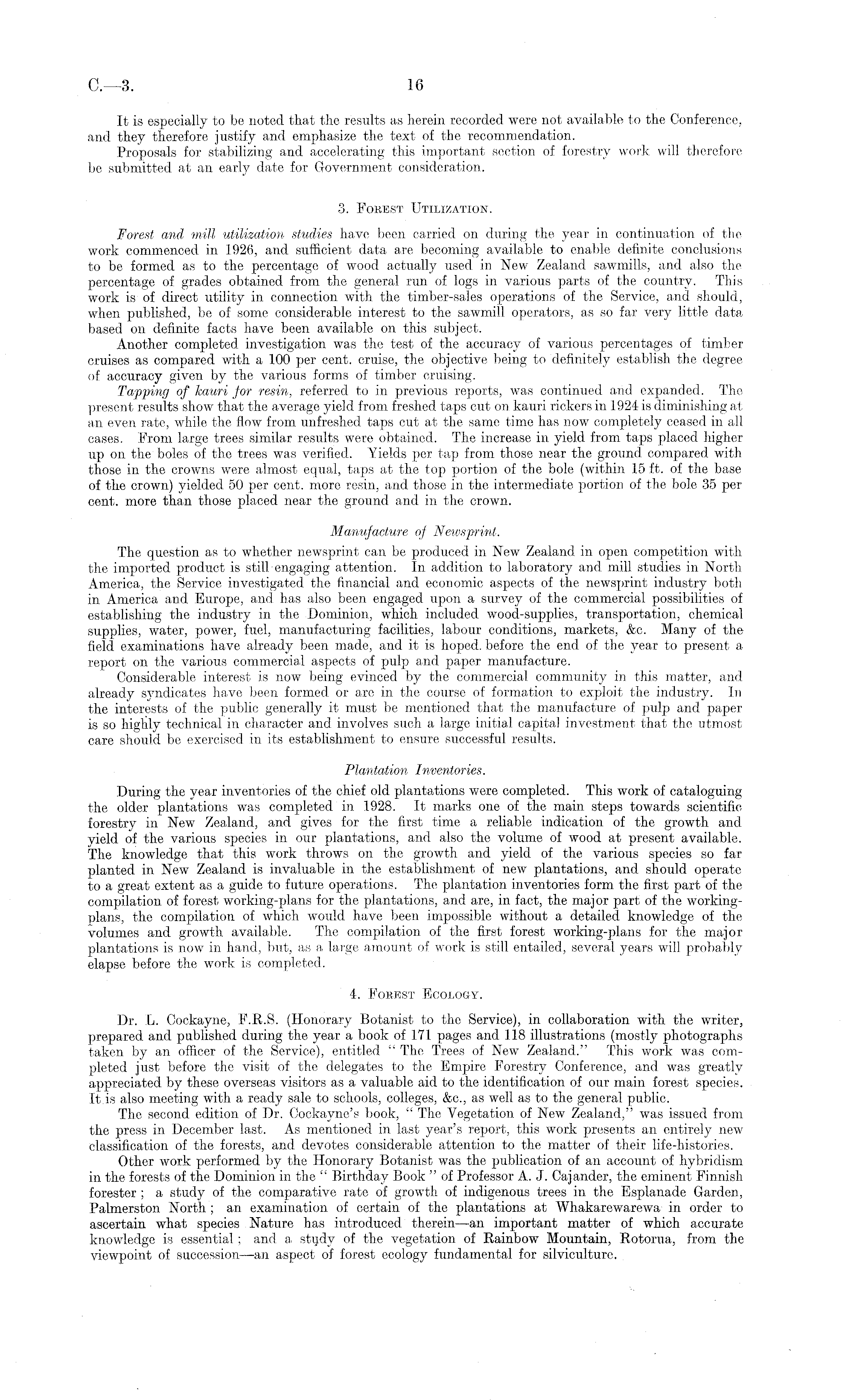 It is especially to be noted that the results as herein recorded were not available to the Conference, and they therefore justify and emphasize the text of the recommendation. Proposals for stabilizing and accelerating this important section of forestry work will therefore be submitted at an early date for Government consideration. 3. Forest Utilization. Forest and mill utilization studies have been carried on during the year in continuation of the work commenced in 1926, and sufficient data are becoming available to enable definite conclusions to be formed as to the percentage of wood actually used in New Zealand sawmills, and also the percentage of grades obtained from the general run of logs in various parts of the country. This work is of direct utility in connection with the timber-sales operations of the Service, and should, when published, be of some considerable interest to the sawmill operators, as so far very little data based on definite facts have been available on this subject. Another completed investigation was the test of the accuracy of various percentages of timber cruises as compared with a 100 per cent, cruise, the objective being to definitely establish the degree of accuracy given by the various forms of timber cruising. Tapping of kauri for resin, referred to in previous reports, was continued arid expanded. The present results show that the average yield from freshed taps cut on kauri rickers in 1924 is diminishing at an even rate, while the flow from unfreshed taps cut at the same time has now completely ceased in all cases. From large trees similar results were obtained. The increase in yield from taps placed higher up on the boles of the trees was verified. Yields per tap from those near the ground compared with those in the crowns were almost equal, taps at the top portion of the bole (within 15 ft. of the base of the crown) yielded 50 per cent, more resin, and those in the intermediate portion of the bole 35 per cent, more than those placed near the ground and in the crown. Manufacture of Newsprint. The question as to whether newsprint can be produced in New Zealand in open competition with the imported product is still engaging attention. In addition to laboratory and mill studies in North America, the Service investigated the financial and economic aspects of the newsprint industry both in America and Europe, and has also been engaged upon a survey of the commercial possibilities of establishing the industry in the Dominion, which included wood-supplies, transportation, chemical supplies, water, power, fuel, manufacturing facilities, labour conditions, markets, &c. Many of the field examinations have already been made, and it is hoped, before the end of the year to present a report on the various commercial aspects of pulp and paper manufacture. Considerable interest is now being evinced by the commercial community in this matter, and already syndicates have been formed or are in the course of formation to exploit the industry. In the interests of the public generally it must be mentioned that the manufacture of pulp and paper is so highly technical in character and involves such a large initial capital investment that the utmost care should be exercised in its establishment to ensure successful results. Plantation Inventories. During the year inventories of the chief old plantations were completed. This work of cataloguing the older plantations was completed in 1928. It marks one of the main steps towards scientific forestry in New Zealand, and gives for the first time a reliable indication of the growth and yield of the various species in our plantations, and also the volume of wood at present available. The knowledge that this work throws on the growth and yield of the various species so far planted in New Zealand is invaluable in the establishment of new plantations, and should operate to a great extent as a guide to future operations. The plantation inventories form the first part of the compilation of forest working-plans for the plantations, and are, in fact, the major part of the workingplans, the compilation of which would have been impossible without a detailed knowledge of the volumes and growth available. The compilation of the first forest working-plans for the major plantations is now in hand, but, as a large amount of work is still entailed, several years will probably elapse before the work is completed. 4. Forest Ecology. Dr. L. Cockayne, F.R.S. (Honorary Botanist to the Service), in collaboration with the writer, prepared and published during the year a book of 171 pages and 118 illustrations (mostly photographs taken by an officer of the Service), entitled " The Trees of New Zealand." This work was completed just before the visit of the delegates to the Empire Forestry Conference, and was greatly appreciated by these overseas visitors as a valuable aid to the identification of our main forest species. It is also meeting with a ready sale to schools, colleges, &c., as well as to the general public. The second edition of Dr. Cockayne's book, " The Vegetation of New Zealand," was issued from the press in December last. As mentioned in last year's report, this work presents an entirely new classification of the forests, and devotes considerable attention to the matter of their life-histories. Other work performed by the Honorary Botanist was the publication of an account of hybridism in the forests of the Dominion in the " Birthday Book " of Professor A. J. Cajander, the eminent Finnish forester ; a study of the comparative rate of growth of indigenous trees in the Esplanade Garden, Palmerston North ; an examination of certain of the plantations at Whakarewarewa in order to ascertain what species Nature has introduced therein—an important matter of which accurate knowledge is essential ; and a stijdv of the vegetation of Rainbow Mountain, Rotorua, from the viewpoint of succession—-an aspect of forest ecology fundamental for silviculture.
