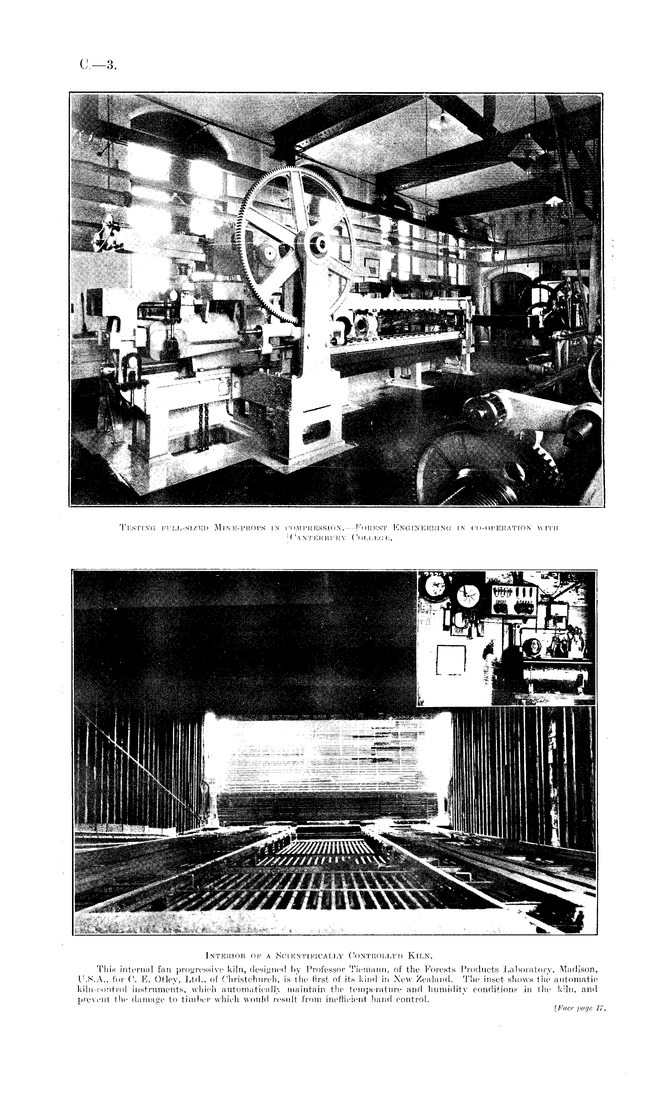 Interior of a Scientifically Controlled Kiln. This internal fan progressive kiln, designed by Professor Tiemann, of the Forests Products Laboratory, Madison, U.S.A., for C. E. Otley, Ltd., of Christchurch, is the first of its kind in New Zealand. The inset shows the automatic kiln-control instruments, which automatically maintain the temperature and humidity conditions in the kiln, and prevent the damage to timber which would result from inefficient hand control. [Face page 17.