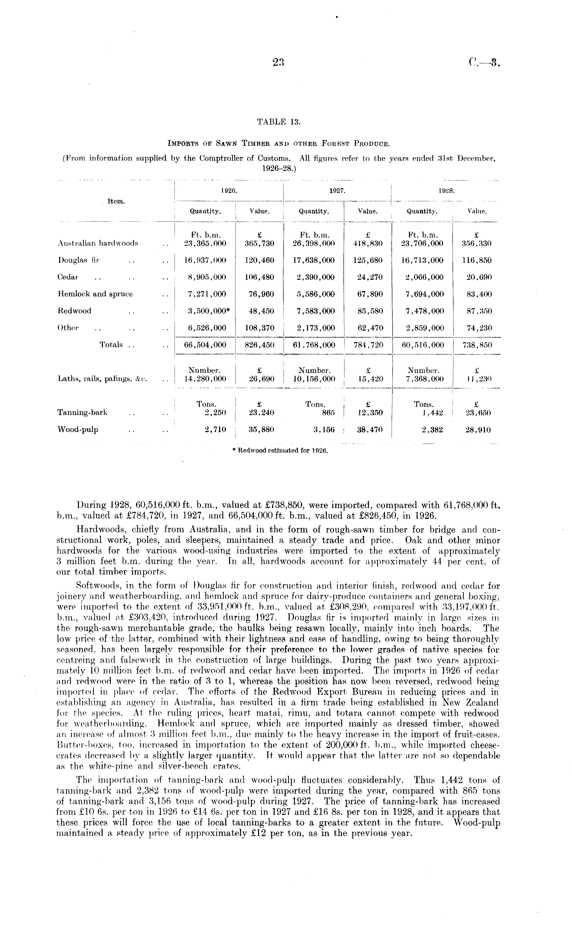 TABLE 13. Imports of Sawn Timber and other Forest Produce. (From information supplied by the Comptroller of Customs. All figures refer to the years ended 31st December, 1926-28.)