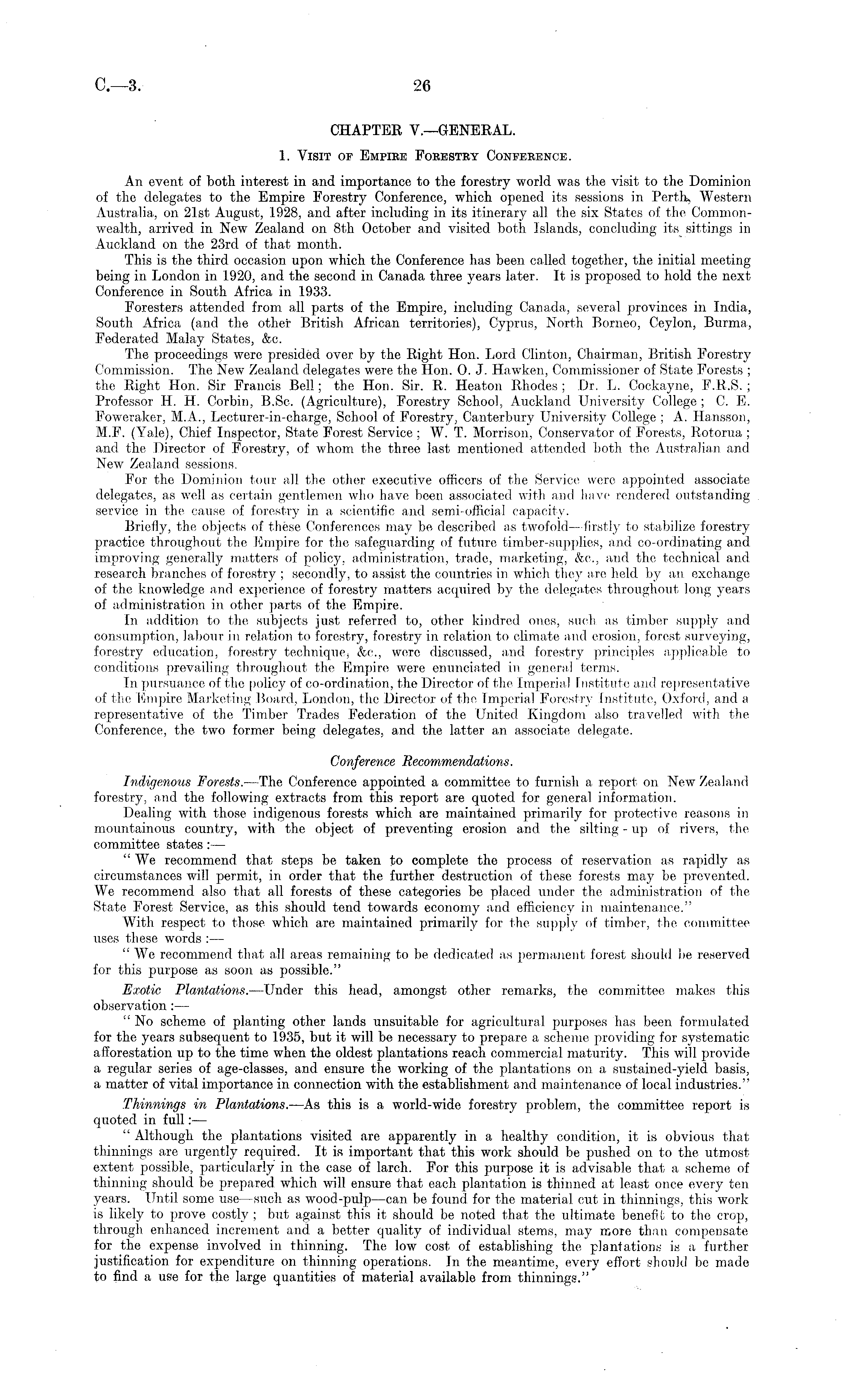CHAPTER V.—GENERAL. 1. Visit op Empire Forestry Conference. An event of both interest in and importance to the forestry world was the visit to the Dominion of the delegates to the Empire Forestry Conference, which opened its sessions in Perth* Western Australia, on 21st August, 1928, and after including in its itinerary all the six States of the Commonwealth, arrived in New Zealand on Bth October and visited both Islands, concluding its_ sittings in Auckland on the 23rd of that month. This is the third occasion upon which the Conference has been called together, the initial meeting being in London in 1920, and the second in Canada three years later. It is proposed to hold the next Conference in South Africa in 1933. Foresters attended from all parts of the Empire, including Canada, several provinces in India, South Africa (and the other British African territories), Cyprus, North Borneo, Ceylon, Burma, Federated Malay States, &c. The proceedings were presided over by the Right Hon. Lord Clinton, Chairman, British Forestry Commission. The New Zealand delegates were the Hon. 0. J. Hawken, Commissioner of State Forests ; the Right Hon. Sir Francis Bell; the Hon. Sir. R. Heaton Rhodes; Dr. L. Cockayne, F.R.S. ; Professor H. H. Corbin, B.Sc. (Agriculture), Forestry School, Auckland University College ; C. E. Foweraker, M.A., Lecturer-in-charge, School of Forestry, Canterbury University College ; A. Hansson, M.F. (Yale), Chief Inspector, State Forest Service ; W. T. Morrison, Conservator of Forests, Rotorua ; and the Director of Forestry, of whom the three last mentioned attended both the Australian and New Zealand sessions. For the Dominion tour all the other executive officers of the Service were appointed associate delegates, as well as certain gentlemen who have been associated with and have rendered outstanding service in the cause of forestry in a scientific and semi-official capacity. Briefly, the objects of these Conferences may be described as twofold —firstly to stabilize forestry practice throughout the Empire for the safeguarding of future timber-supplies, and co-ordinating and improving generally matters of policy, administration, trade, marketing, &c., and the technical and research branches of forestry ; secondly, to assist the countries in which they are held by an exchange of the knowledge and experience of forestry matters acquired by the delegates throughout long years of administration in other parts of the Empire. In addition to the subjects just referred to, other kindred ones, such as timber supply and consumption, labour in relation to forestry, forestry in relation to climate and erosion, forest surveying, forestry education, forestry technique) &c., were discussed, and forestry principles applicable to conditions prevailing throughout the Empire were enunciated in general terms. In pursuance of the policy of co-ordination, the Director of the Imperial Institute and representative of the Empire Marketing Board, London, the Director of the Imperial Forestry Institute, Oxford, and a representative of the Timber Trades Federation of the United Kingdom also travelled with the Conference, the two former being delegates, and the latter an associate delegate. Conference Recommendations. Indigenous Forests. —The Conference appointed a committee to furnish a report on New Zealand forestry, and the following extracts from this report are quoted for general information. Dealing with those indigenous forests which are maintained primarily for protective reasons in mountainous country, with the object of preventing erosion and the silting -up of rivers, the committee states : — "We recommend that steps be taken to complete the process of reservation as rapidly as circumstances will permit, in order that the further destruction of these forests may be prevented. We recommend also that all forests of these categories be placed under the administration of the State Forest Service, as this should tend towards economy and efficiency in maintenance." With respect to those which are maintained primarily for the supply of timber, the committee uses these words : — " We recommend that all areas remaining to be dedicated as permanent forest should be reserved for this purpose as soon as possible." Exotic Plantations. —Under this head, amongst other remarks, the committee makes this observation:— "No scheme of planting other lands unsuitable for agricultural purposes has been formulated for the years subsequent to 1935, but it will be necessary to prepare a scheme providing for systematic afforestation up to the time when the oldest plantations reach commercial maturity. This will provide a regular series of age-classes, and ensure the working of the plantations on a sustained-yield basis, a matter of vital importance in connection with the establishment and maintenance of local industries." Thinnings in Plantations.—As this is a world-wide forestry problem, the committee report is quoted in full: — " Although the plantations visited are apparently in a healthy condition, it is obvious that thinnings are urgently required. It is important that this work should be pushed on to the utmost extent possible, particularly in the case of larch. For this purpose it is advisable that a scheme of thinning should be prepared which will ensure that each plantation is thinned at least once every ten years. Until some use —such as wood-pulp—can be found for the material cut in thinnings, this work is likely to prove costly ; but against this it should be noted that the ultimate benefit to the crop, through enhanced increment and a better quality of individual stems, may more than compensate for the expense involved in thinning. The low cost of establishing the plantations is a further justification for expenditure on thinning operations. In the meantime, every effort should be made to find a use for the large quantities of material available from thinnings."