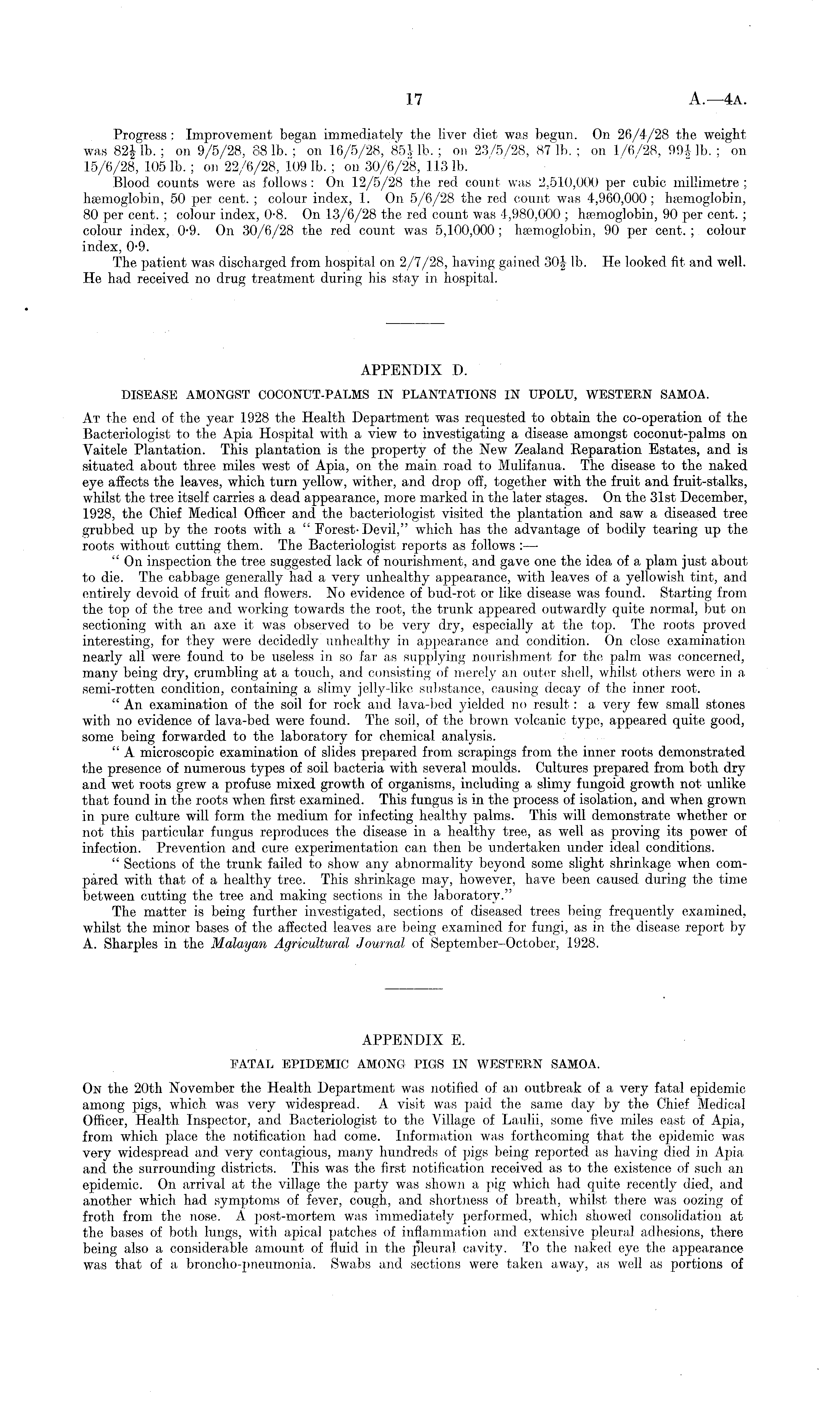 Progress : Improvement began immediately the liver diet was begun. On 26/4/28 the weight was 821 |b,; on 9/5/28, 88 lb. ; on 16/5/28, 851 lb.; on 23/5/28, 87 lb. ; on 1/6/28, 99| lb. ; on 15/6/28, 105 lb.; on 22/6/28, 109 lb. ; on 30/6/28, 113 lb. Blood counts were as follows : On 12/5/28 the red count was 2,510,000 per cubic millimetre ; haemoglobin, 50 per cent. ; colour index, 1. On 5/6/28 the red count was 4,960,000 ; haemoglobin, 80 per cent. ; colour index, 0-8. On 13/6/28 the red count was 4,980,000 ; haemoglobin, 90 per cent. ; colour index, 0-9. On 30/6/28 the red count was 5,100,000 ; hasmoglobin, 90 per cent. ; colour index, 0-9. The patient was discharged from hospital on 2/7/28, having gained 30| lb. He looked fit and well. He had received no drug treatment during his stay in hospital. APPENDIX D. DISEASE AMONGST COCONUT-PALMS IN PLANTATIONS IN UPOLU, WESTERN SAMOA. At the end of the year 1928 the Health Department was requested to obtain the co-operation of the Bacteriologist to the Apia Hospital with a view to investigating a disease amongst coconut-palms on Vaitele Plantation. This plantation is the property of the New Zealand Reparation Estates, and is situated about three miles west of Apia, on the main road to Mulifanua. The disease to the naked eye affects the leaves, which turn yellow, wither, and drop off, together with the fruit and fruit-stalks, whilst the tree itself carries a dead appearance, more marked in the later stages. On the 31st December, 1928, the Chief Medical Officer and the bacteriologist visited the plantation and saw a diseased tree grubbed up by the roots with a " Forest-Devil," which has the advantage of bodily tearing up the roots without cutting them. The Bacteriologist reports as follows : — "On inspection the tree suggested lack of nourishment, and gave one the idea of a plam just about to die. The cabbage generally had a very unhealthy appearance, with leaves of a yellowish tint, and entirely devoid of fruit and flowers. No evidence of bud-rot or like disease was found. Starting from the top of the tree and working towards the root, the trunk appeared outwardly quite normal, but on sectioning with an axe it was observed to be very dry, especially at the top. The roots proved interesting, for they were decidedly unhealthy in appearance and condition. On close examination nearly all were found to be useless in so far as supplying nourishment for the palm was concerned, many being dry, crumbling at a touch, and consisting of merely an outer shell, whilst others were in a semi-rotten condition, containing a slimy jelly-like substance, causing decay of the inner root. "An examination of the soil for rock and lava-bed yielded no result: a very few small stones with no evidence of lava-bed were found. The soil, of the brown volcanic type, appeared quite good, some being forwarded to the laboratory for chemical analysis. " A microscopic examination of slides prepared from scrapings from the inner roots demonstrated the presence of numerous types of soil bacteria with several moulds. Cultures prepared from both dry and wet roots grew a profuse mixed growth of organisms, including a slimy fungoid growth not unlike that found in the roots when first examined. This fungus is in the process of isolation, and when grown in pure culture will form the medium for infecting healthy palms. This will demonstrate whether or not this particular fungus reproduces the disease in a healthy tree, as well as proving its power of infection. Prevention and cure experimentation can then be undertaken under ideal conditions. " Sections of the trunk failed to show any abnormality beyond some slight shrinkage when compared with that of a healthy tree. This shrinkage may, however, have been caused during the time between cutting the tree and making sections in the laboratory." The matter is being further investigated, sections of diseased trees being frequently examined, whilst the minor bases of the affected leaves are being examined for fungi, as in the disease report by A. Sharpies in the Malayan Agricultural Journal of September-October, 1928. APPENDIX E. FATAL EPIDEMIC AMONG PIGS IN WESTERN SAMOA. On the 20th November the Health Department was notified of an outbreak of a very fatal epidemic among pigs, which was very widespread. A visit was paid the same day by the Chief Medical Officer, Health Inspector, and Bacteriologist to the Village of Laulii, some five miles east of Apia, from which place the notification had come. Information was forthcoming that the epidemic was very widespread and very contagious, many hundreds of pigs being reported as having died in Apia and the surrounding districts. This was the first notification received as to the existence of such an epidemic. On arrival at the village the party was shown a pig which had quite recently died, and another which had symptoms of fever, cough, and shortness of breath, whilst there was oozing of froth from the nose. A post-mortem was immediately performed, which showed consolidation at the bases of both lungs, with apical patches of inflammation and extensive pleural adhesions, there being also a considerable amount of fluid in the pleural cavity. To the naked eye the appearance was that of a broncho-pneumonia. Swabs and sections were taken away, as well as portions of