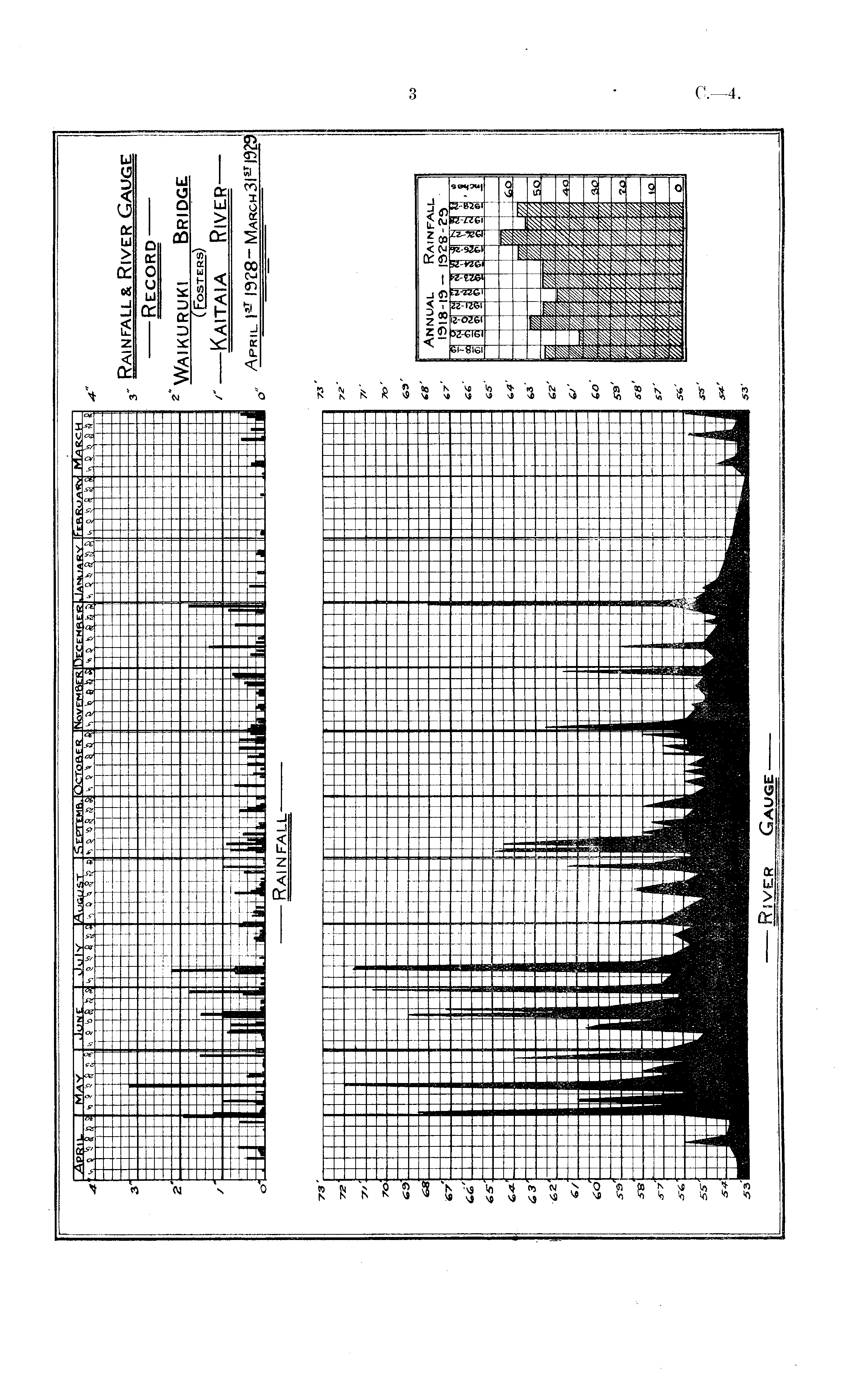 Rainfall & River Gauge Record Waikuruki Bridge (Fosters) Kaitaia River April 1st 1928-March 31st 1929