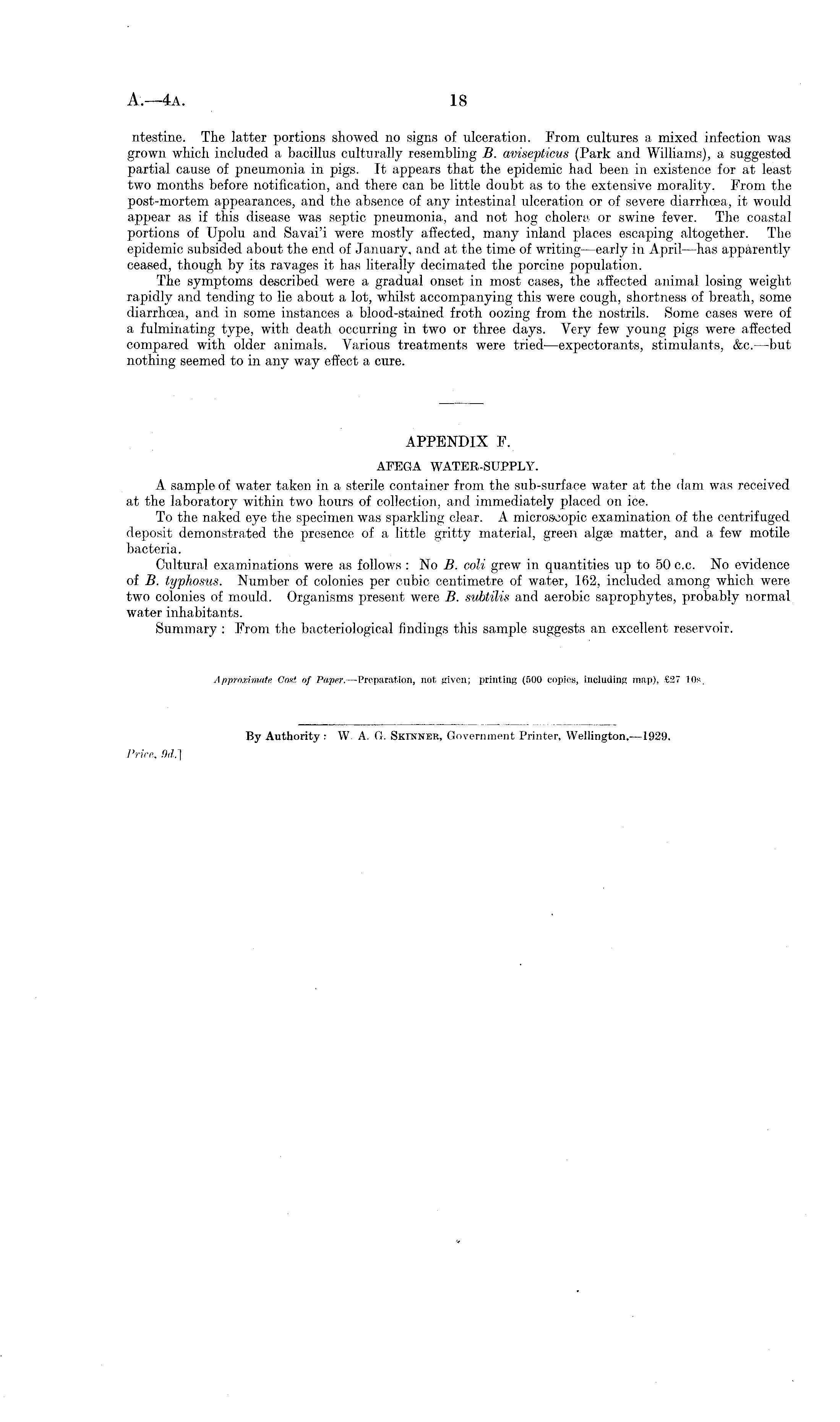 ntestine. The latter portions showed 110 signs of ulceration. From cultures a mixed infection was grown which included a bacillus culturally resembling B. avisepticus (Park and Williams), a suggested partial cause of pneumonia in pigs. It appears that the epidemic had been in existence for at least two months before notification, and there can be little doubt as to the extensive morality. From the post-mortem appearances, and the absence of any intestinal ulceration or of severe diarrhoea, it would appear as if this disease was septic pneumonia, and not hog cholera or swine fever. The coastal portions of Upolu and Savai'i were mostly affected, many inland places escaping altogether. The epidemic subsided about the end of January, and at the time of writing —early in April —has apparently ceased, though by its ravages it has literally decimated the porcine population. The symptoms described were a gradual onset in most cases, the affected animal losing weight rapidly and tending to lie about a lot, whilst accompanying this were cough, shortness of breath, some diarrhoea, and in some instances a blood-stained froth oozing from the nostrils. Some cases were of a fulminating type, with death occurring in two or three days. Very few young pigs were affected compared with older animals. Various treatments were tried- —expectorants, stimulants, &c. —but nothing seemed to in any way effect a cure. APPENDIX F. AFEGA WATER-SUPPLY. A. sample of water taken in a sterile container from the sub-surface water at the dam was received at the laboratory within two hours of collection, and immediately placed on ice. To the naked eye the specimen was sparkling clear. A microscopic examination of the centrifuged deposit demonstrated the presence of a little gritty material, green algse matter, and a few motile bacteria. Cultural examinations were as follows : No B. coli grew in quantities up to 50 c.c. No evidence of B. typhosus. Number of colonies per cubic centimetre of water, 162, included among which were two colonies of mould. Organisms present were B. svbtilis and aerobic saprophytes, probably normal water inhabitants. Summary : From the bacteriological findings this sample suggests an excellent reservoir.