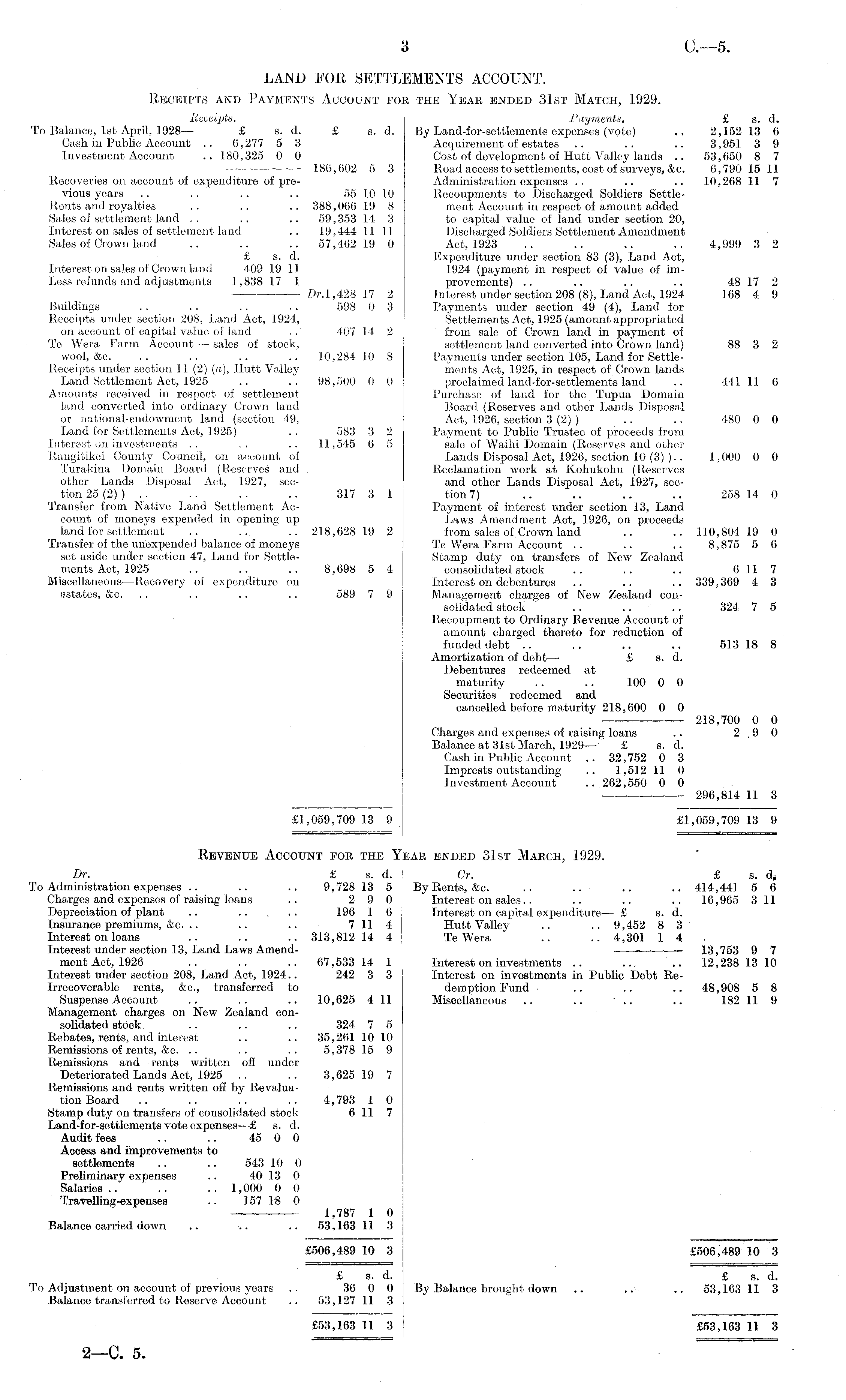 LAND FOE SETTLEMENTS ACCOUNT. Receipts and Payments Account fob the Year ended 31st Match, 1929. Receipts. Payments. £ s. d. To Balance, Ist April, 1928 — £ s. d. £ s. d. By Land-for-settlements expenses (vote) .. 2,152 13 6 Cash in Public Account .. 6,277 5 3 Acquirement of estates .. .. .. 3,951 3 9 Investment Account .. 180,325 0 0 Cost of development of Hutt Valley lands .. 53,(350 8 7 186,602 5 3 Road access to settlements, cost of surveys, &c. 6,790 15 11 Recoveries on account of expenditure of pre- Administration expenses .. .. .. 10,268 11 7 vious years .. .. .. .. 55 10 10 Recoupments to Discharged Soldiers SettleRents and royalties .. .. .. 388,066 19 8 ment Account in respect of amount added Sales of settlement land .. .. .. 59,353 14 3 to capital value of land under section 20, Interest on sales of settlement land .. 19,444 11 11 Discharged Soldiers Settlement Amendment Sales of Crown land .. .. .. 57,462 19 0 Act, 1923 .. .. .. .. 4,999 3 2 £ s. d. Expenditure under section 83 (3), Land Act, Interest on sales of Crown land 409 19 11 1924 (payment in respect of value of imLess refunds and adjustments 1,838 17 1 provements) .. .. .. .. 48 17 2 — Dr. 1,428 17 2 Interest under section 208 (8), Land Act, 1924 168 4 9 Buildings .. .. .. .. 598 0 3 Payments under section 49 (4), Land for Receipts under section 208, Land Act, 1924, Settlements Act, 1925 (amount appropriated on account of capital value of land .. 407 14 2 from sale of Crown land in payment of Te Wera Farm Account — sales of stock, settlement land converted into Crown land) 88 3 2 wool, &c. .. .. .. .. 10,284 10 8 Payments under section 105, Land for SettleReceipts under section 11 (2) (a), Hutt Valley ments Act, 1925, in respect of Crown lands Land Settlement Act, 1925 .. .. 98,500 0 0 proclaimed land-for-settlements land .. 441 11 6 Amounts received in respect of settlement Purchase of land for the Tupua Domain land converted into ordinary Crown land Board (Reserves and other Lands Disposal or national-endowment land (section 49, Act, 1926, section 3 (2) ) .. .. 480 0 0 Land for Settlements Act, 1925) .. 583 3 2 Payment to Public Trustee of proceeds from Interest on investments .. .. .. 11,545 6 5 sale of Waihi Domain (Reserves and other Rangitikei County Council, on account of Lands Disposal Act, 1926, section 10 (3) ).. 1,000 0 0 Turakina Domain Board (Reserves and Reclamation work at Kohukohu (Reserves other Lands Disposal Act, 1927, sec- and other Lands Disposal Act, 1927, section 25 (2)) .. .. .. .. 317 3 1 tion7) .. .. .. .. 258 14 0 Transfer from Native Land Settlement Ac- Payment of interest under section 13, Land count of moneys expended in opening up Laws Amendment Act, 1926, on proceeds land for settlement .. .. .. 218,628 19 2 from sales of.Crown land .. .. 110,804 19 0 Transfer of the unexpended balance of moneys To Wera Farm Account .. .. .. 8,875 5 6 set aside under section 47, Land for Settle- Stamp duty on transfers of New Zealand ments Act, 1925 .. .. .. 8,698 5 4 consolidated stock .. .. .. 6 11 7 Miscellaneous —Recovery of expenditure on Interest on debentures .. .. .. 339,369 4 3 isstates, &c. .. .. .. .. 589 7 9 Management charges of New Zealand consolidated stock .. .. .. 324 7 5 Recoupment to Ordinary Revenue Account of amount charged thereto for reduction of funded debt .. .. .. .. 513 18 8 Amortization of debt— £ s. d. Debentures redeemed at maturity .. .. 100 0 0 Securities redeemed and cancelled before maturity 218,600 0 0 — 218,700 0 0 Charges and expenses of raising loans .. 2.90 Balance at 31st March, 1929 — £ s. d. Cash in Public Account .. 32,752 0 3 Imprests outstanding .. 1,512 11 0 Investment Account .. 262,550 0 0 296,814 11 3 £1,059,709 13 9 £1,059,709 13 9 Revenue Account foe the Year ended 31st March, 1929. Dr. £ s. d. Or. £ s. dj To Administration expenses .. .. .. 9,728 13 5 By Rents, &c. .. .. .. .. 414,441 5 6 Charges and expenses of raising loans .. 2 9 0 Interest on sales.. .. .. .. 16,965 311 Depreciation of plant .. .. .. 196 1 6 Interest on capital expenditure— £ s. d. Insurance premiums, &c. .. .. .. 7 11 4 Hutt Valley .. .. 9,452 8 3 Interest on loans .. .. .. 313,812 14 4 Te Wera .. .. 4,301 1 4 Interest under section 13, Land Laws Amend- 13,753 9 7 ment Act, 1926 .. .. .. 67,533 14 1 Interest on investments .. .. 12,238 13 10 Interest under section 208, Land Act, 1924.. 242 3 3 Interest on investments in Public Debt ReIrrecoverable rents, &c., transferred to demption Fund .. .. .. 48,908 5 8 Suspense Account .. .. .. 10,625 411 Miscellaneous .. .. .. .. 182 11 9 Management charges on New Zealand consolidated stock .. .. .. 324 7 5 Rebates, rents, and interest .. .. 35,261 10 10 Remissions of rents, &c. .. .. .. 5,378 15 9 Remissions and rents written off under Deteriorated Lands Act, 1925 .. .. 3,625 19 7 Remissions and rents written off by Revaluation Board .. .. .. .. 4,793 1 0 Stamp duty on transfers of consolidated stock 6 11 7 Land-for-settlements vote expenses—£ s. d. Audit fees .. .. 45 0 0 Access and improvements to settlements .. .. 543 10 0 Preliminary expenses .. 40 13 0 Salaries .. .. 1,000 0 0 Travelling-expenses .. 157 18 0 —— — 1,787 1 0 Balance carried down .. .. .. 53,163 11 3 £506,489 10 3 £506,489 10 3 £ s. d. £ s. d. To Adjustment on account of previous years .. 36 0 0 By Balance brought down .. .. .. 53,163 11 3 Balance transferred to Reserve Account .. 53,127 11 3 £53,163 II 3 £53,163 11 3