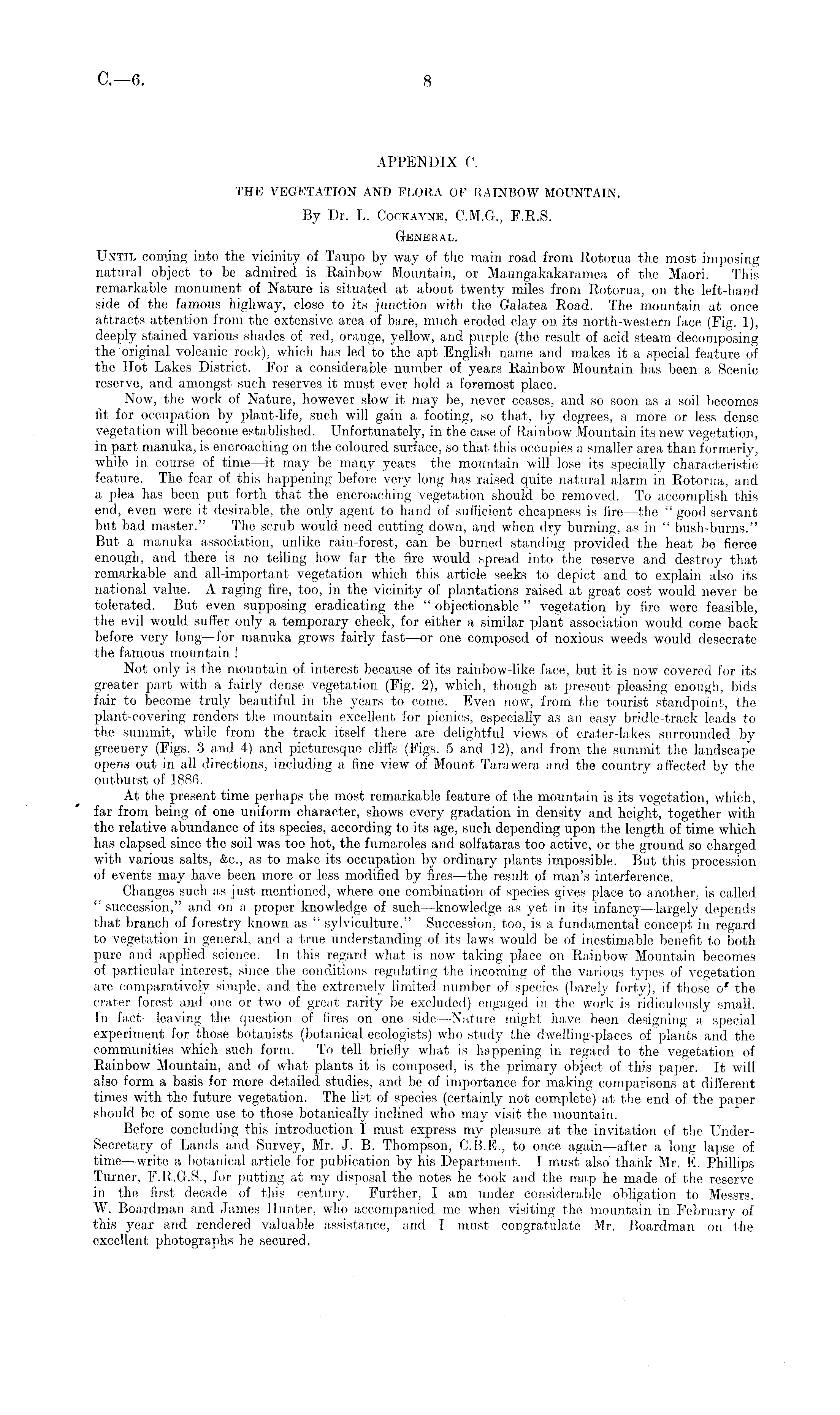 APPENDIX C. THE VEGETATION AND FLORA OF RAINBOW MOUNTAIN. By Dr. L. Cockayne, C.M.G., F.R.S. General. Until coming into the vicinity of Taupo by way of the main road from Rotorua the most imposing natural object to be admired is Rainbow Mountain, or Maungakakaramea of the Maori. This remarkable monument of Nature is situated at about twenty miles from Rotorua, on the left-hand side of the famous highway, close to its junction with the Galatea Road. The mountain at once attracts attention from the extensive area of bare, much eroded clay on its north-western face (Fig. 1), deeply stained various shades of red, orange, yellow, and purple (the result of acid steam decomposing the original volcanic rock), which has led to the apt English name and makes it a special feature of the Hot Lakes District. For a considerable number of years Rainbow Mountain has been a Scenic reserve, and amongst such reserves it must ever hold a foremost place. Now, the work of Nature, however slow it may be, never ceases, and so soon as a soil becomes lit for occupation by plant-life, such will gain a footing, so that, by degrees, a more or less dense vegetation will become established. Unfortunately, in the case of Rainbow Mountain its new vegetation, in part manuka, is encroaching on the coloured surface, so that this occupies a smaller area than formerly, while in course of time—it may be many years —the mountain will lose its specially characteristic feature. The fear of this happening before very long has raised quite natural alarm in Rotorua, and a plea has been put forth that the encroaching vegetation should be removed. To accomplish this end, even were it desirable, the only agent to hand of sufficient cheapness is fire—the " good servant but bad master." The scrub would need cutting down, and when dry burning, as in " bush-burns." But a manuka association, unlike rain-forest, can be burned standing provided the heat be fierce enough, and there is no telling how far the fire would spread into the reserve and destroy that remarkable and all-important vegetation which this article seeks to depict and to explain also its national value. A raging fire, too, in the vicinity of plantations raised at great cost would never be tolerated. But even supposing eradicating the " objectionable " vegetation by fire were feasible, the evil would suffer only a temporary check, for either a similar plant association would come back before very long—for manuka grows fairly fast —or one composed of noxious weeds would desecrate the famous mountain ! Not only is the mountain of interest because of its rainbow-like face, but it is now covered for its greater part with a fairly dense vegetation (Fig. 2), which, though at present pleasing enough, bids fair to become truly beautiful in the years to come. Even now, from the tourist standpoint, the plant-covering renders the mountain excellent for picnics, especially as an easy bridle-track leads to the summit, while from the track itself there are delightful views of crater-lakes surrounded by greenery (Figs. 3 and 4) and picturesque cliffs (Figs. 5 and 12), and from the summit the landscape opens out in all directions, including a fine view of Mount Tarawera and the country affected by the outburst of 1886. At the present time perhaps the most remarkable feature of the mountain is its vegetation, which, far from being of one uniform character, shows every gradation in density and height, together with the relative abundance of its species, according to its age, such depending upon the length of time which has elapsed since the soil was too hot, the fumaroles and solfataras too active, or the ground so charged with various salts, &c., as to make its occupation by ordinary plants impossible. But this procession of events may have been more or less modified by fires—the result of man's interference. Changes such as just mentioned, where one combination of species gives place to another, is called " succession," and on a proper knowledge of such—knowledge as yet in its infancy—largely depends that branch of forestry known as " sylviculture." Succession, too, is a fundamental concept in regard to vegetation in general, and a true understanding of its laws would be of inestimable benefit to both pure and applied science. In this regard what is now taking place on Rainbow Mountain becomes of particular interest, since the conditions regulating the incoming of the various types of vegetation are comparatively simple, and the extremely limited number of species (barely forty), if those of the crater forest and one or two of great rarity be excluded) engaged in the work is ridiculously small. In fact —leaving the question of fires on one side—Nature might have been designing a special experiment for those botanists (botanical ecologists) who study the dwelling-places of plants and the communities which such form. To tell briefly what is happening in regard to the vegetation of Rainbow Mountain, and of what plants it is composed, is the primary object of this paper. It will also form a basis for more detailed studies, and be of importance for making comparisons at different times with the future vegetation. The list of species (certainly not complete) at the end of the paper should be of some use to those botanicallv inclined who may visit the mountain. Before concluding this introduction I must express my pleasure at the invitation of the UnderSecretary of Lands and Survey, Mr. J. B. Thompson, C.8.E., to once again—after a long lapse of time—write a botanical article for publication by his Department. I must also' thank Mr. E. Phillips Turner, F.R.G.S., for putting at my disposal the notes he took and the map he made of the reserve in the first decade of this century. Further, I am under considerable obligation to Messrs. W. Boardman and James Hunter, who accompanied me when visiting the mountain in February of this year and rendered valuable assistance, and I must 