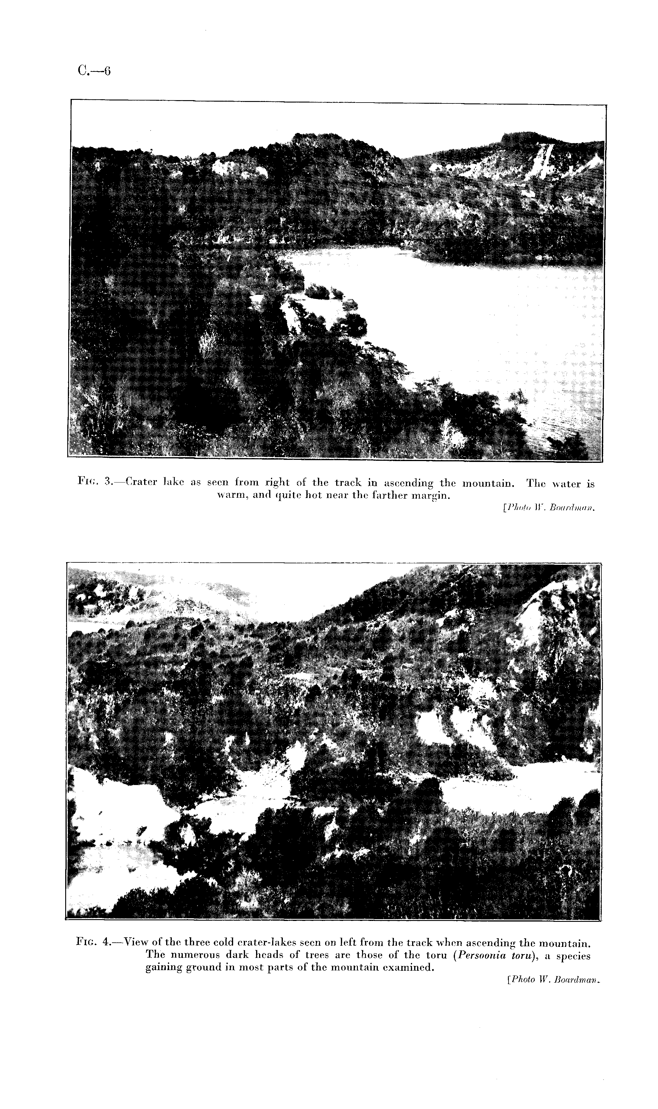 Fig. 4.—View of the three cold crater-lakes seen on left from the track when ascending the mountain. The numerous dark heads of trees are those of the toru (Persoonia toru), a species gaining ground in most parts of the mountain examined.