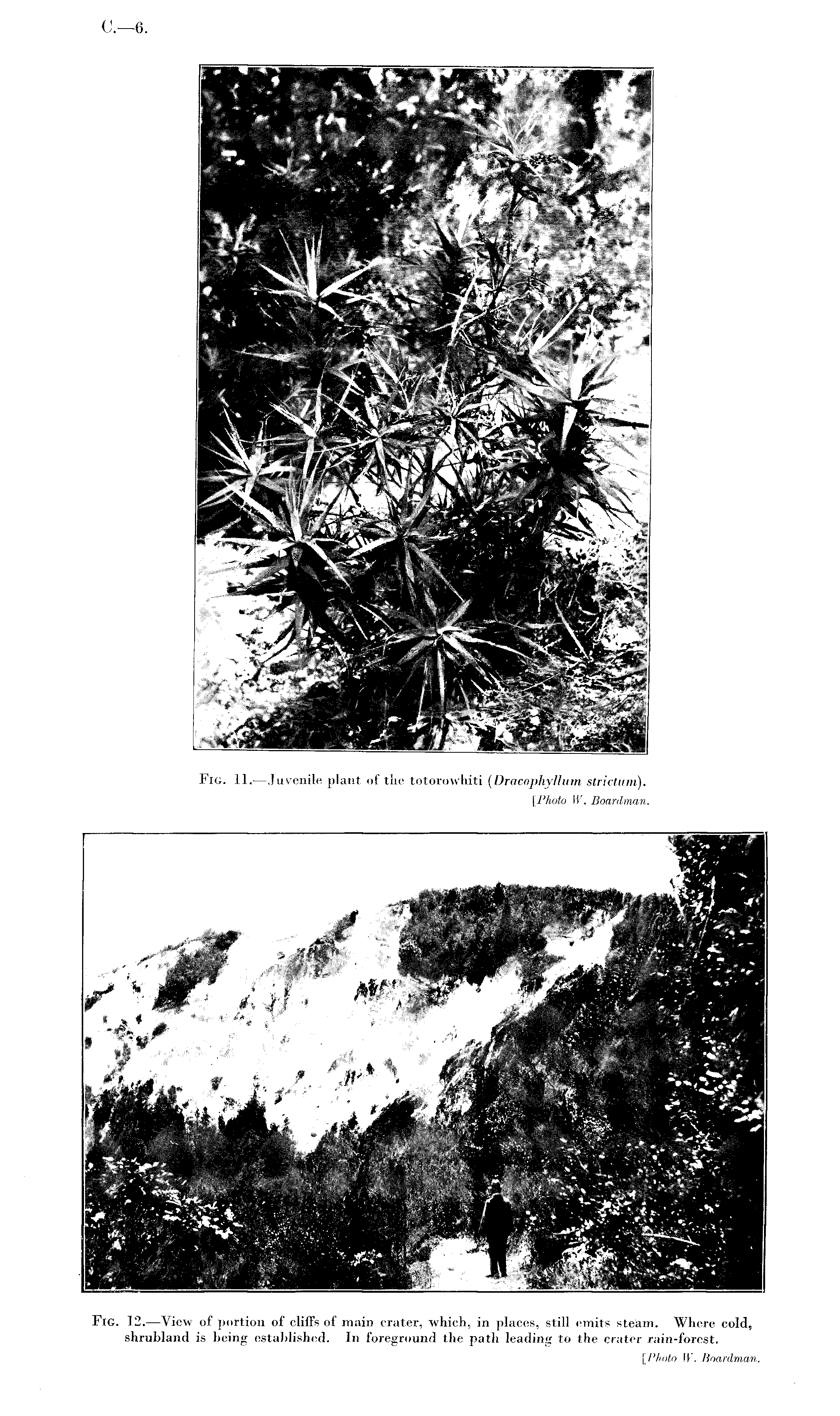 Fig. 12.—View of portion of cliffs of main crater, which, in places, still emits steam. Where cold, shrubland is being established. In foreground the path leading to the crater rain-forest.
